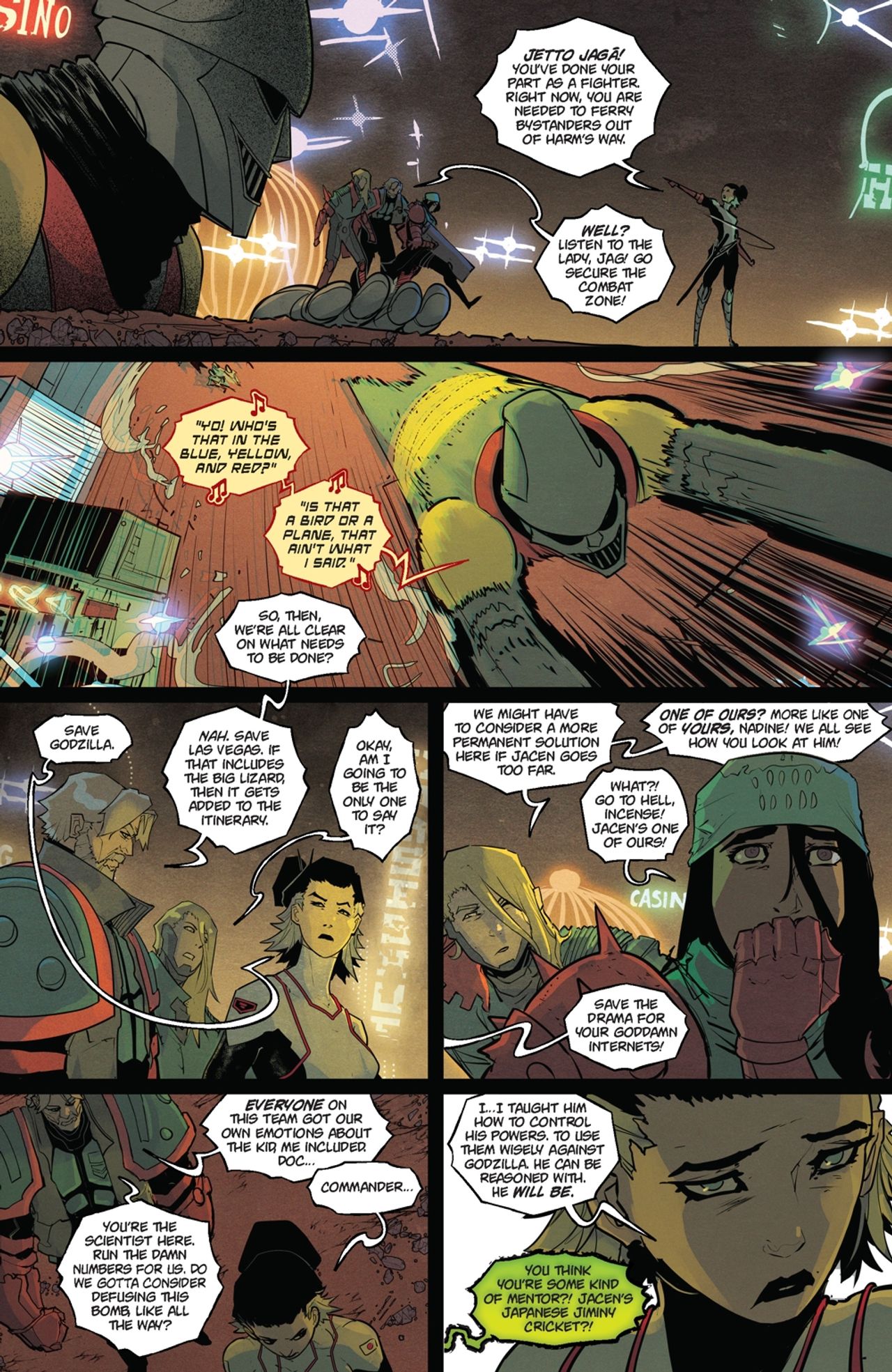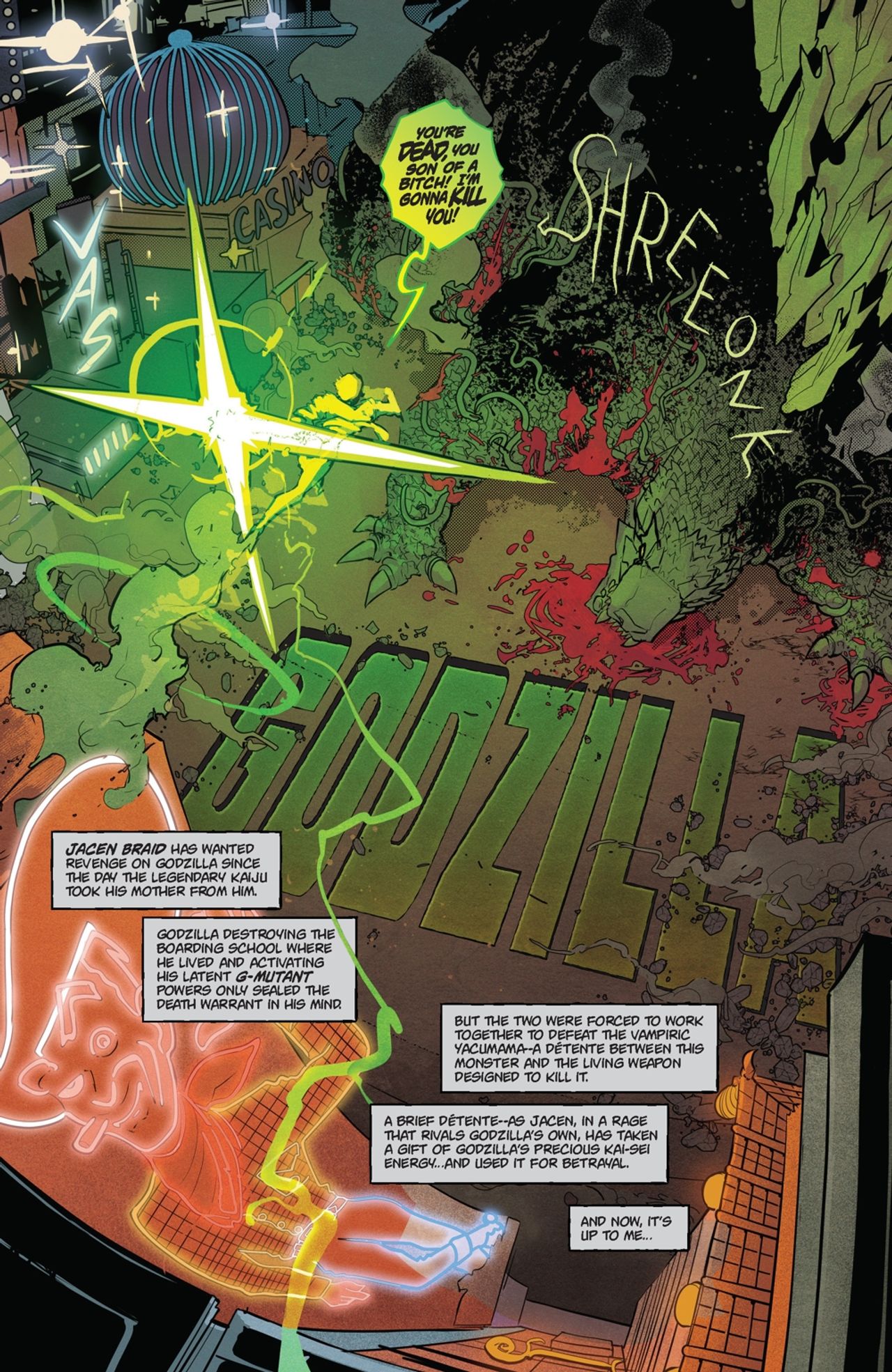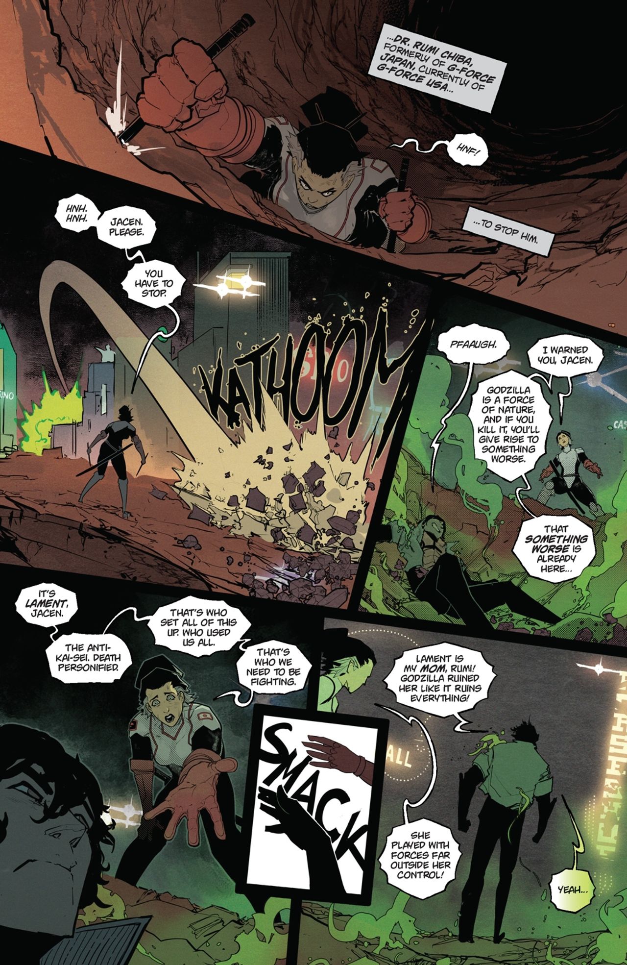 Godzilla is about to fight a teenager—and we promise you can’t guess how it will end. The first arc of the thrilling new Godzilla ongoing series comes to a close! G-Force has made contact with a talking kaiju who has big plans for the King of the Monsters…and Jacen, the boy with the power of Godzilla, will have to make a decision that affects the entire world. If you don’t order this issue now, you’ll be buying it for a premium later! The future of the Kai-Sei Era starts here!