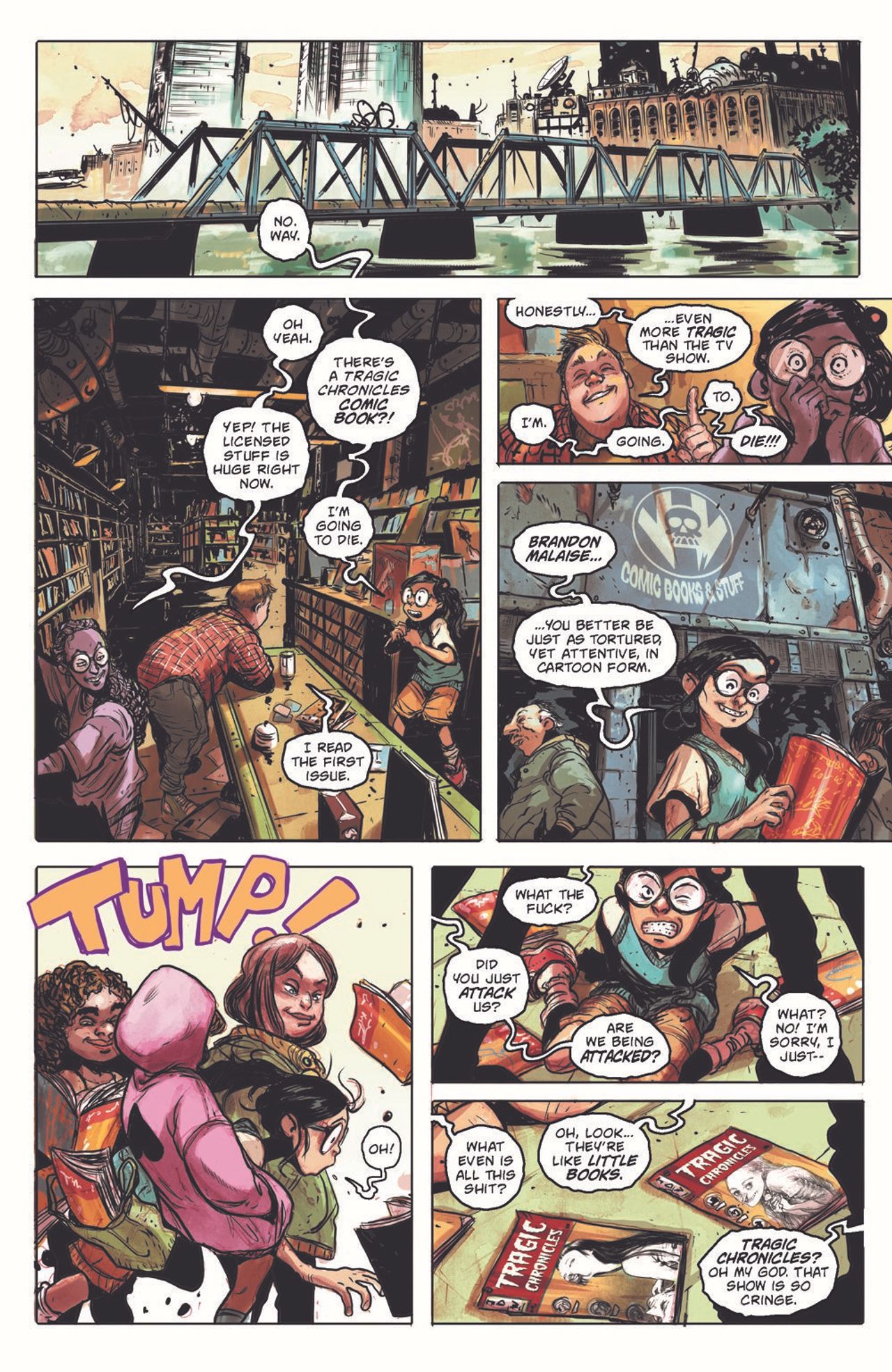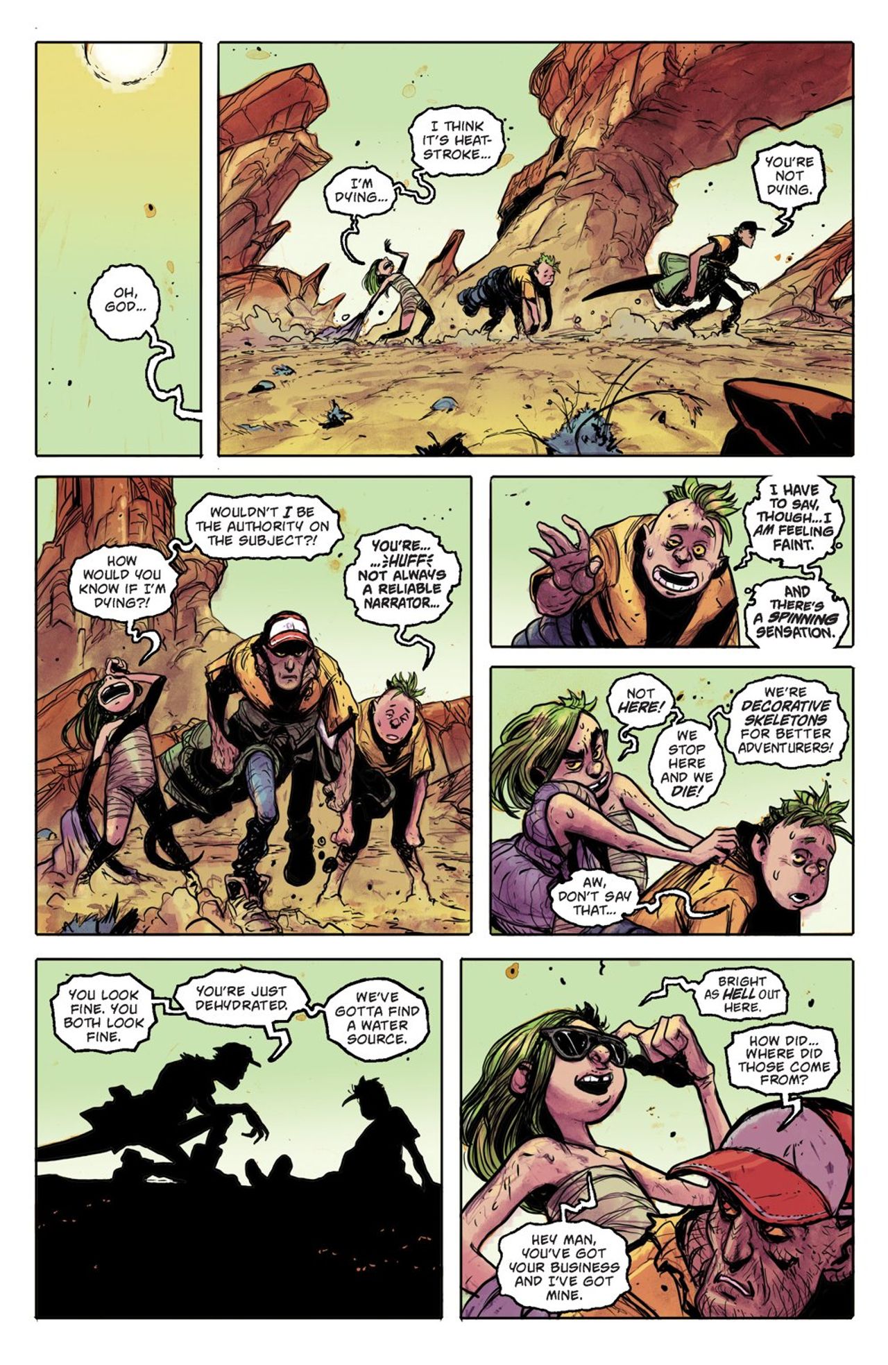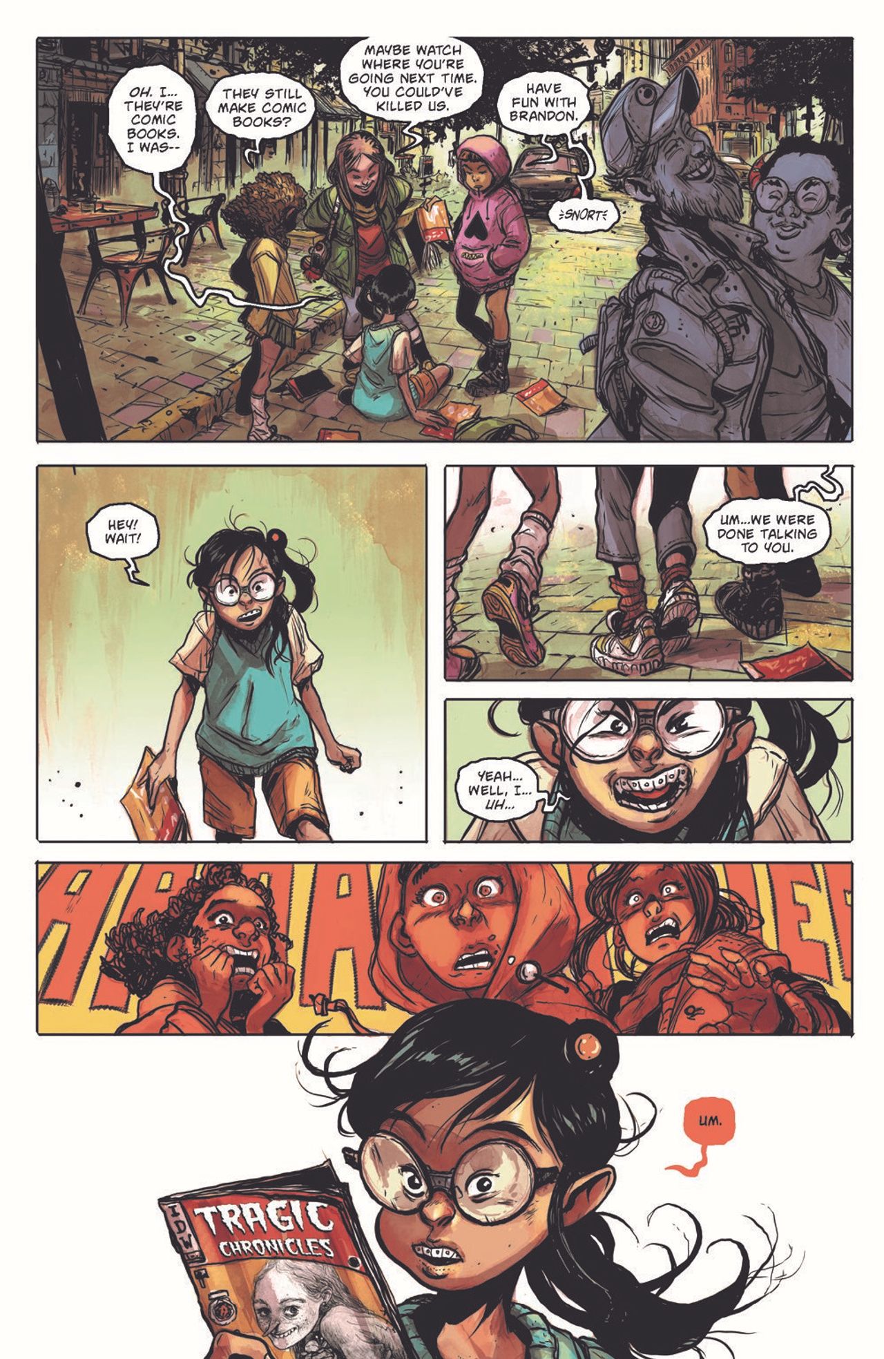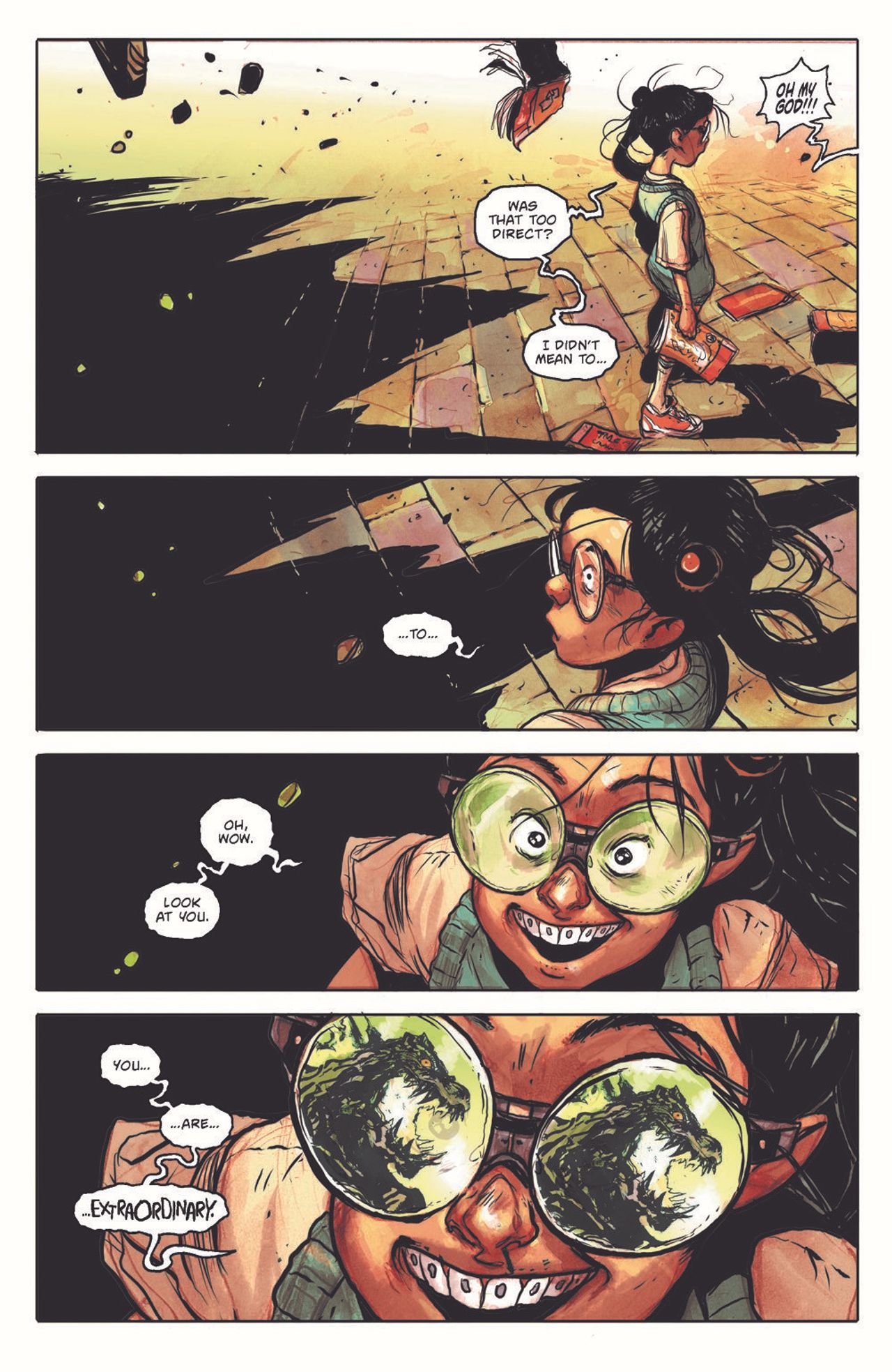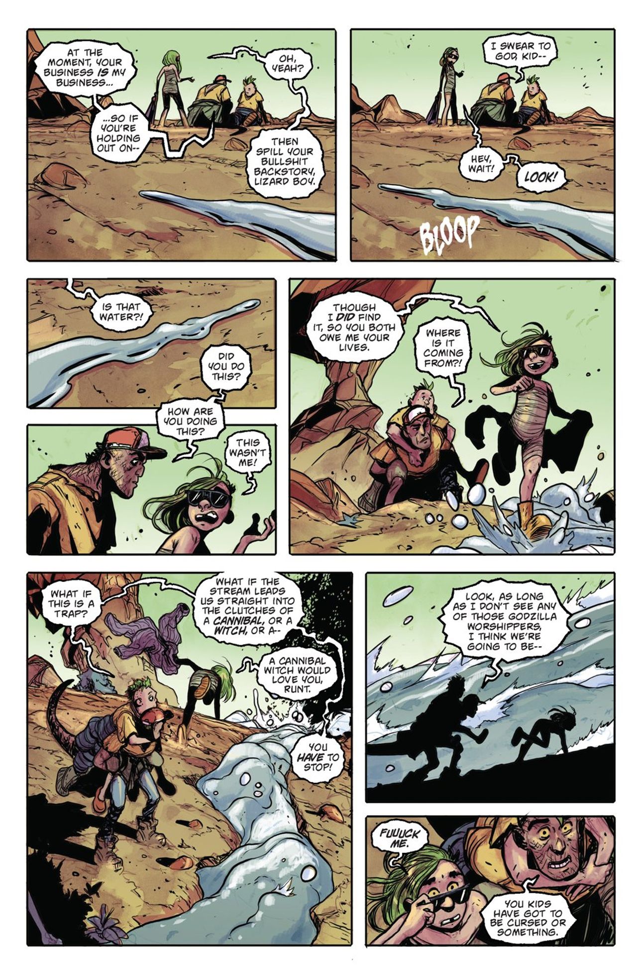 Enter the Deadzone! The mysterious kai-sei infected wasteland the government would have you believe is uninhabited…but do you believe that? The Wanderer—a half-man, half-kaiju hybrid—is just about the only being brave enough to travel across this strange world. But as of late, he's not traveling alone. He's discovered two children with the ability to control kaiju! In this issue, our traveling circus of freaks come across a 40-foot woman who's in love with the King of the Monsters! Can our crew help this heartbroken giantess?