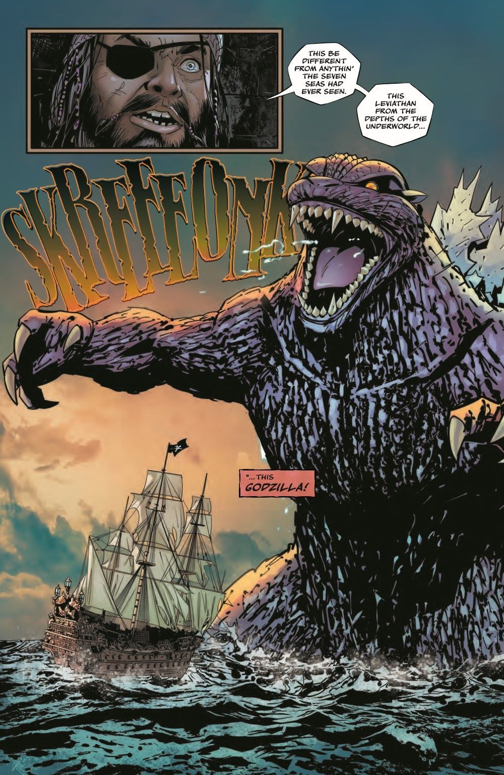 Sir Francis Drake and his crew have reached the edge of the world…and Godzilla lives there! Rather than fear this monstrous "dragon," however, the expedition's resident scoundrel Henry Hull sees opportunity. He believes that the pirate who was last in possession of a great treasure passed by the desert island that Godzilla seemingly protects, and what better place to hide a fortune than one guarded by a creature most would be too cowardly to go near. But Hull doesn't have time to plot his own expedition to liberate the treasure before the Spanish Armada arrives! Legends meet in this fantastical, historical tale from writer Frank Tieri (Absolute Carnage vs. Deadpool) and Inaki Miranda (We Live), the creative team behind Old Lady Harley!