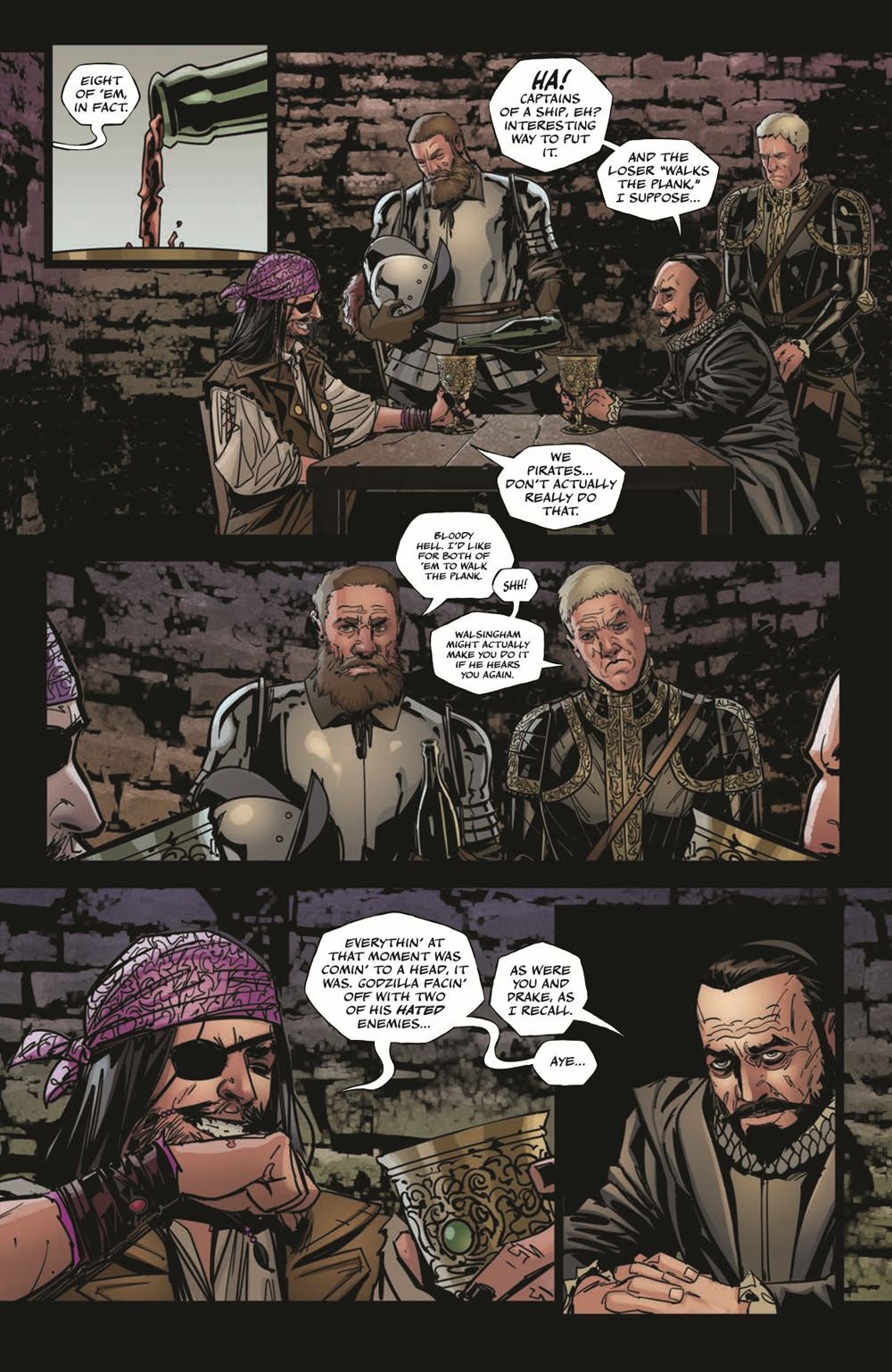 LAND HO! Our journey through the kaiju-infested, uncharted waters of history reaches its end, but not before Godzilla's fury is unleashed on Sir Francis Drake and all those who would encroach on Monster Island! Secrets are revealed, stretching from lowly pirate "One-Eyed" Henry Hull to the pinnacle of the British Empire, Queen Elizabeth herself!Dread pirate captain Frank Tieri (Absolute Carnage vs. Deadpool) and ship's cartographer Inaki Miranda (We Live), the crew behind Old Lady Harley, bring their epic voyage, one of the most unique Godzilla tales in recent memory, to its unbelievable conclusion!