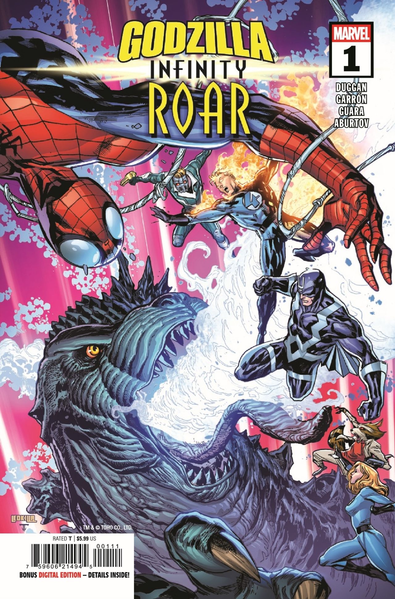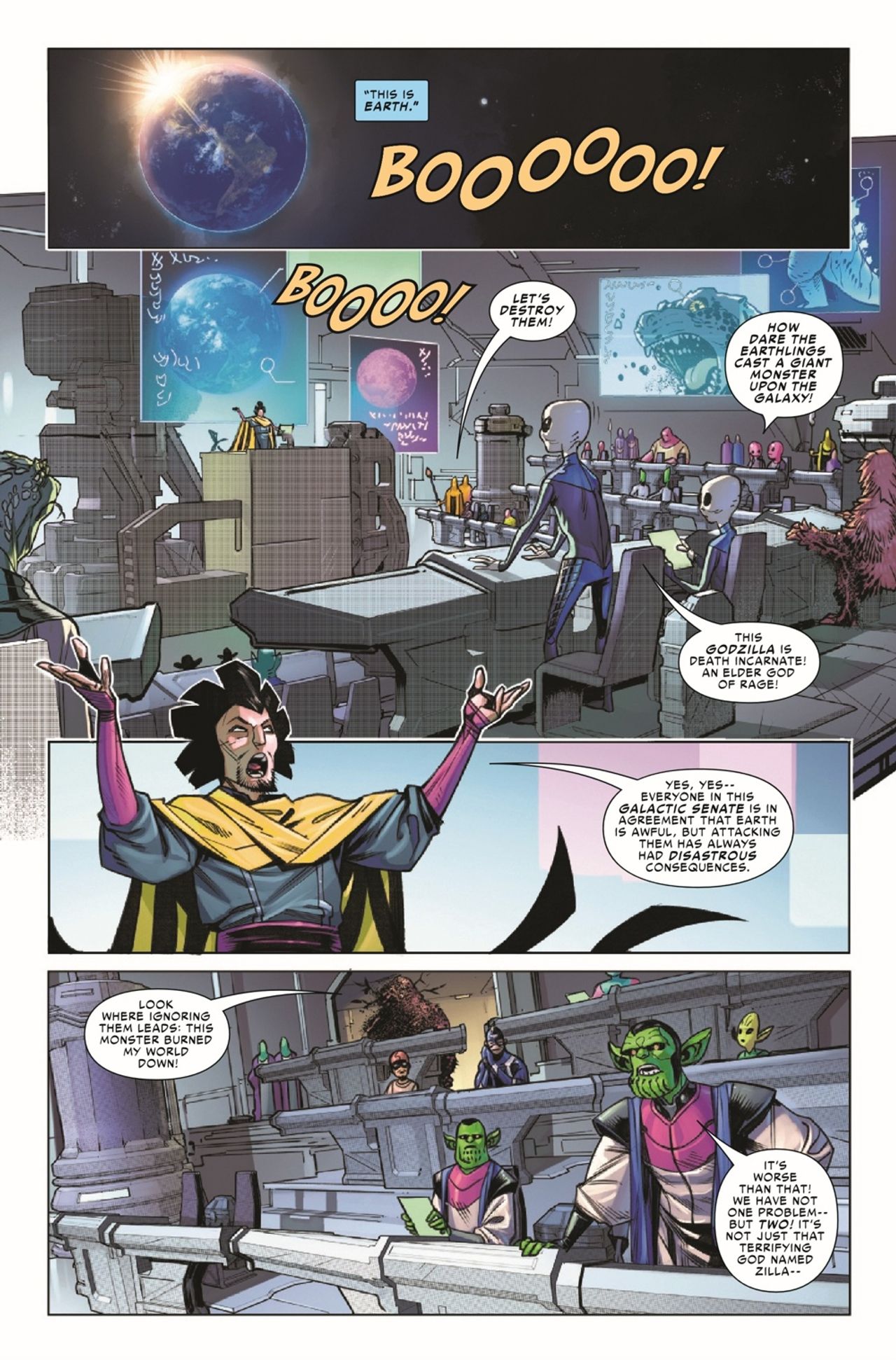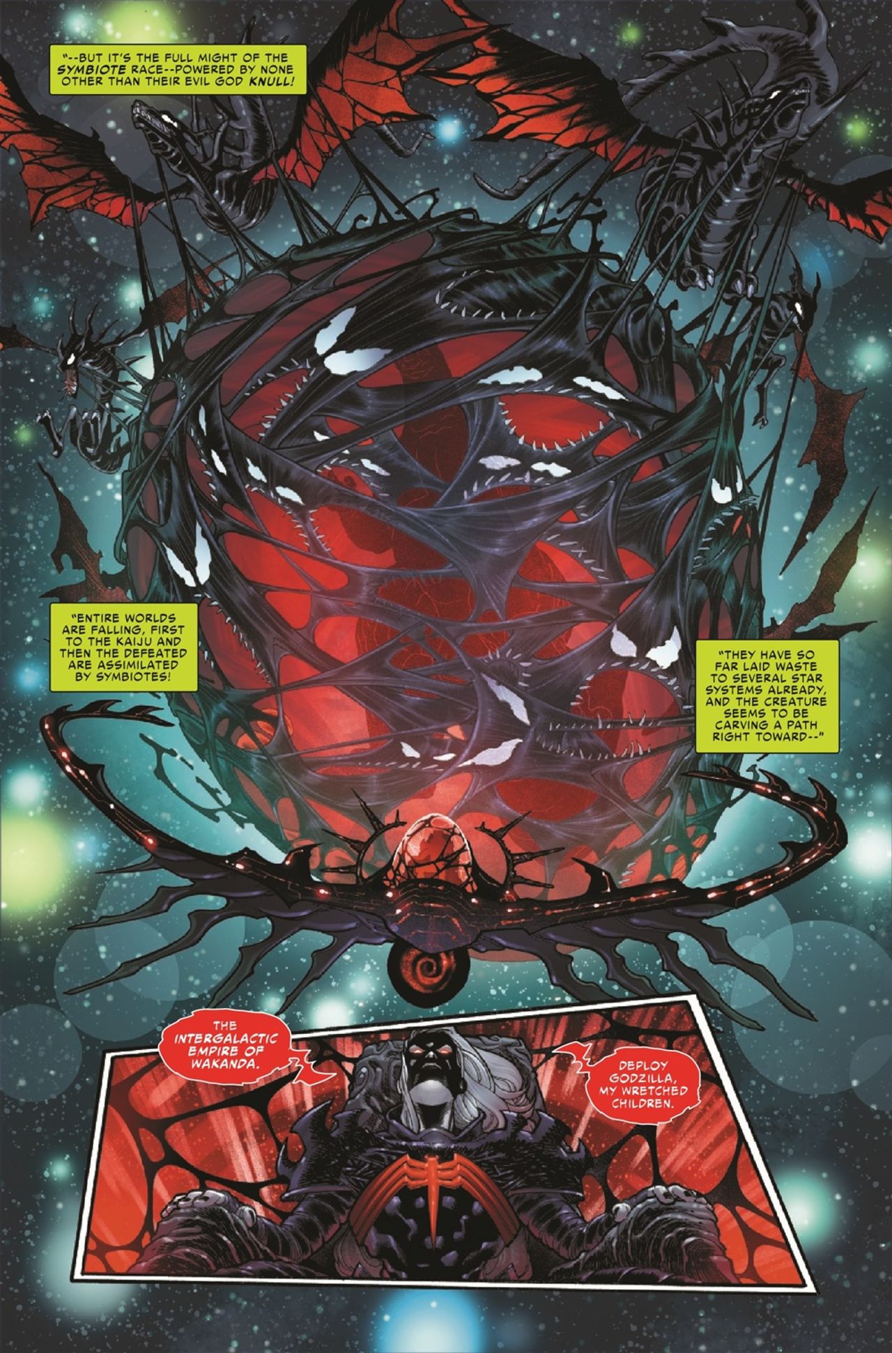 EARTH'S MIGHTIEST HEROES UNLEASH THE GALAXY'S DEADLIEST THREAT AS GODZILLA RAMPAGES ACROSS THE COSMOS! The combined forces of Earth's mightiest heroes managed to spare Earth by exiling Godzilla off into space...but in doing so may have just heralded the end of the larger galaxy! As Knull, the god of the symbiotes fans the flames of Godzilla's anger, a new campaign for galactic conquest begins with the King of the Monsters and the King in Black at the helm! Will the cosmos be able to band together to stop the two juggernauts, or will a new era of death and destruction descend upon the cosmos? One things for sure, from the Galactic Empire of Wakanda, Shi'ar Empires, Kree-Skrull space and beyond, no planet will be safe as Godzilla destroys the Marvel galaxy!