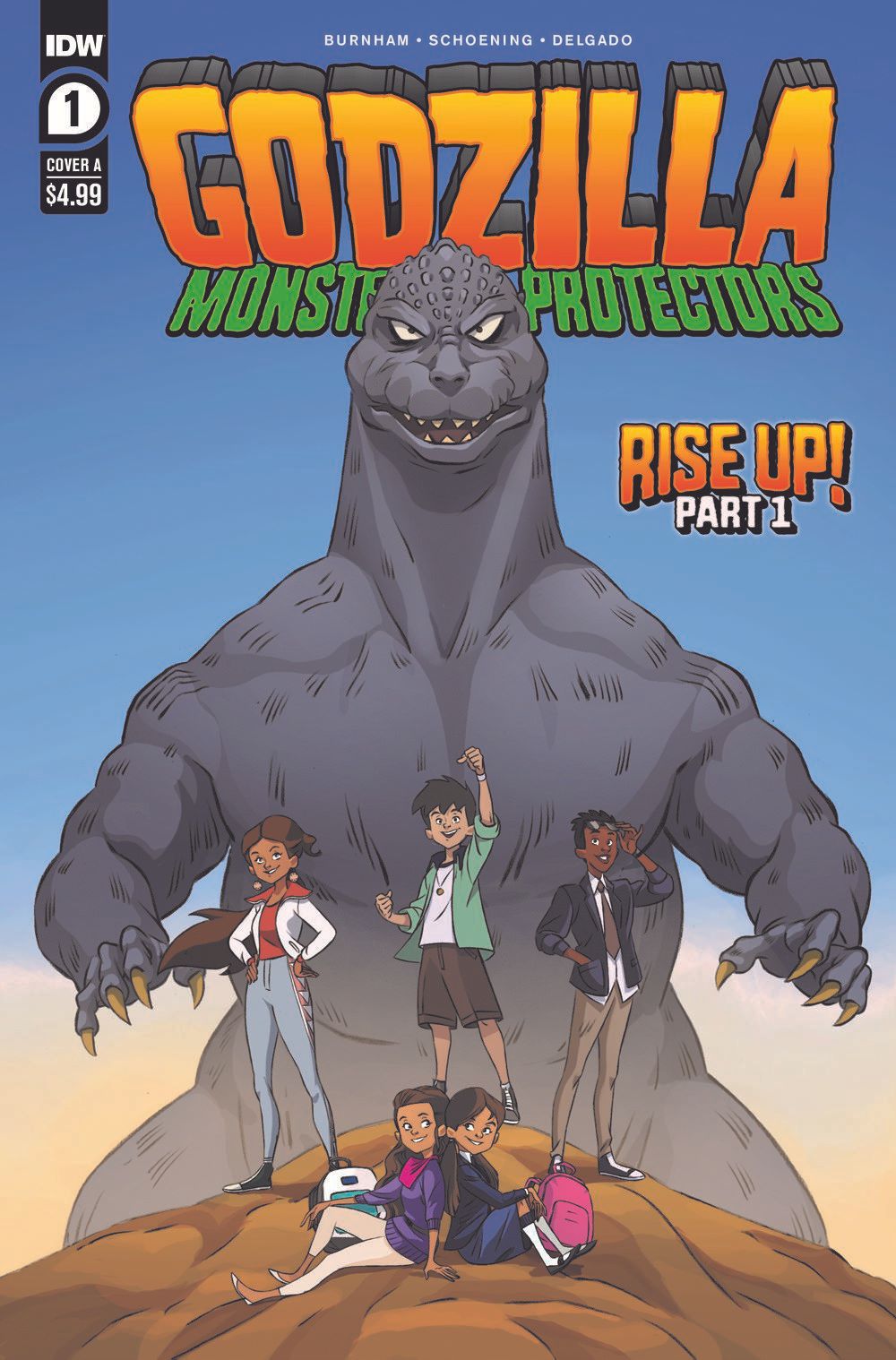 "Rise Up!" Part 1: When a coldly single-minded businessman uses an untested element to create clean energy for a profit, he inadvertently awakens the beast from the deep–Godzilla! Sensing the harm the new energy poses to the planet, Godzilla attacks the heart of the problem–humankind! It will be up to three intrepid middle-school students—with a little magic help from Infant Island—to show Godzilla that not all humans are bad… and that there is still hope for Planet Earth. Reuniting the blockbuster creative team of writer Erik Burnham, artist Dan Schoening, and colorist Luis Antonio Delgado (Ghostbusters), Godzilla: Monsters & Protectors promises to romp and stomp fans–old and new–of the greatest kaiju ever like never before!