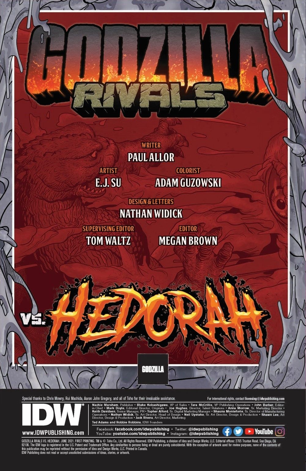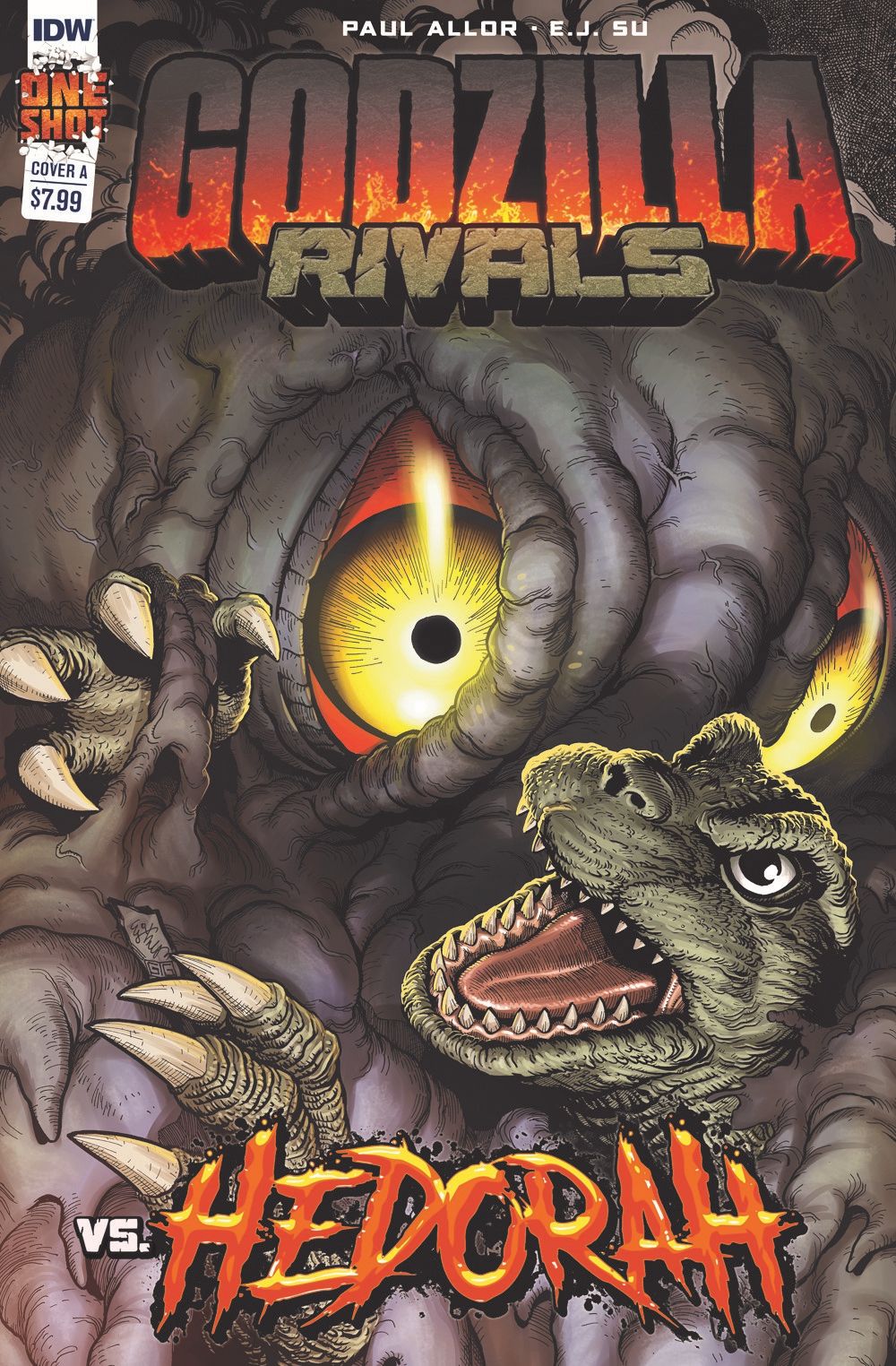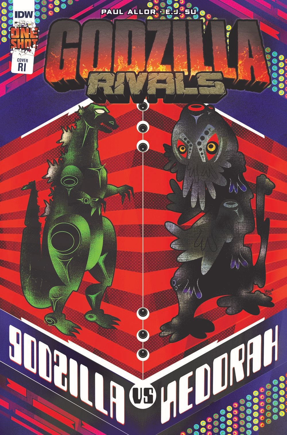 Writer Paul Allor (TMNT, G.I. Joe) and artist E.J. Su (Transformers, Godzilla: Legends) join forces to bring the premiere Godzilla Versus quarterly one-shot to life in explosively shocking fashion! And each stand-alone issue features special wrestling poster-themed retailer incentive variants by fan-favorite artist Jeffrey Veregge (Transformers, Judge Dredd).