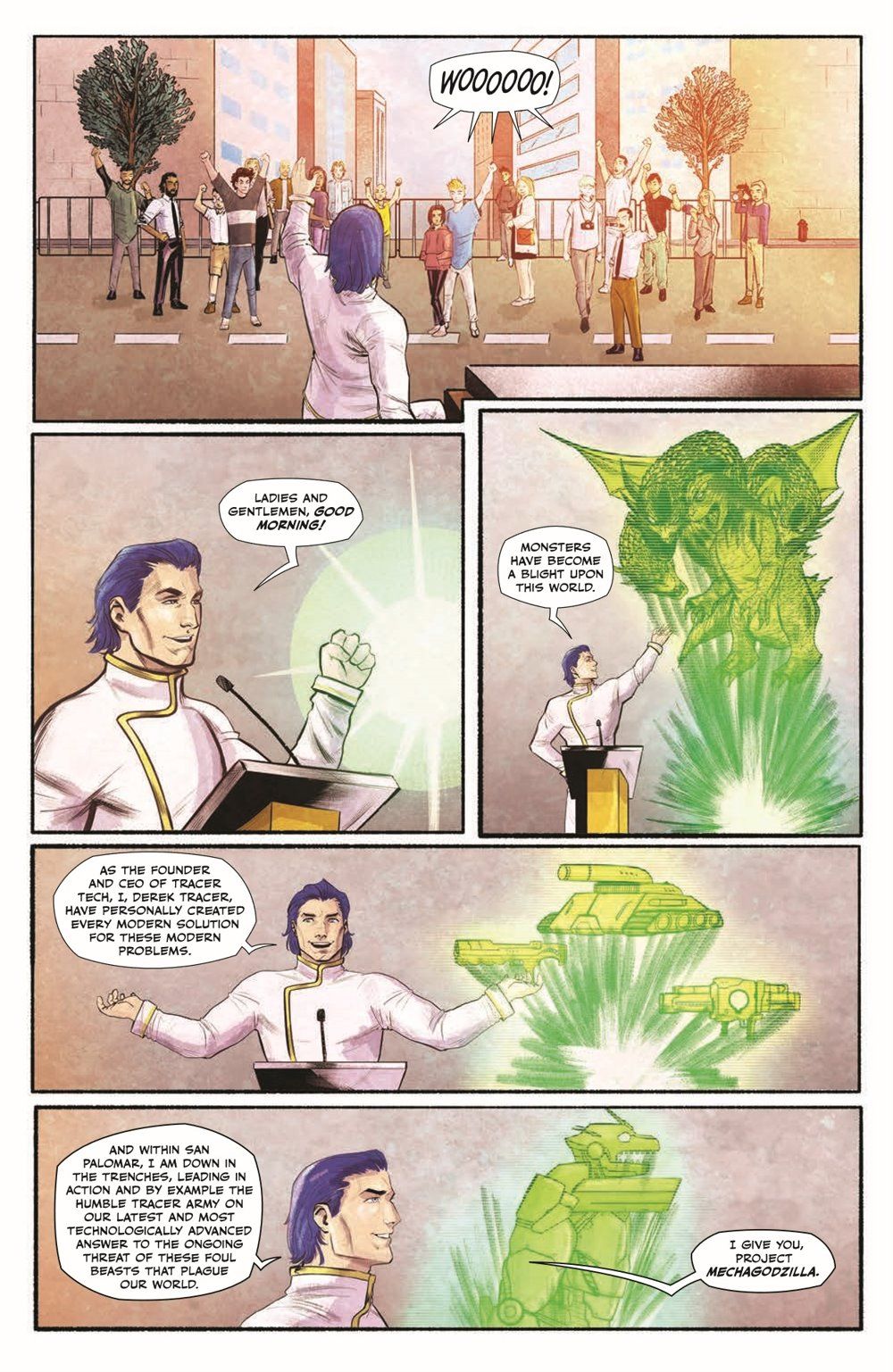 IS YOUR CITY BESIEGED BY KAIJU? DO YOU LIE AWAKE AT NIGHT ANXIOUSLY LISTENING FOR THE MONSTER SIRENS? HAVE YOU HAD ALL YOU CAN TAKE OF GIANT LIZARDS, MOTHS, PTERODACTYLS, AND SHRIMP? THEN CALL TRACER TECH TODAY! OUR STATE-OF-THE-ART ANTI-KAIJU TECHNOLOGY HAS ALLOWED DOZENS OF CITIES AROUND THE WORLD TO FEND OFF THE THREAT OF MONSTER ATTACK.San Palomar, California. It's a sleepy city with not much going on. That is, until Tracer Tech built their new corporate headquarters there, displacing lifelong citizens and forcing out local businesses. But what is the source of Tracer's amazing, almost alien technology, and why has it put San Palomar in Godzilla's sights? And what can a couple of local kids like Alex and Jaz do to protect their city when the King of the Monsters and its robot doppelgänger clash?