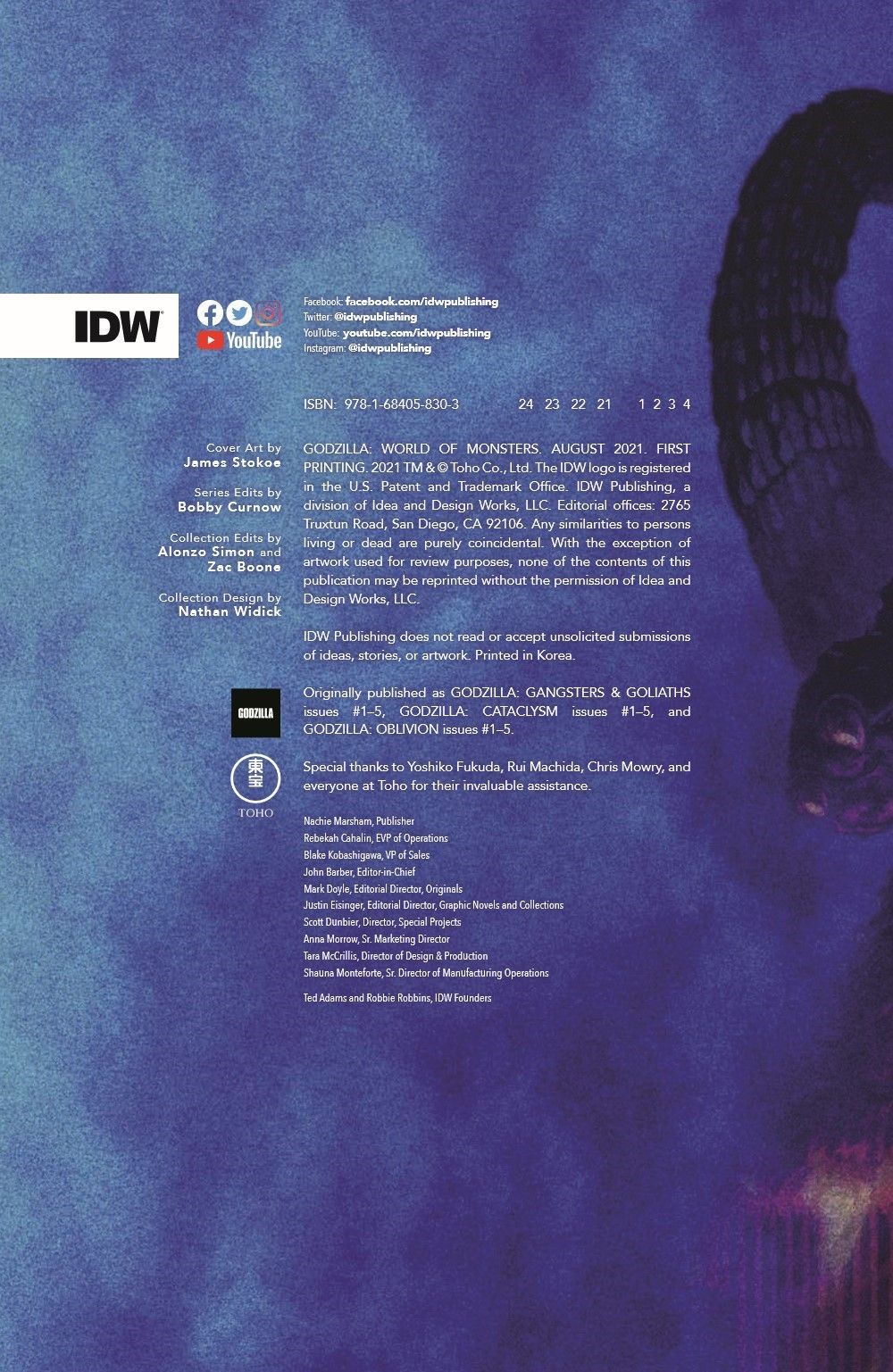 First, in Gangsters & Goliaths, monster recognizes monster, which quickly becomes obvious when Godzilla collides head on with the Yakuza-dominated Tokyo underworld. In Cataclysm, does any hope remain for humanity in an apocalyptic future devastated by never-ending kaiju attacks? And, when a reckless scientist opens a portal to an alternate dimension ruled by Godzilla and his brethren, a single baby kaiju stowaway could spell disaster for our monster-free world, in Oblivion.