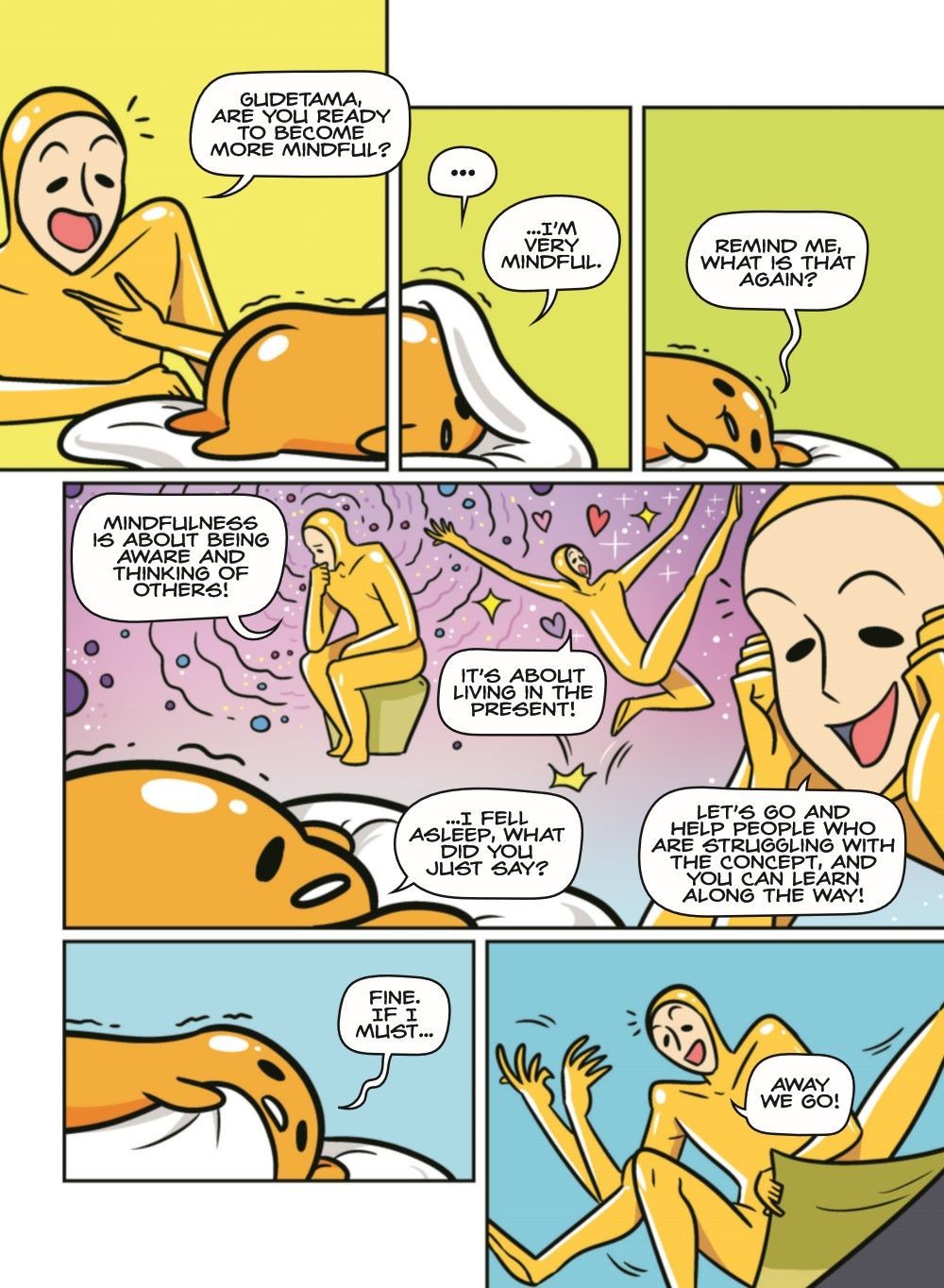 Empathizing with others, understanding your feelings, learning to be selfless: these all sound like really hard things to do! Well, fear not: Come along with Gudetama, who'll guide your way to learning things and more. Living selflessly is something many struggle with. Don't worry, Gudetama does too, and wants to join you on your journey in finding the wonders of mindfulness.