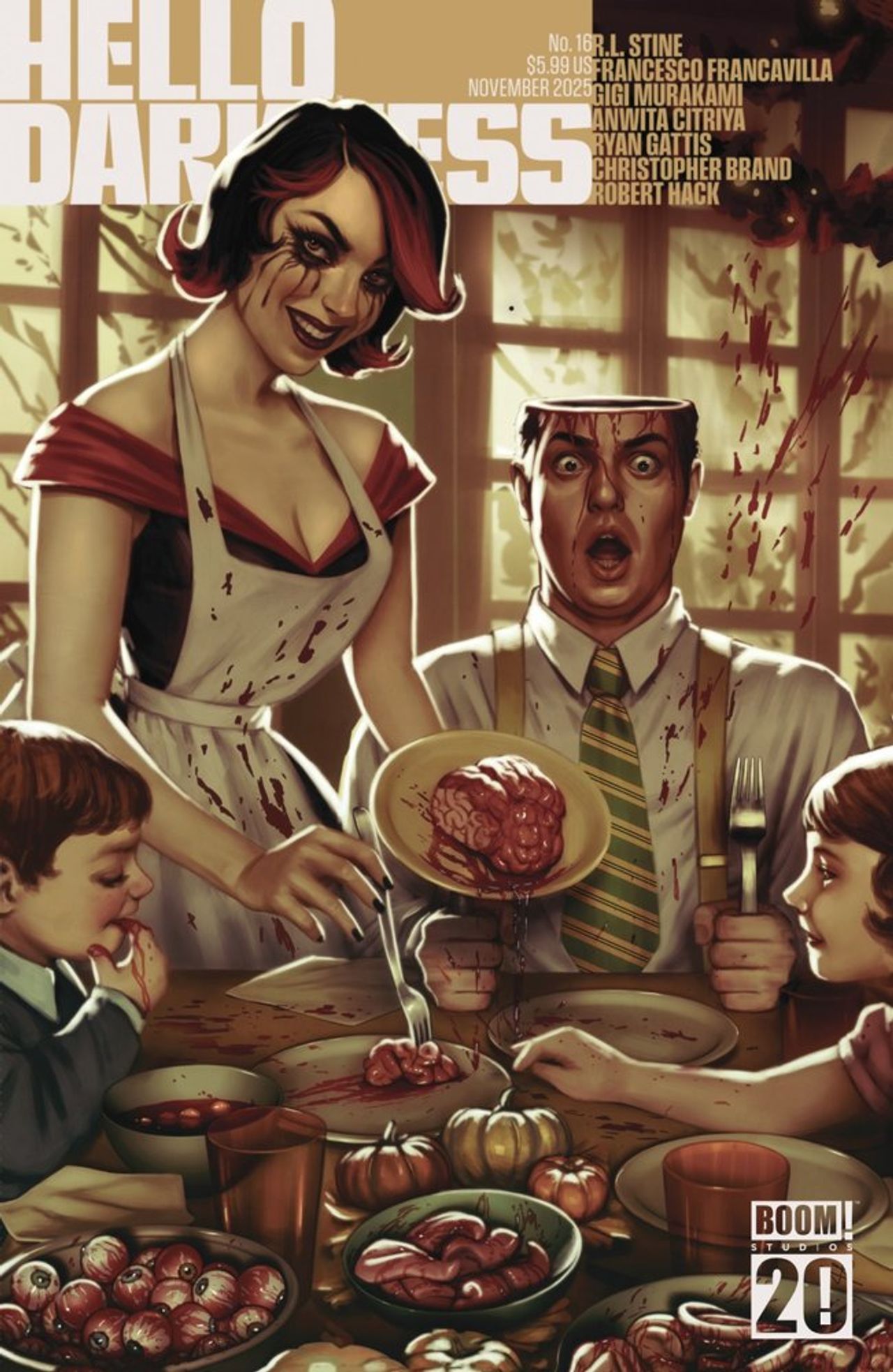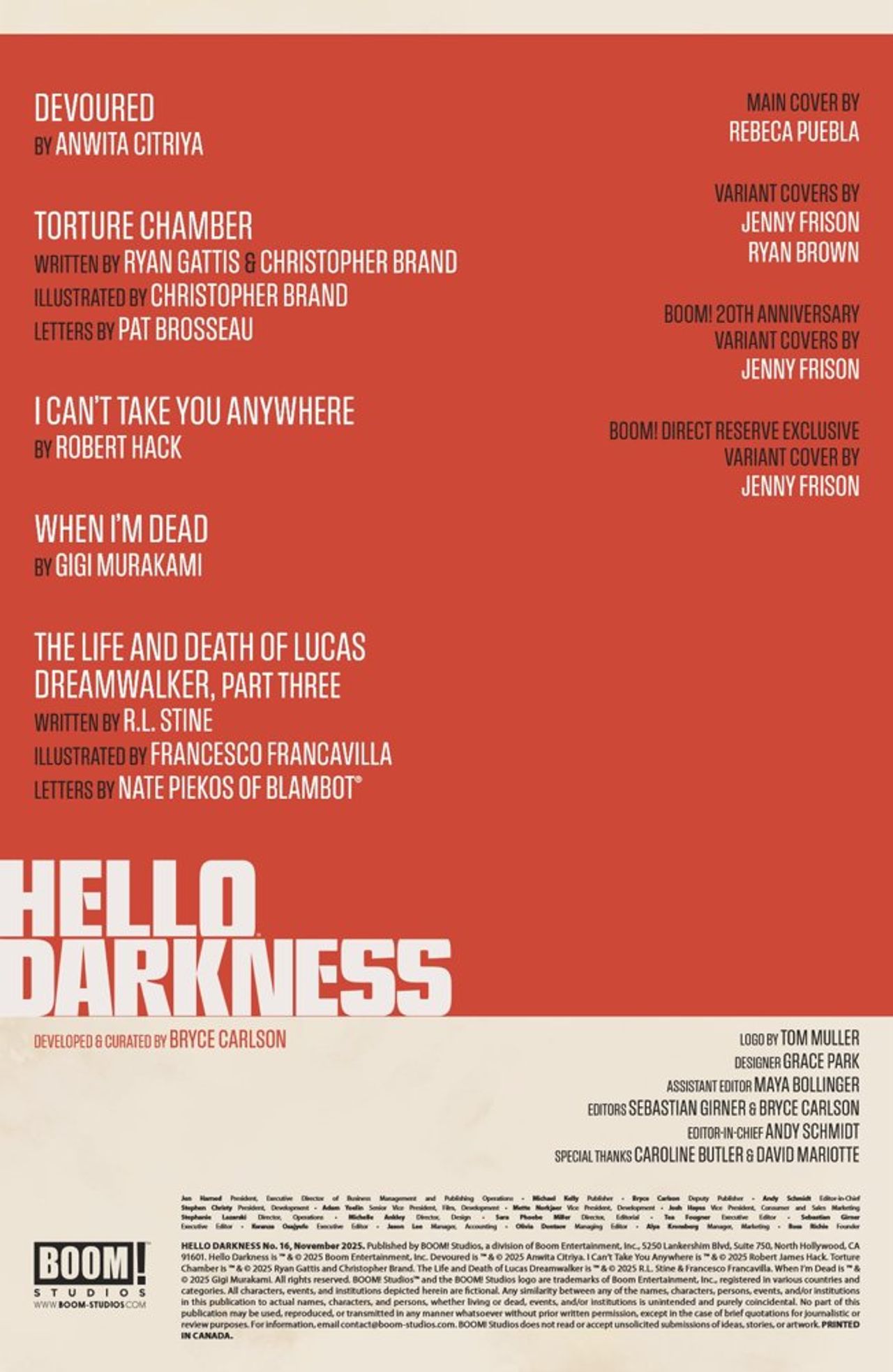 Your favorite monthly horror showcase continues with a new wave of (spectral) nightmares! In this issue of the acclaimed anthology, horror legends R.L. Stine and Francesco Francavilla bring their haunting tale "The Life and Death of Lucas Dreamwalker" to a gripping conclusion! In a chilling story by Jude Ellison S. Doyle and Rocky OBK, the once-idyllic town of "Abadon" becomes a home to an unknown terror. Then, Gigi Murakami warns against all work and no play in "When I'm Dead," and Robert Hack returns with more of his wickedly offbeat "I Can't Take You Anywhere."