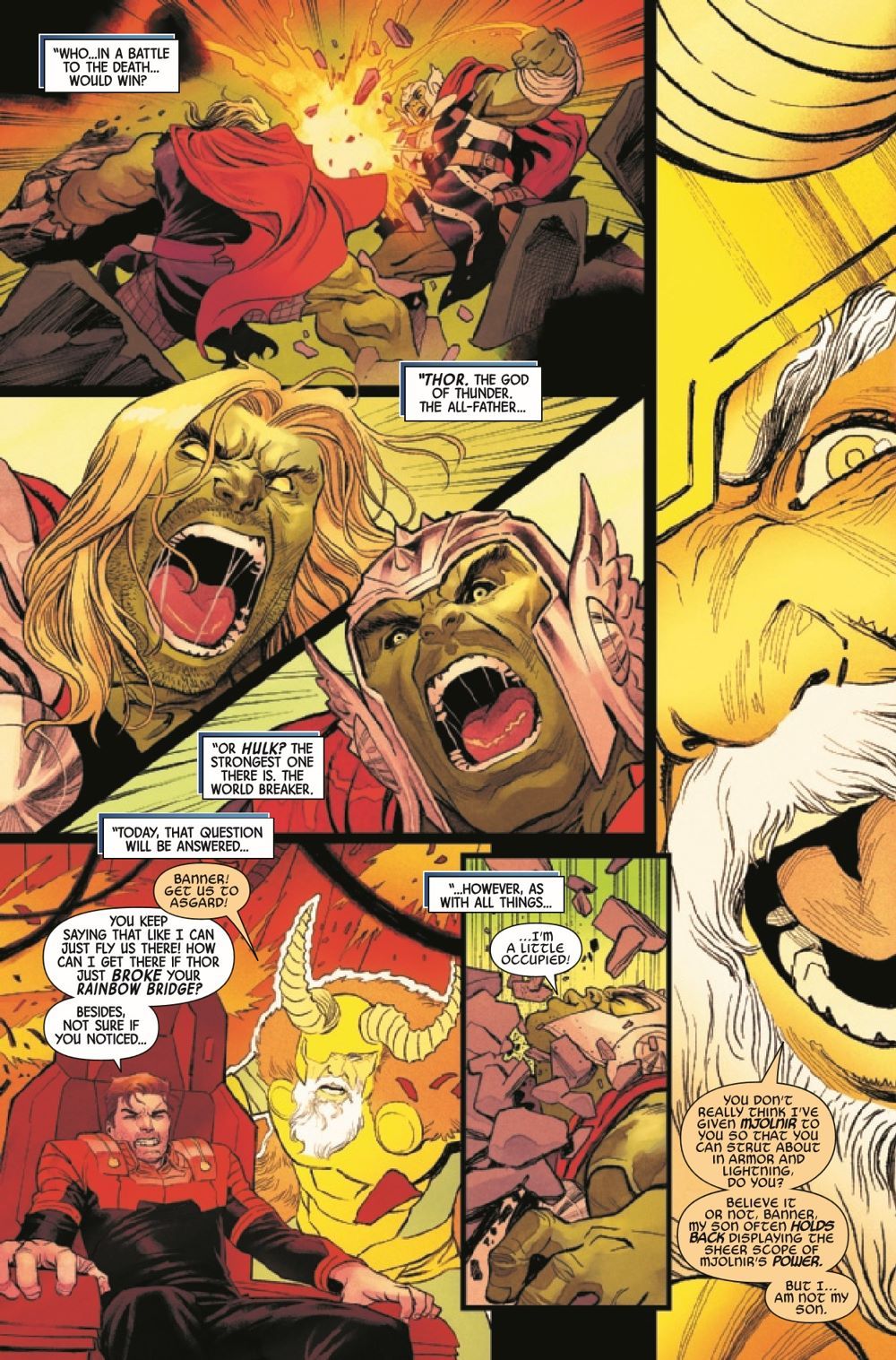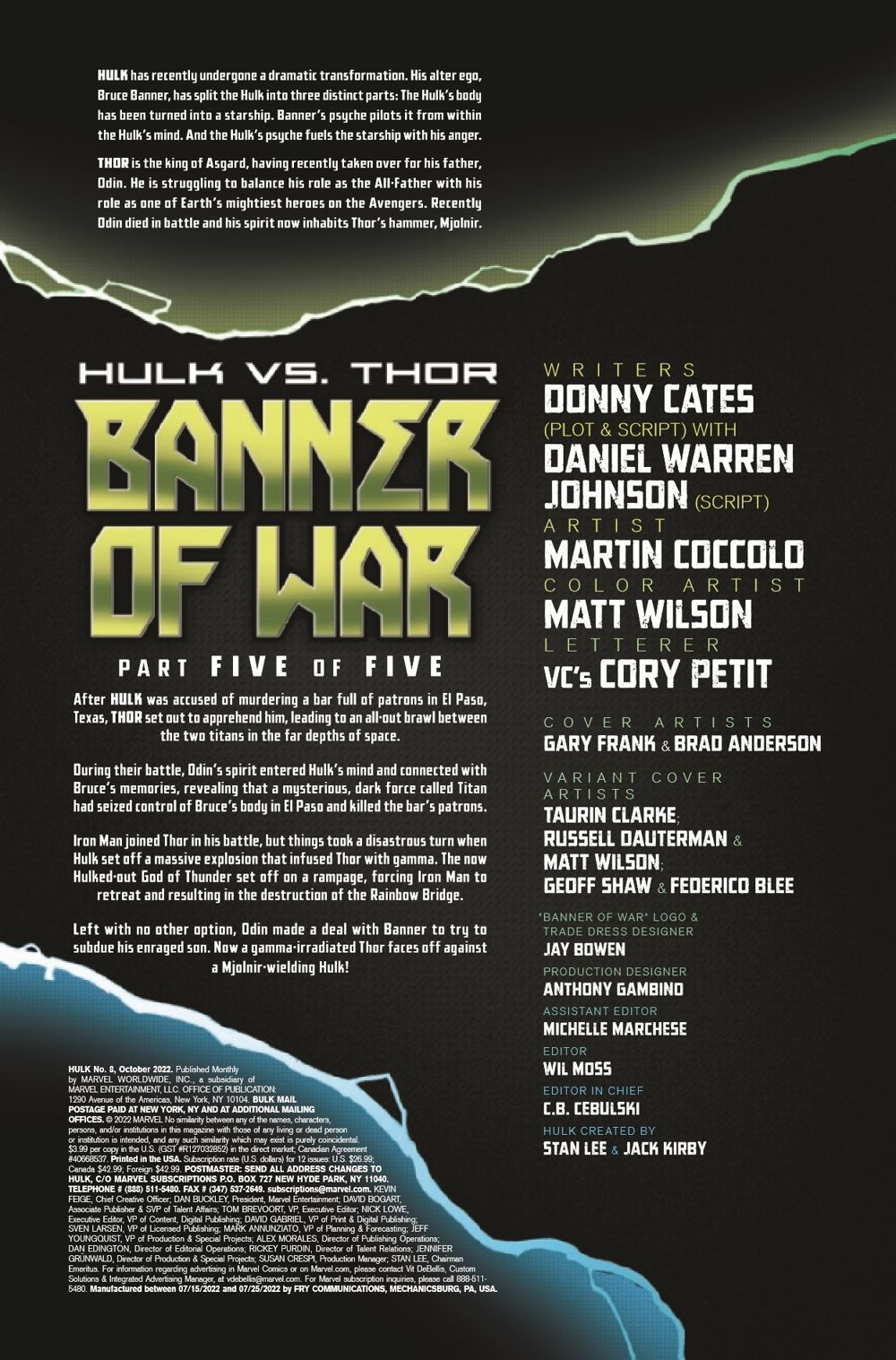"BANNER OF WAR" FINALE The time for victory has come! In the final installment of the epic crossover between the HULK and THOR series, Marvel's two heaviest hitters expend their rage on one final, brutal brawl that will answer once and for all which of these heroes is the strongest. But in a fight between gods, monsters and men, what becomes of the victor? The loser? And who really has the authority to decide? Revelations about Hulk's past and choices Thor makes about the future will shake the Marvel Universe to its very core!