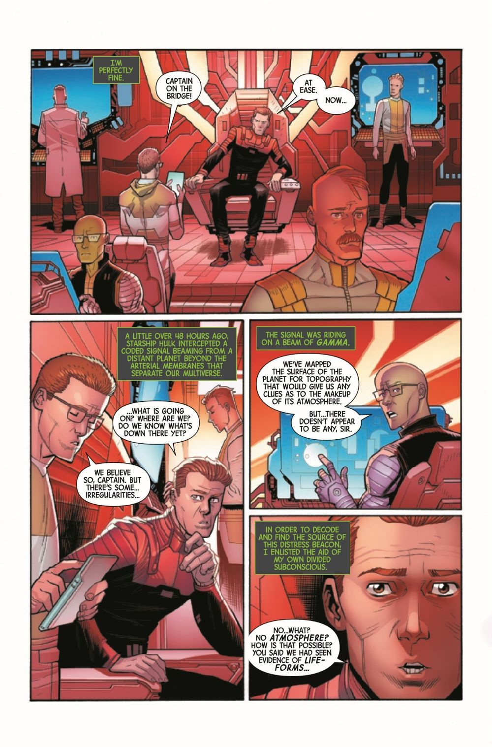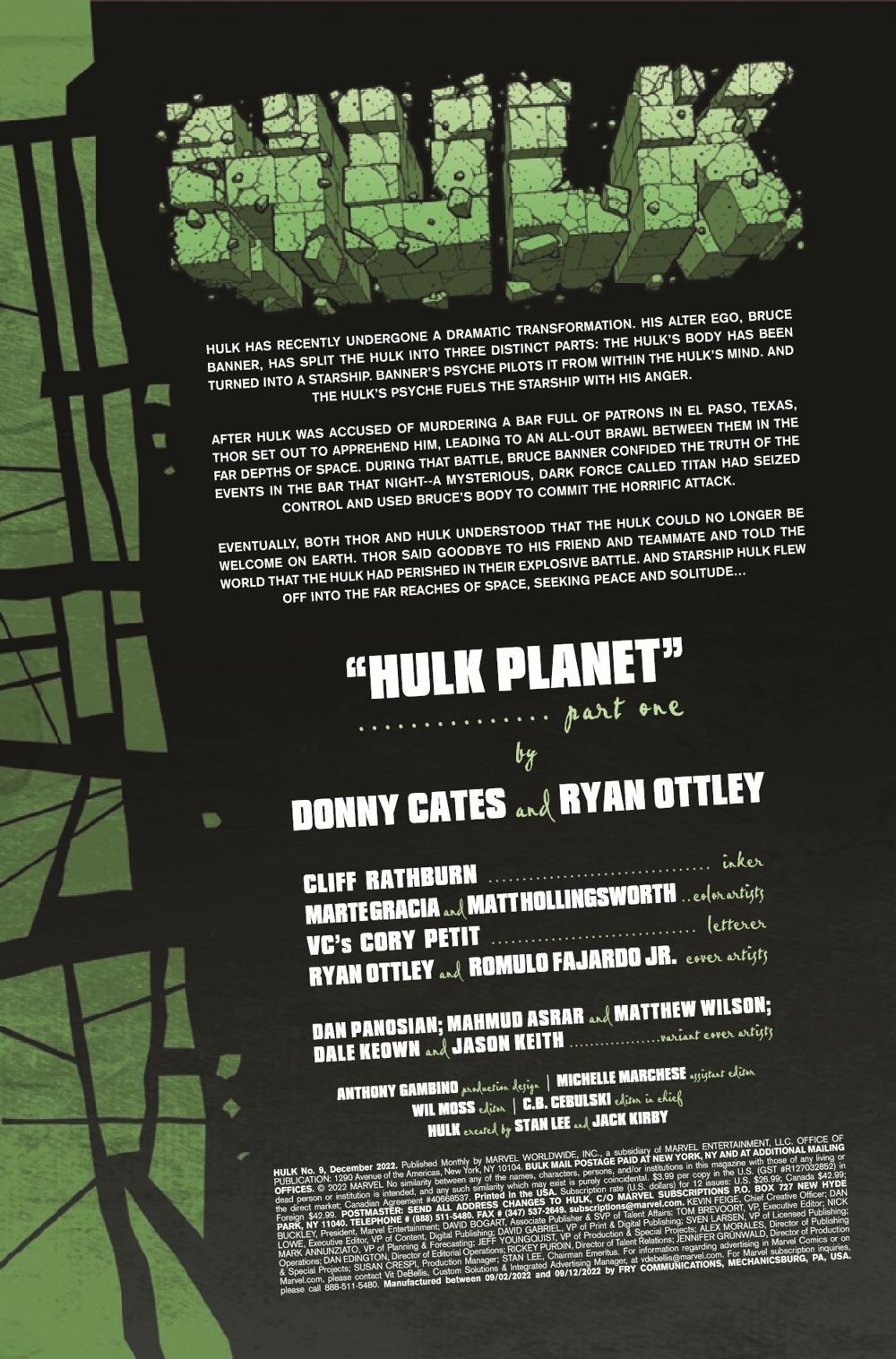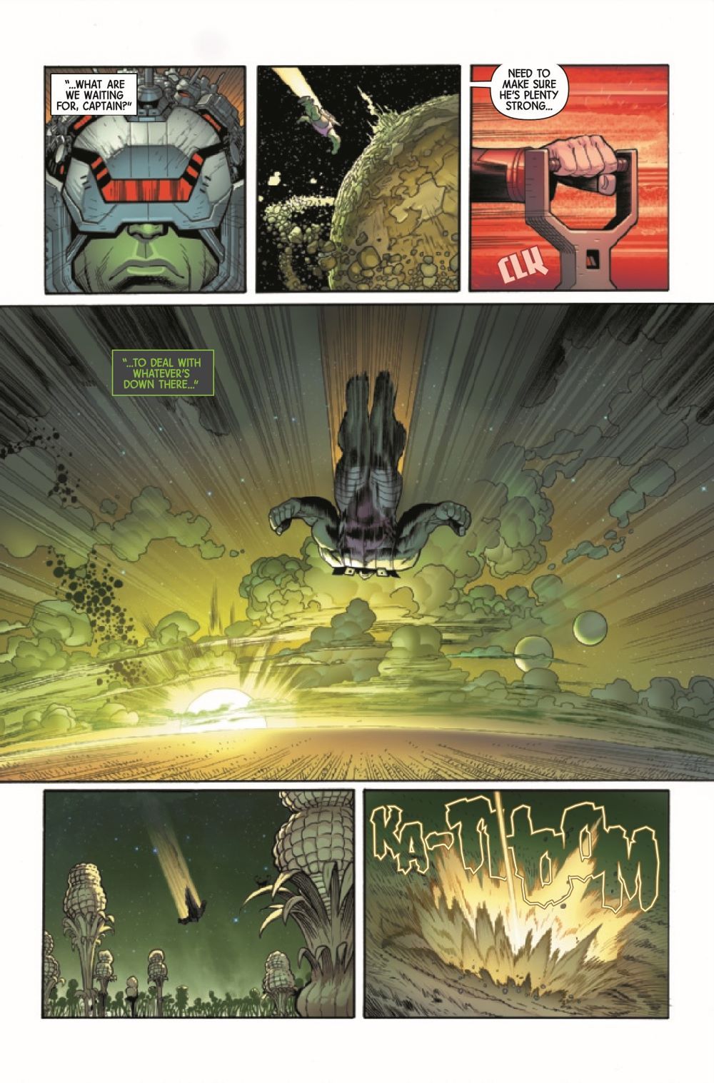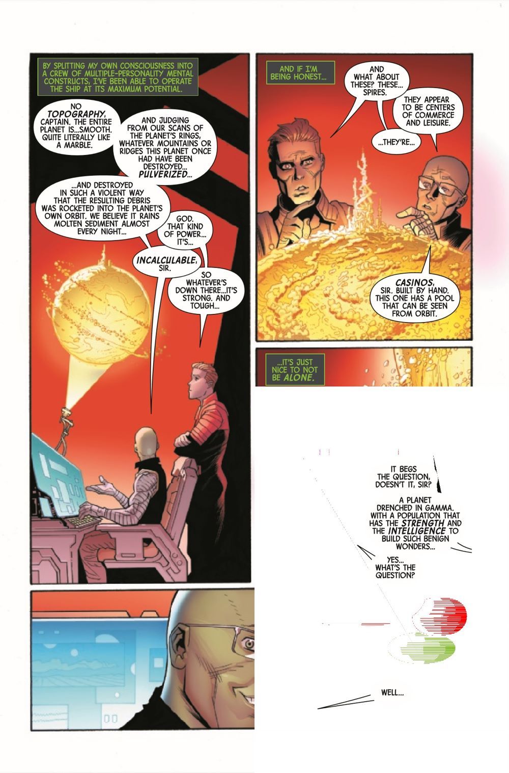 New Arc - HULK PLANET! Thoroughly shaken by his battle with Thor and Titan's impact on his friends, Bruce Banner decides that his best company is himself - and only himself. As he sets Starship Hulk on a far away course, he begins to reckon with what it means to be healthy - and encounters an alternative to isolation he'd never thought to dream of. But this alternative begs the question - who exactly is Monolith?
