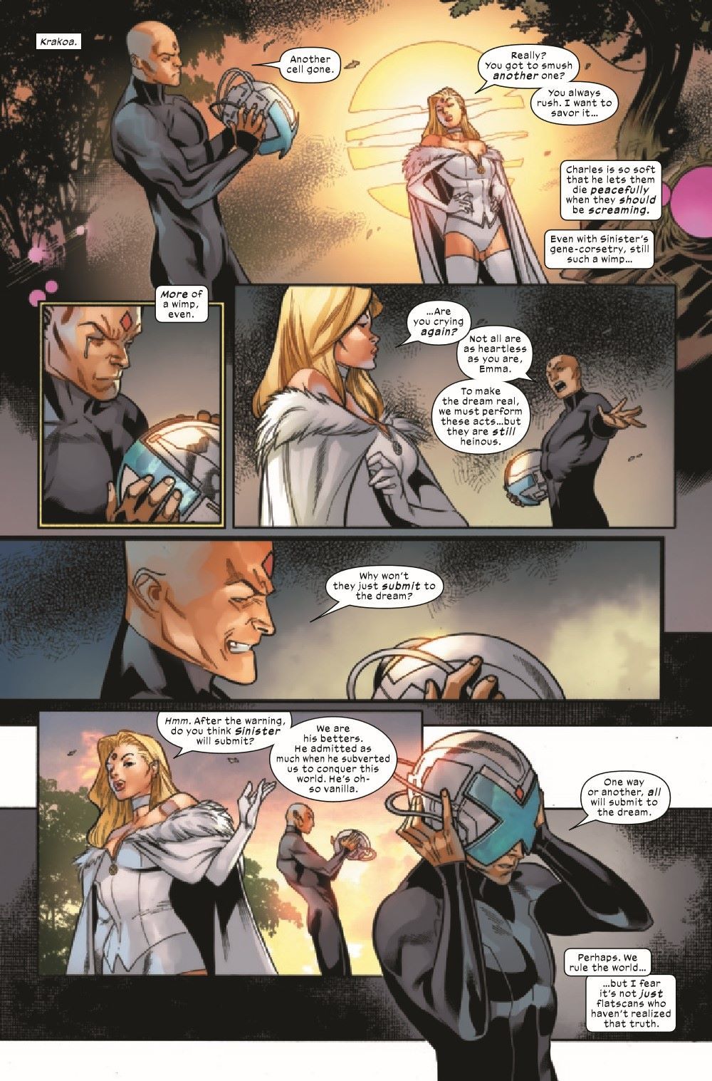 They said the mutants were humanity's future. It's 10 years later and they were proven to be right. The X-Men exist in a world that adores and respects them…so why are they sworn to crush it?! But while they do, Emma can take a few minutes out to crush Mister Sinister.