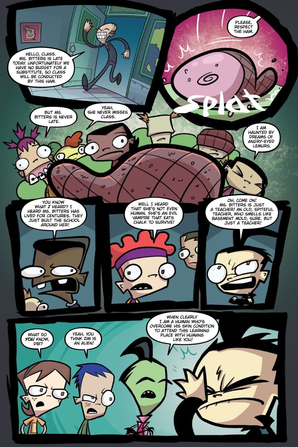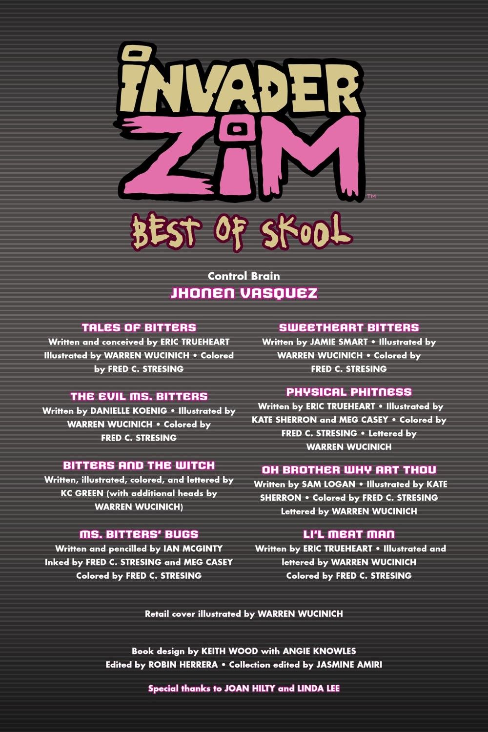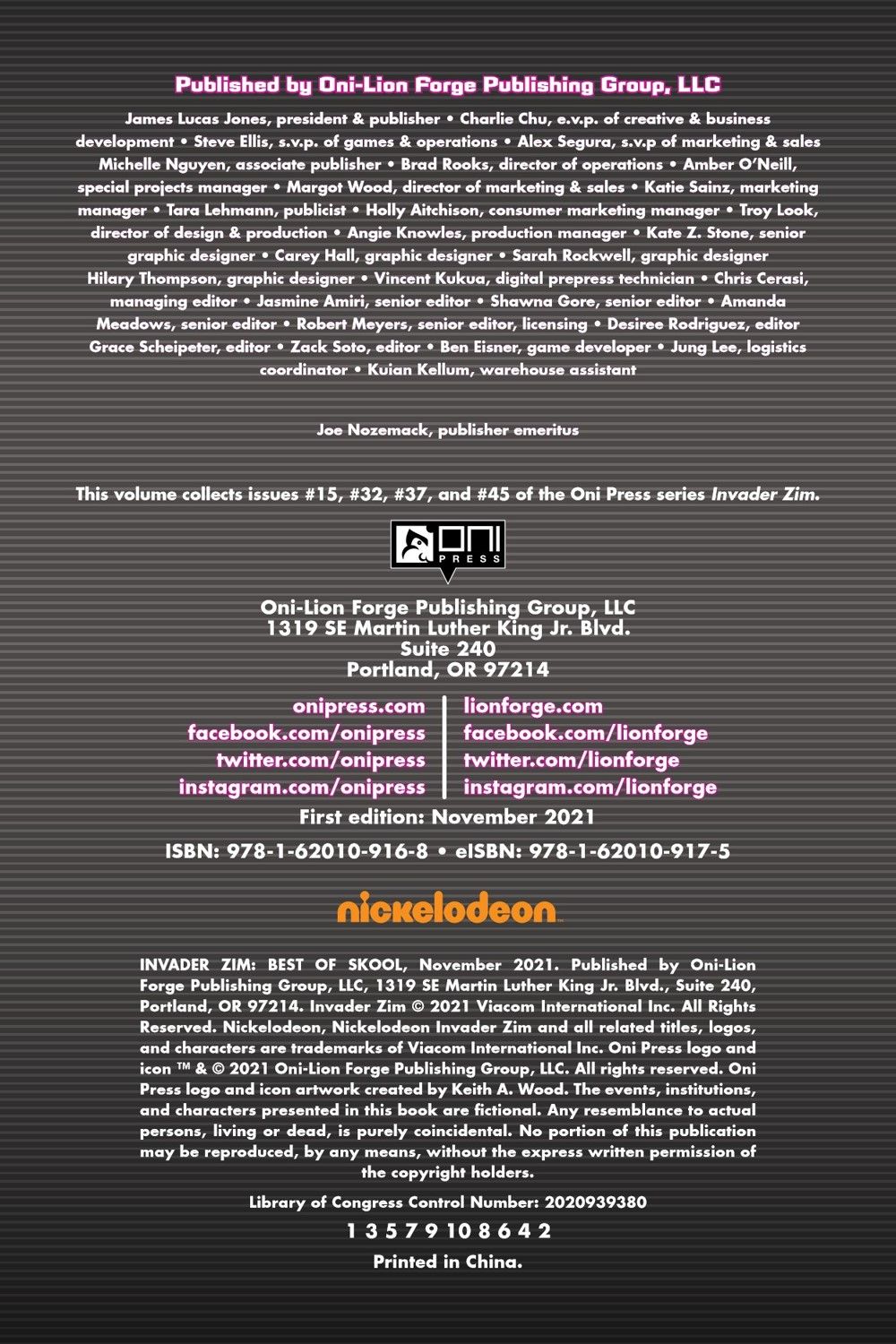 A brand-new collection featuring four of our favorite stories from the Invader ZIM comics highlighting skool--a place where young, impressionable human minds are molded into... eh, we're not sure what happens after that. But now you can relive all the best moments of ZIM and Dib's skool days! From incorrect rumors of Ms. Bitters' demise (and origin) to the trials and tribulations of the National Phitness Test, and finally, a time-honored class assignment: pretending some inanimate object is a baby and trying not to kill it. Heck, you might even learn something! (Learning is not guaranteed.) Contains issues #15, 32, 37, and 45 of the Oni Press series Invader ZIM.