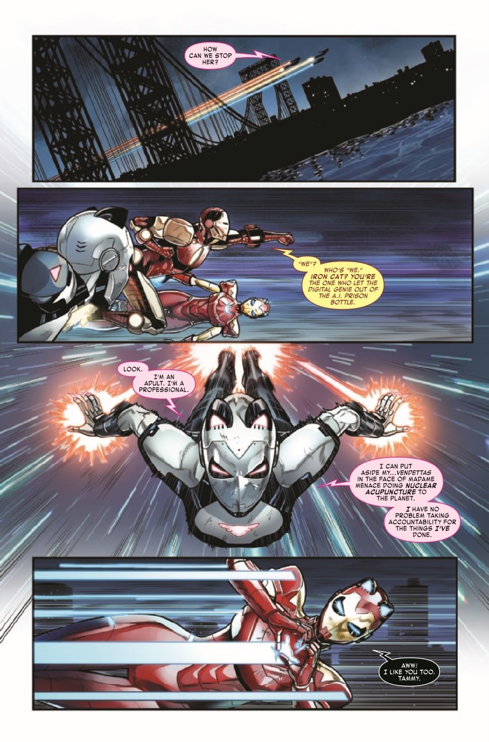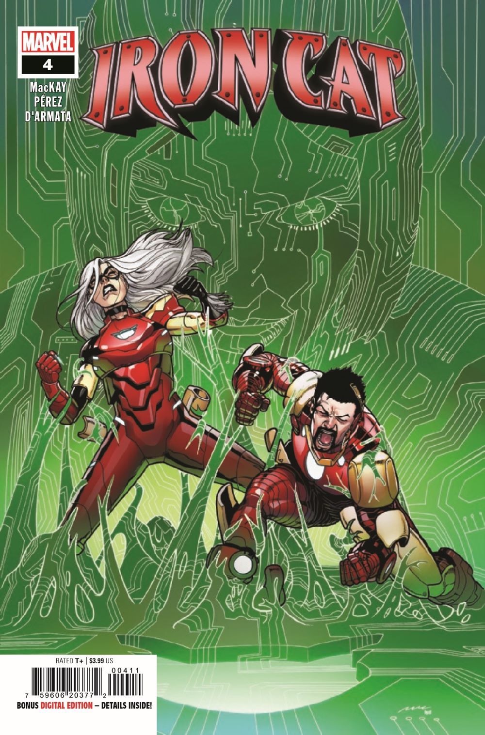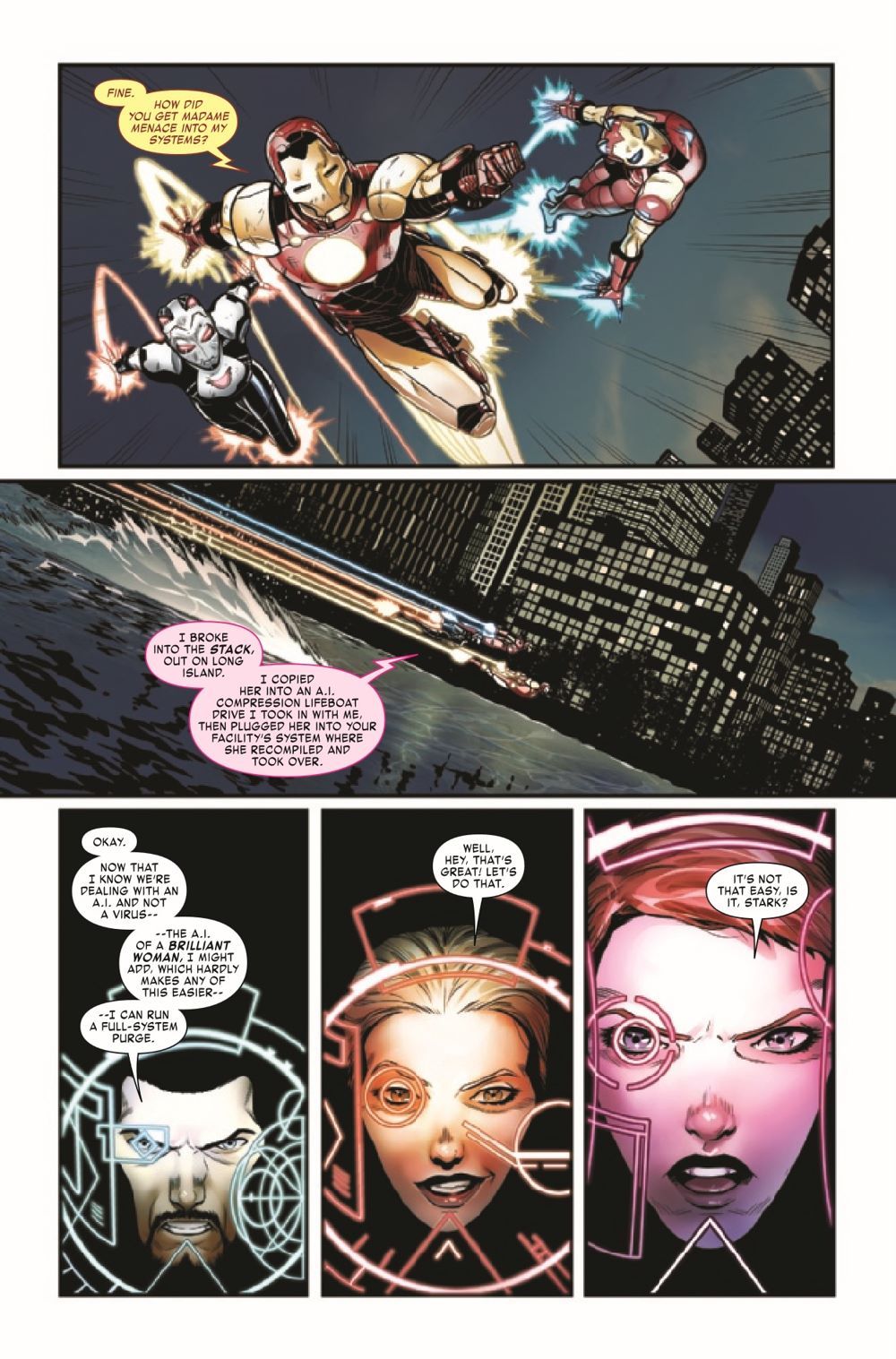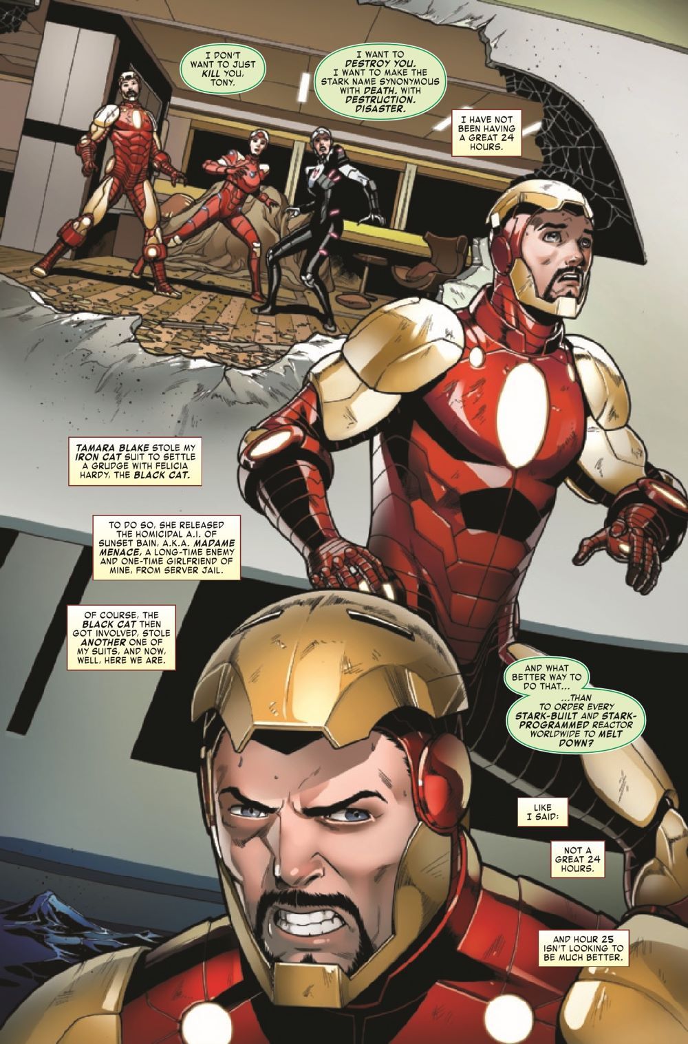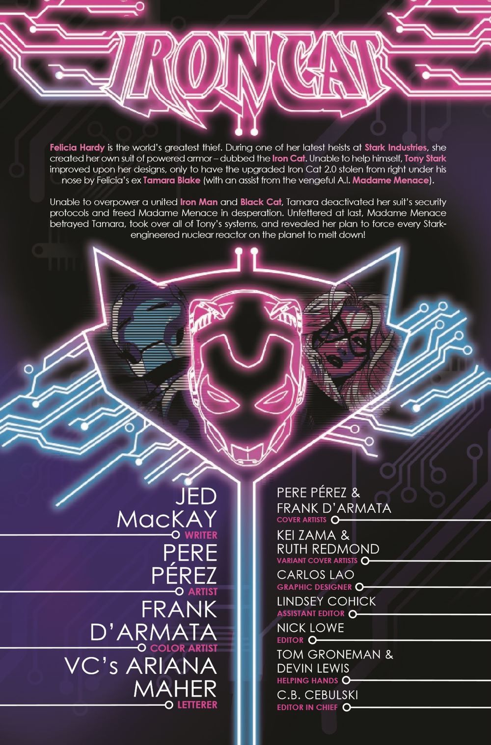 MADAME MENACE STRIKES! Iron Cat's vendetta against Felicia Hardy has produced some deadly consequences. Tony Stark's old nemesis, the sinister A.I. known as Madame Menace, has been unleashed!