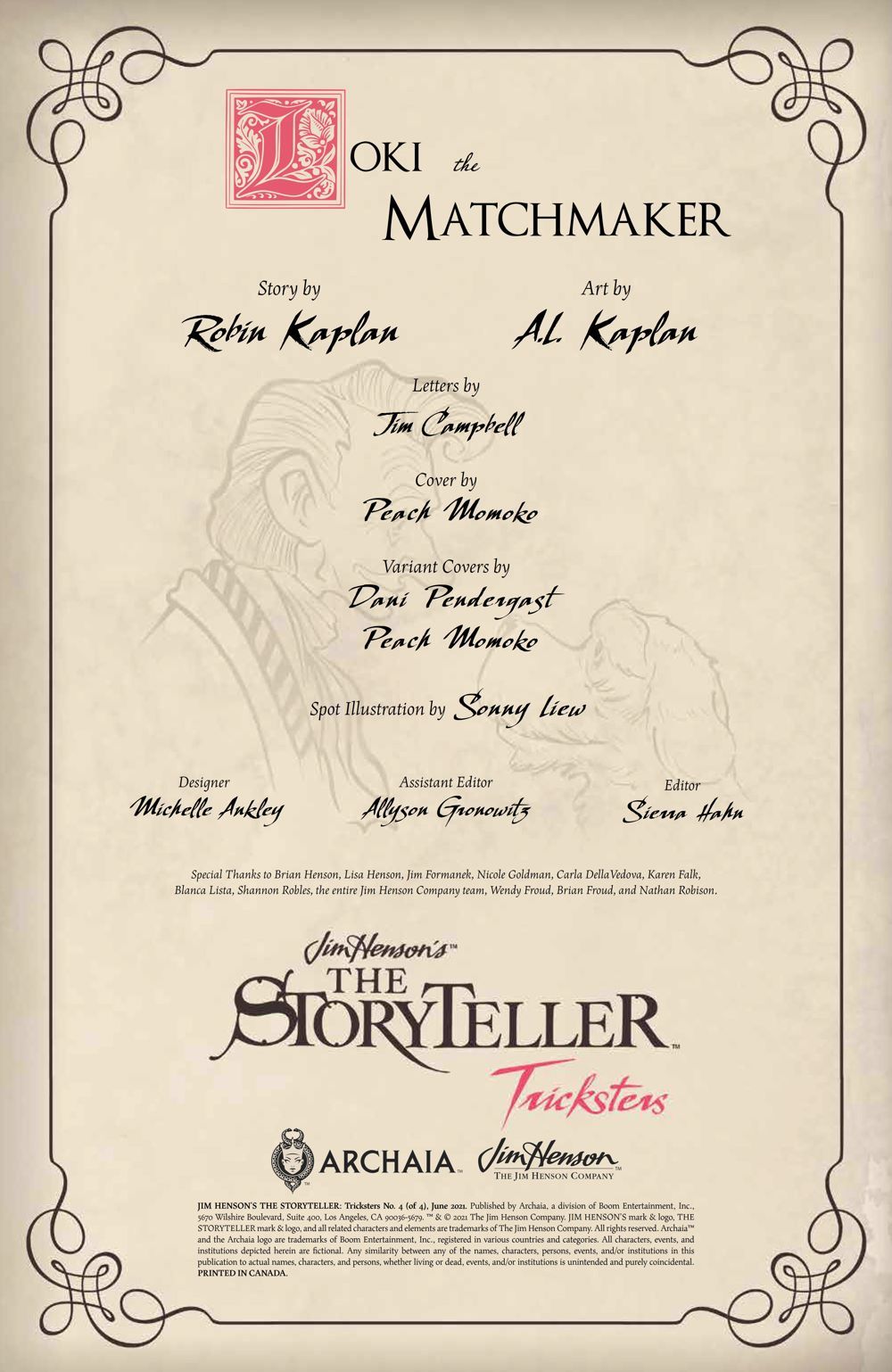 FINAL ISSUE. Can the Norse trickster god, Loki, get the legendary god of thunder, Thor, to embrace his feminine side? When Thor's hammer ends up in the possession of the King of the Giants, only his clever brother will be able to aid him in retrieving it, but only if Thor can use his brains rather than his brawn. Real-life siblings Robin Kaplan (The City on The Other Side) and A.L. Kaplan (Full-Spectrum Therapy) present the next standalone chapter of the Jim Henson-inspired epic limited series, with a different acclaimed creative team on each issue!