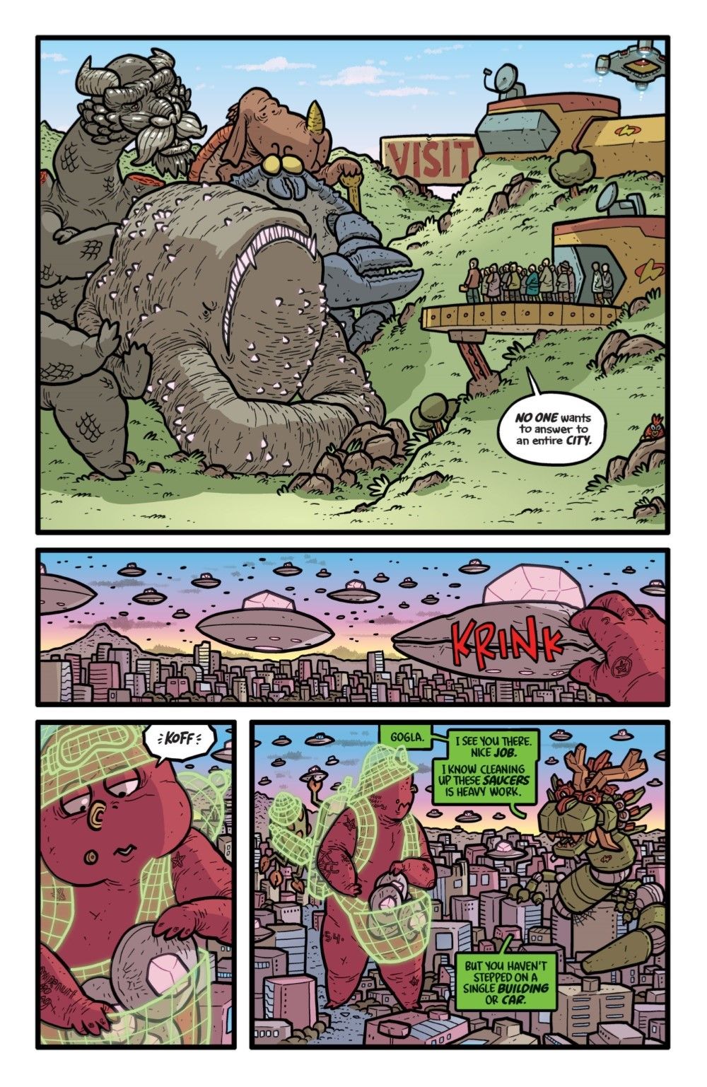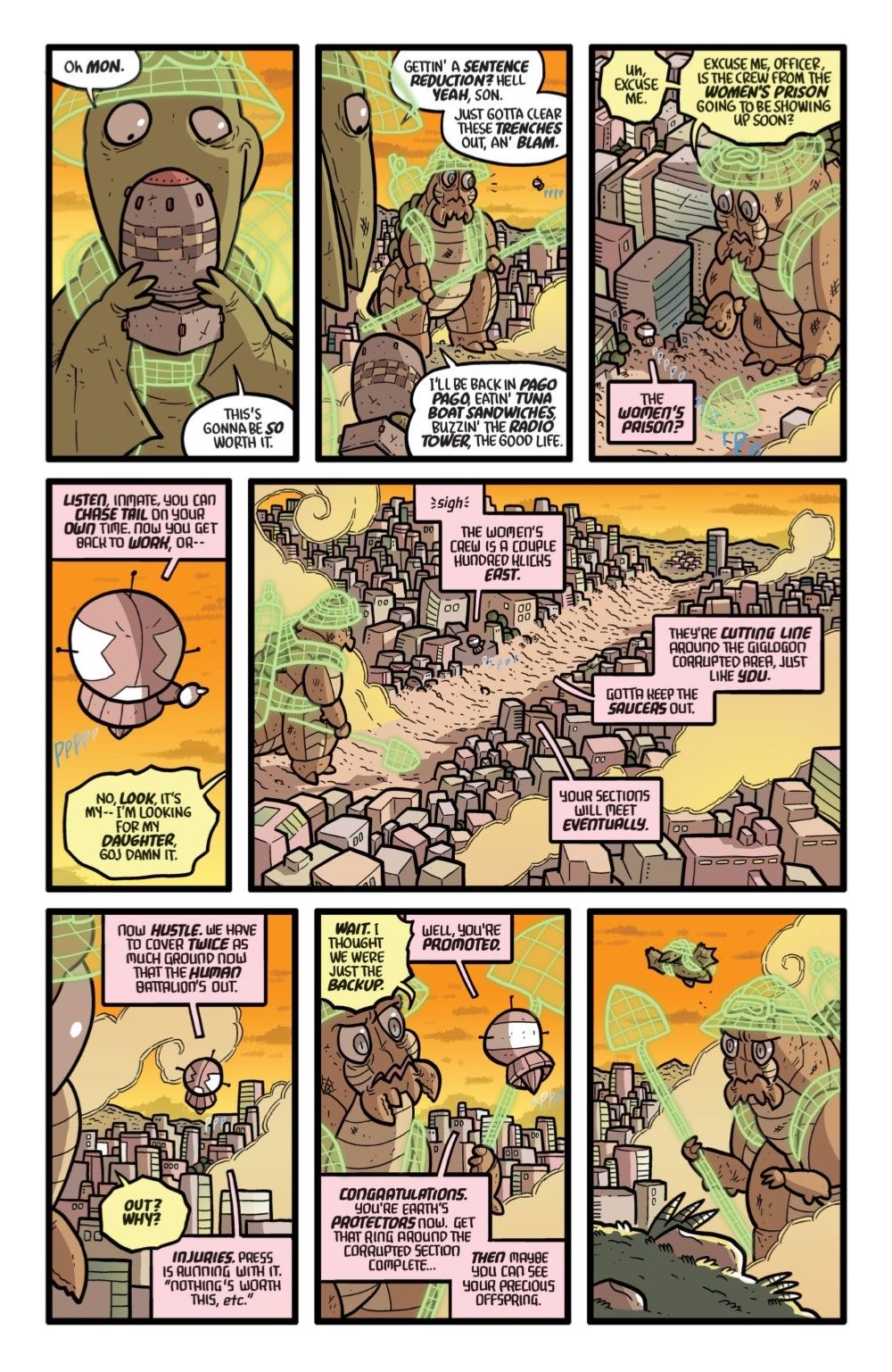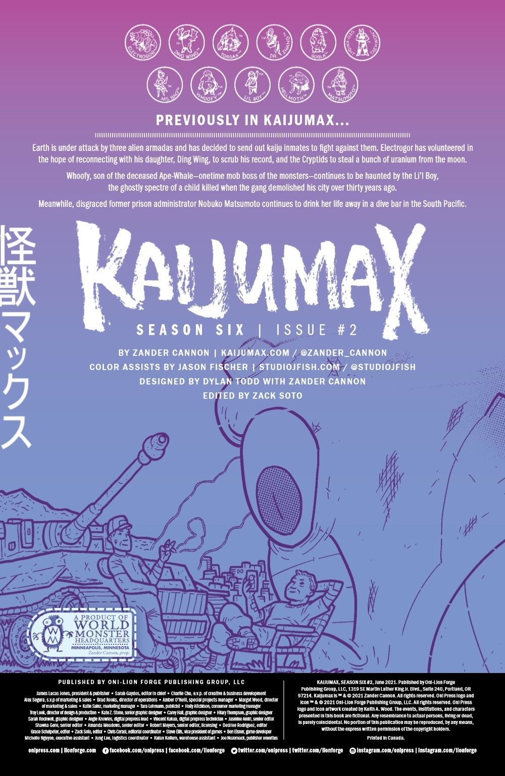 FINAL SEASON! The monstrous inmates of both the male and female KAIJUMAX prisons begin their exhausting, filthy, (and unpaid) work battling the three alien armadas who are attacking Earth. Whoofy, the all-powerful leader of the J-pop gang, has opted out of the fight, and remains in the prison for a new reconciliation program that puts him face-to-face with the victims of his gang's rampage thirty years ago. Those victims? The entire city of Chiba. Also: an alien-battling #resistance grift! Giant-size drunks in a giant-size bar! And… there but for the grace of Goj go I?