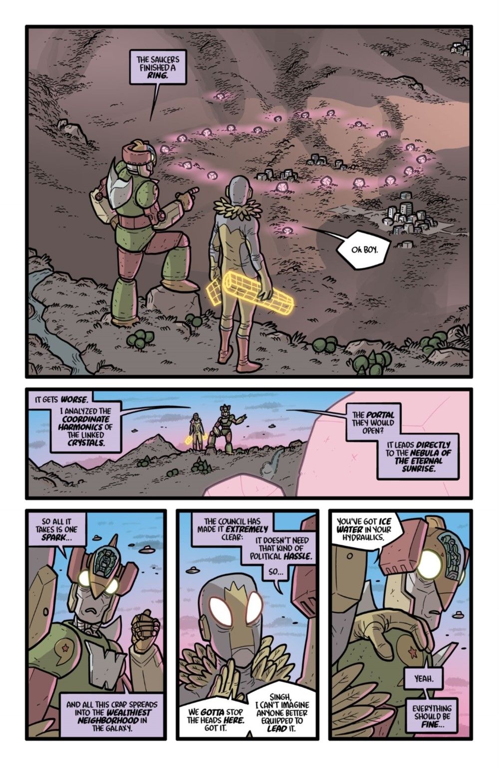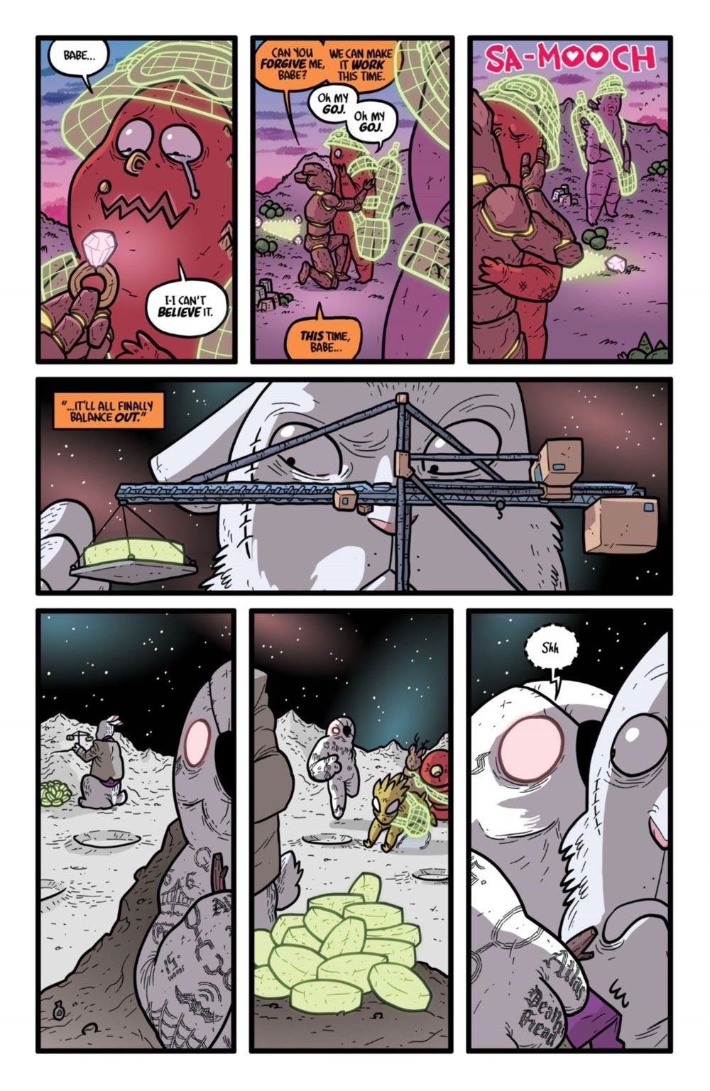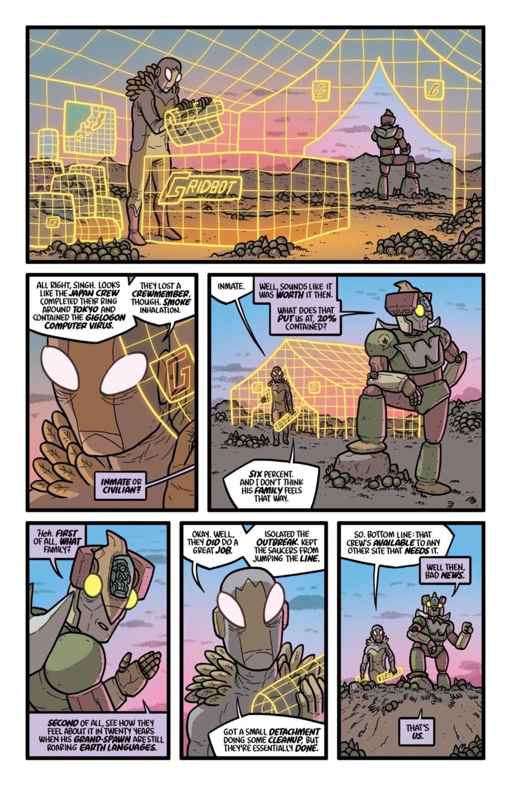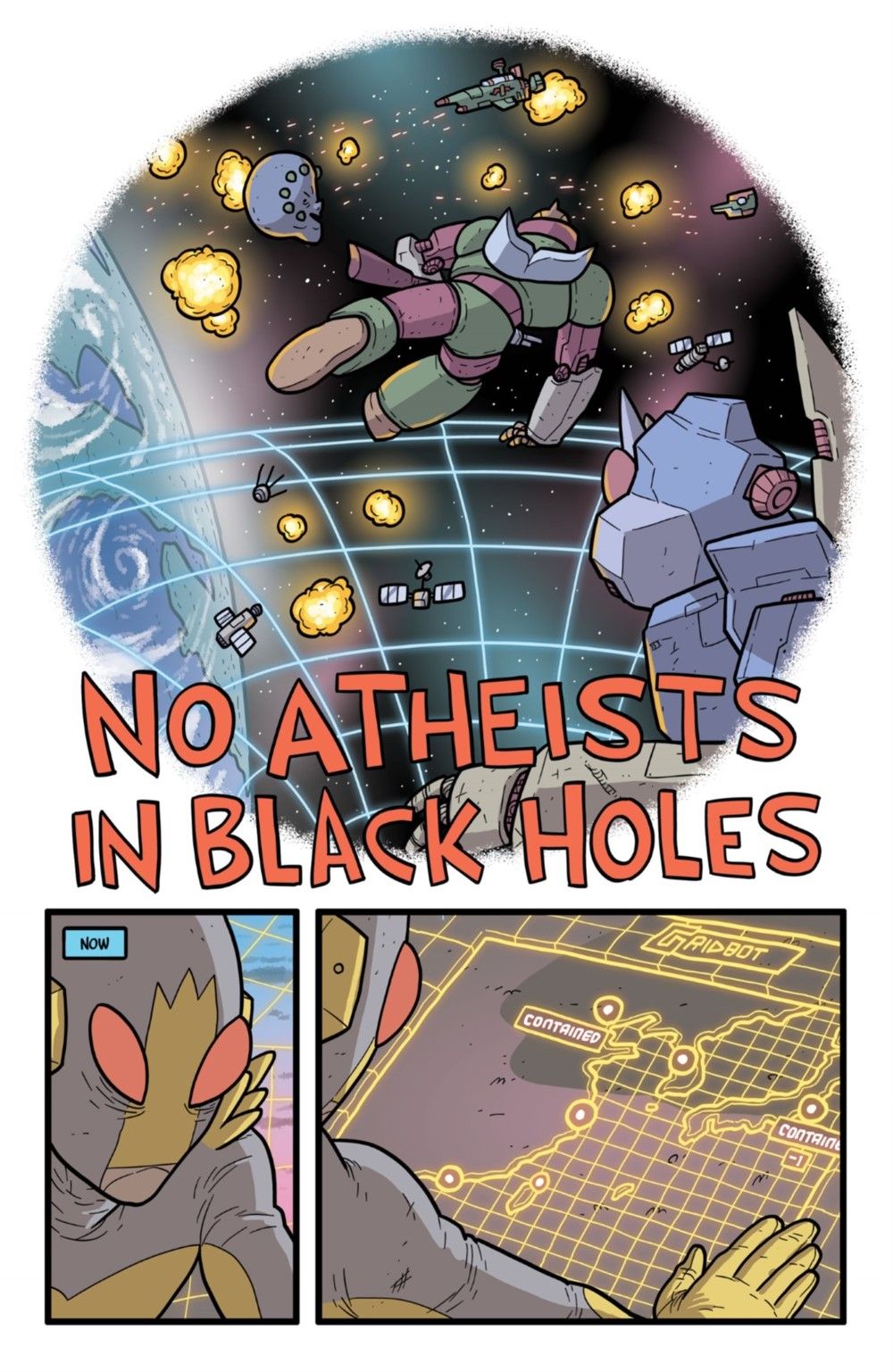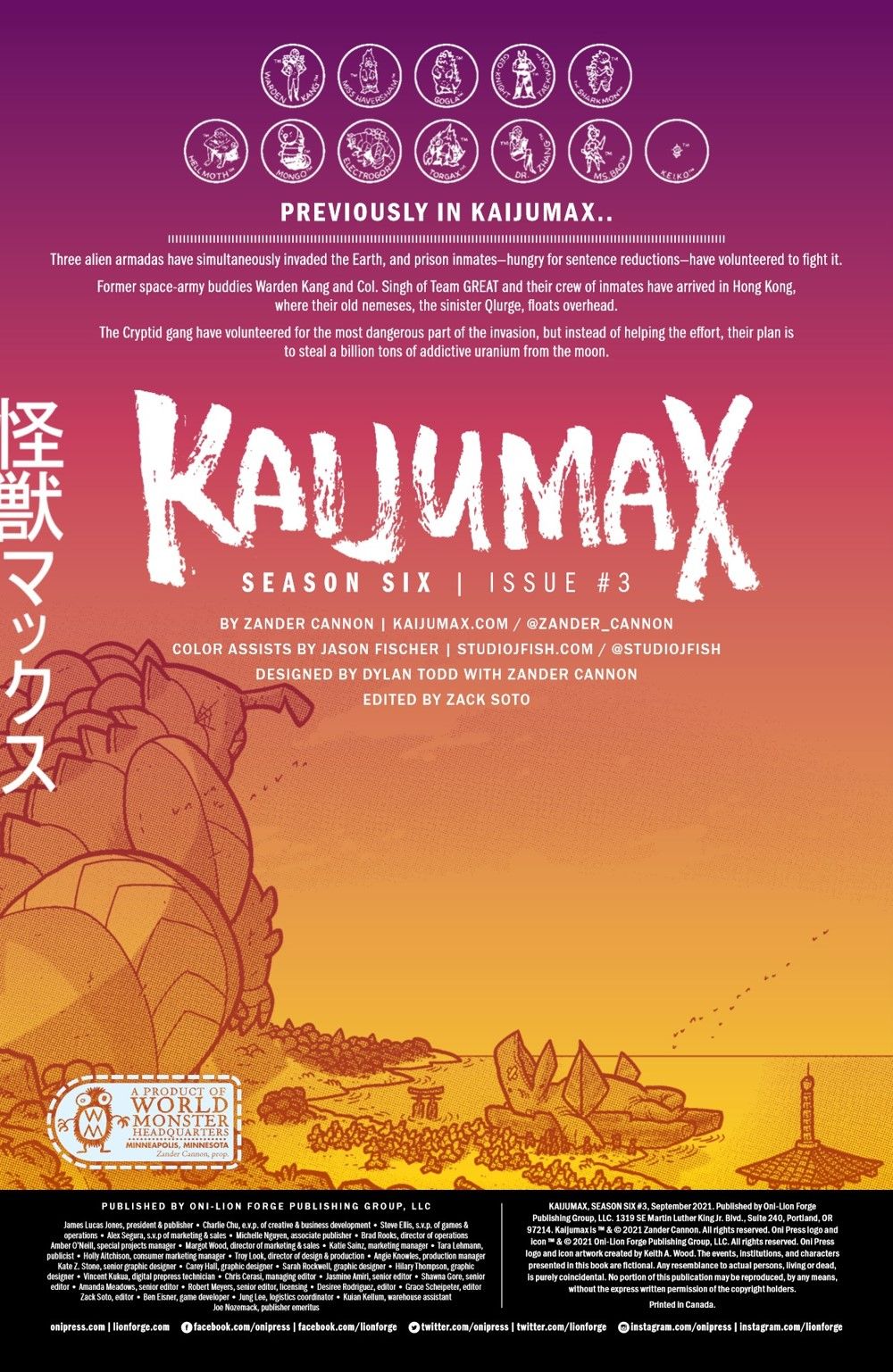 FINAL SEASON! The apocalyptic invasion of Earth continues, and the unpaid and under-trained inmates of KAIJUMAX prison have begun to lose ground fighting them. Enter Warden Kang and Colonel Singh, both veterans of the little-remembered orbital wars of the mid-nineties, to start rallying the prisoners. Meanwhile, with an eye on prevention, two human-sized monsters begin their infiltration of the alien spy network. Also: mountainside adultery! The lunar drug trade! Someone being messily devoured! And, "there are no atheists in black holes"?