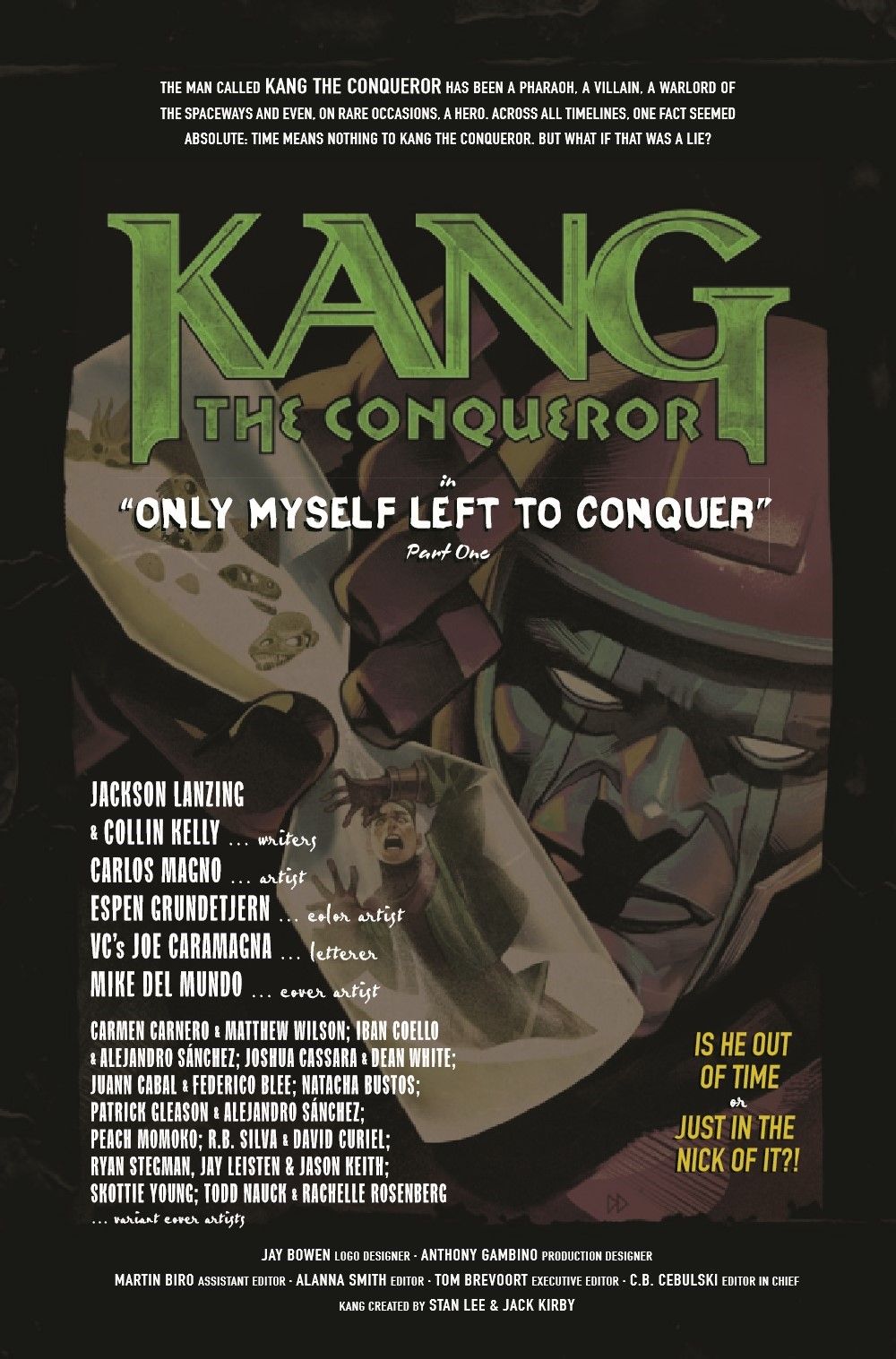 THE ORIGIN OF KANG! The man called Kang the Conqueror has been a pharaoh, a villain, a warlord of the space ways and even, on rare occasions, a hero. Across all timelines, one fact seemed absolute: Time means nothing to Kang the Conqueror. But the truth is more complex. Kang is caught in an endless cycle of creation and destruction dictated by time and previously unseen by any but the Conqueror himself. A cycle that could finally explain the enigma that is Kang. And a cycle that begins and ends with an old and broken Kang sending his younger self down a dark path...