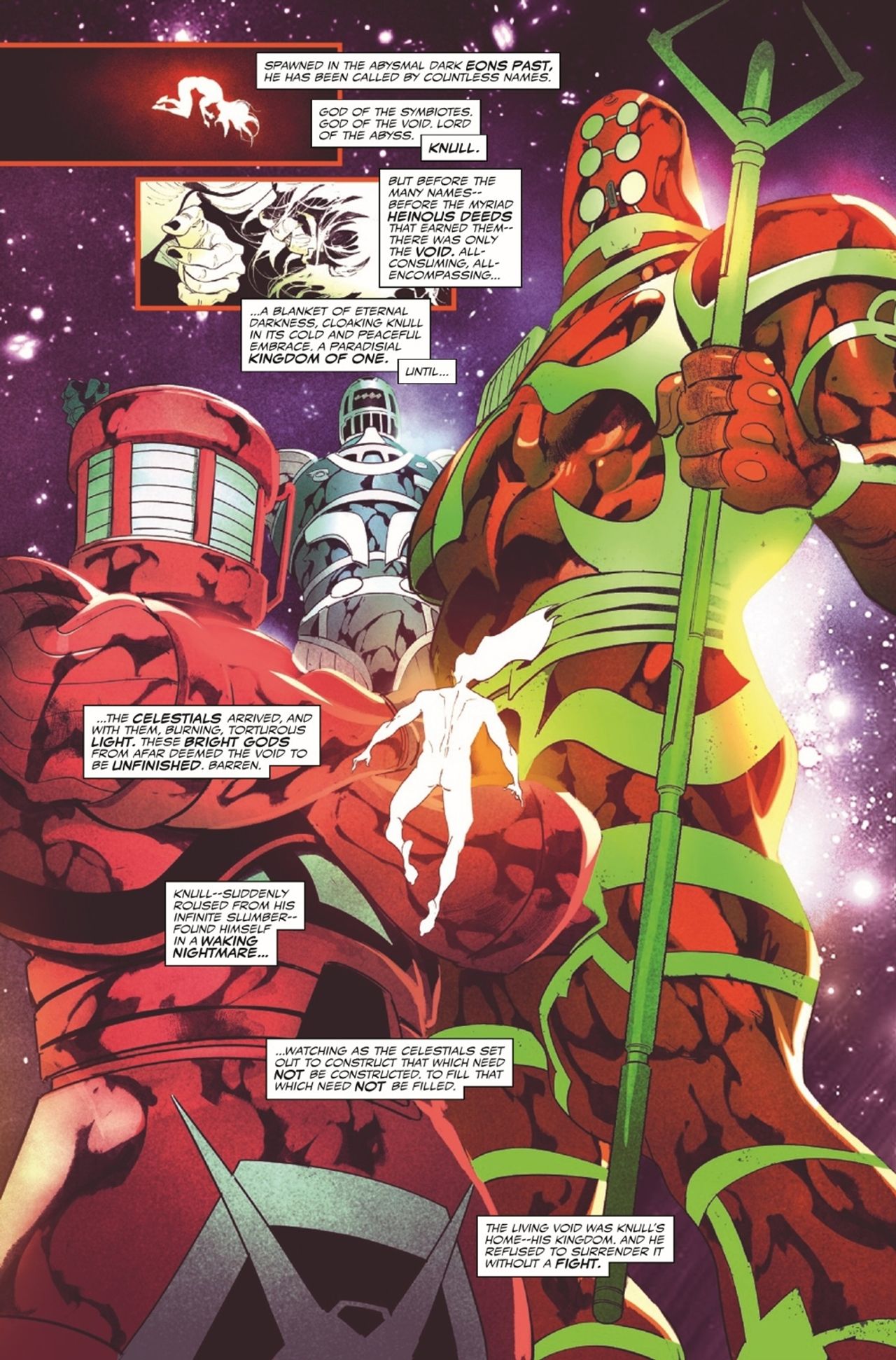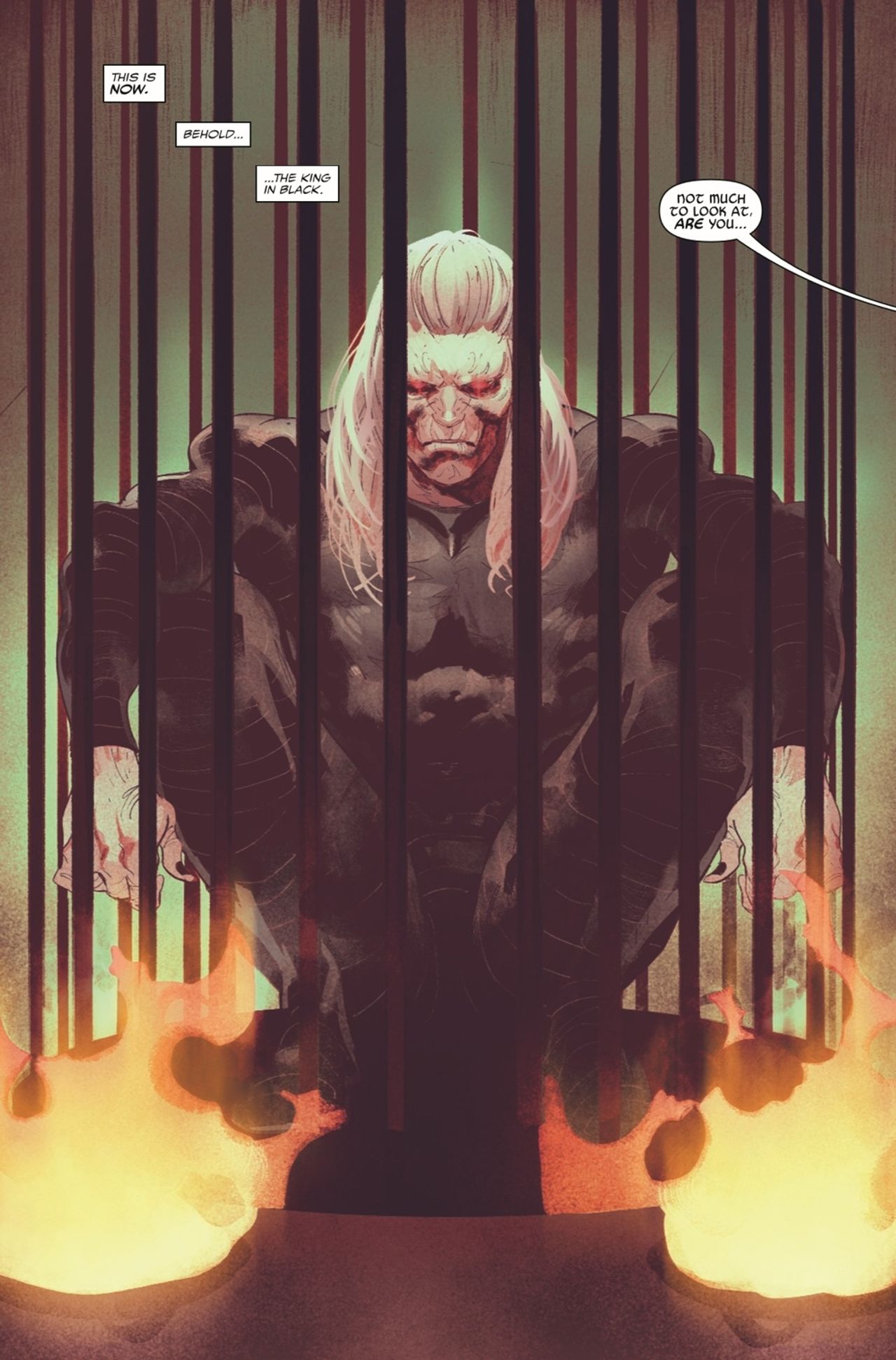 RETURN OF THE KING! Weakened from his last death, trapped by the enemy he never expected, the God of the Void waits in a cage once again. His captors think Knull has nothing to fight back with -- but in Knull's hands, nothing is a weapon. And there's a greater weapon out there, waiting for the King in Black to take it... and take his revenge.
