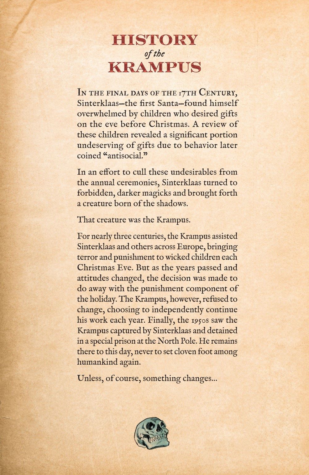 When the Secret Society of Santa Clauses are robbed of their holiday magic and rendered powerless by an unknown force, they have no choice but to enlist the infamous yuletide terror known as the Krampus to journey from the North Pole to recapture their magic in time to save the day. Oh, SURE -- besting a malevolent gang of Sugar Plum Fairies, a holiday-themed gun for hire, and Krampus's own hatred for the Society (and all of society in general) sounds like a cake walk, but when a dark secret from the Santas' past comes to light, the Krampus is put to the ultimate test.