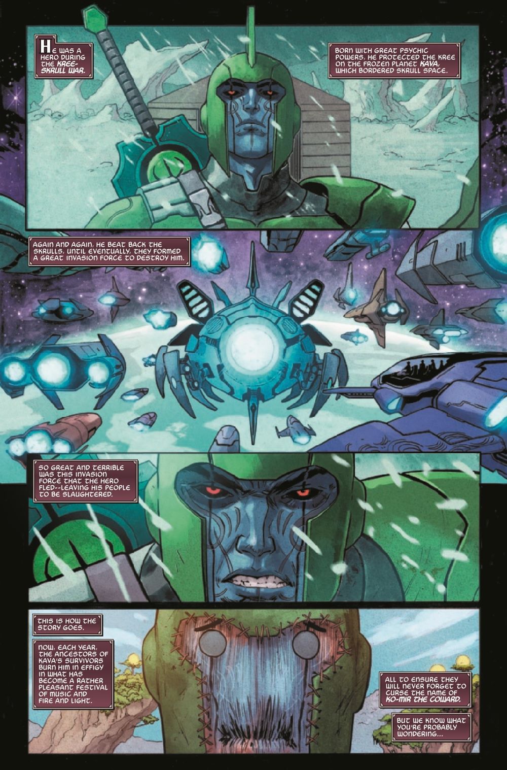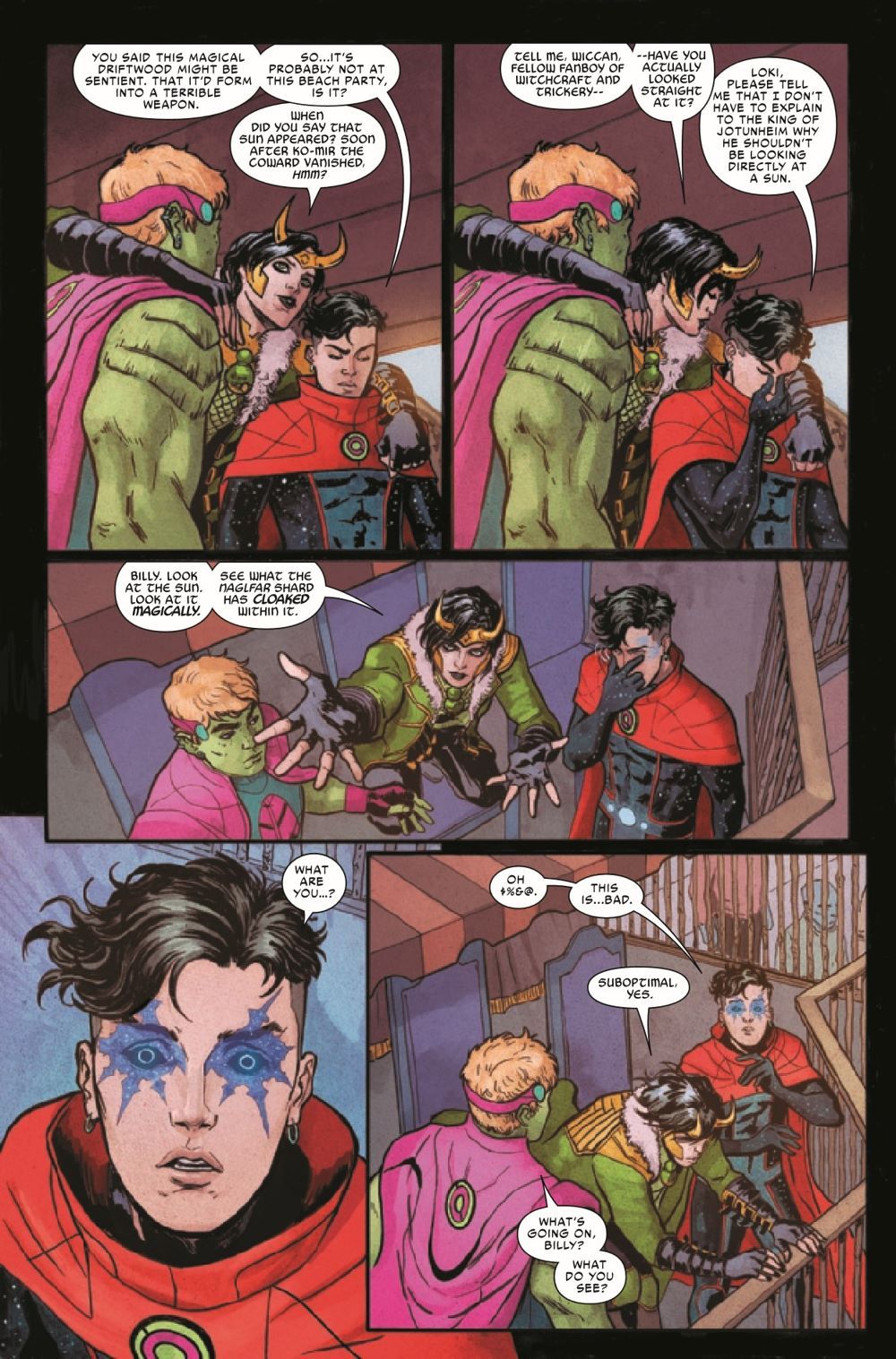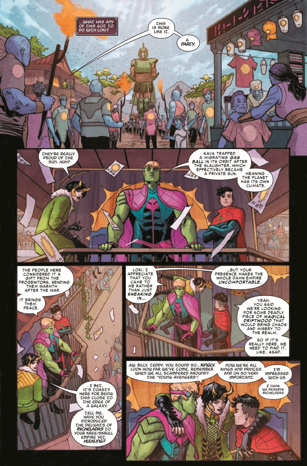 Naglfar sets sail to…the Kree-Skrull Empire! Where Emperor HULKLING and WICCAN must assist Loki in retrieving a second shard of Naglfar, which has become a holy relic on a distant planet. And they must also try to quash some old beef between the former Young Avengers teammates (the keyword being "try").