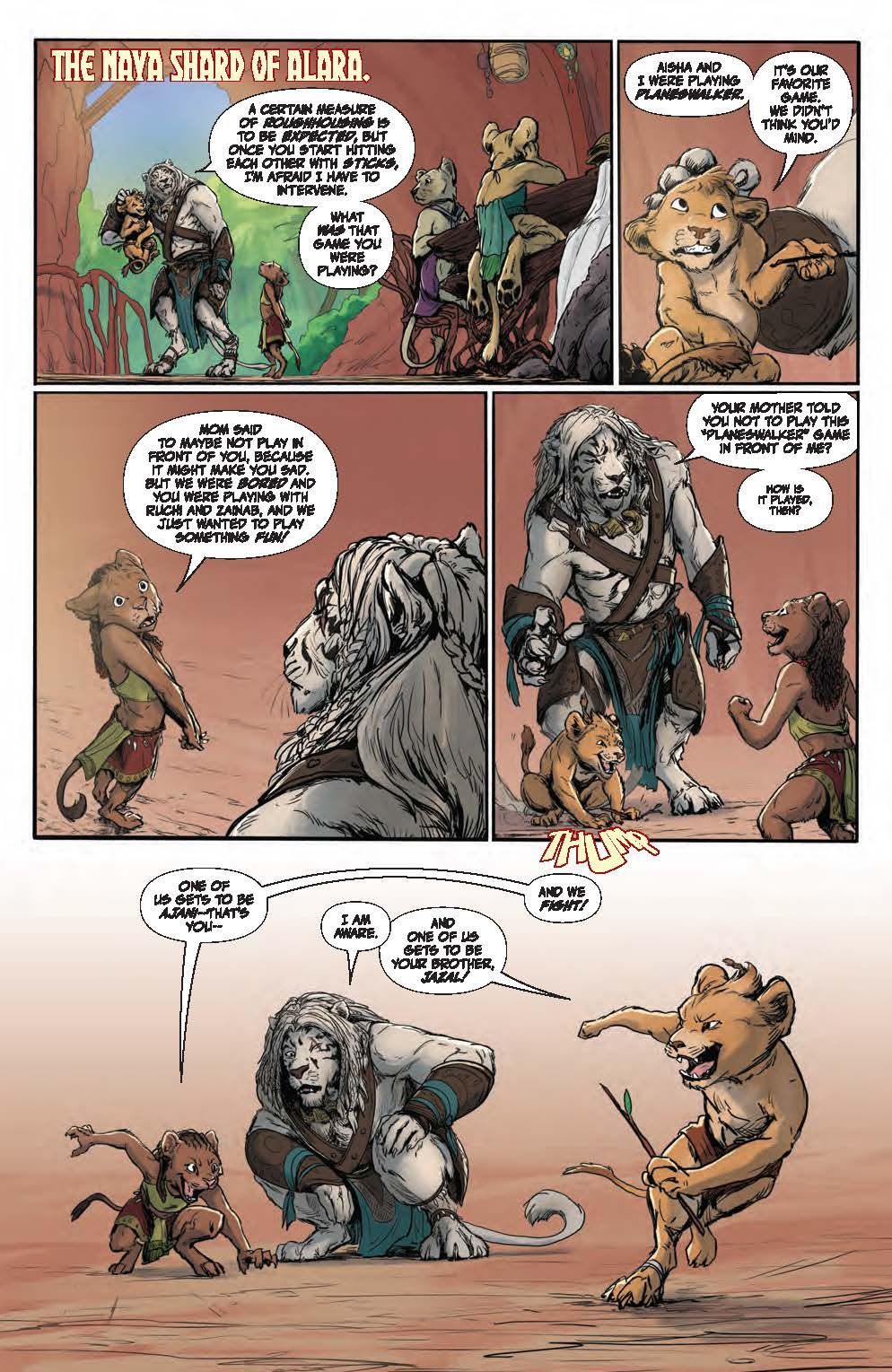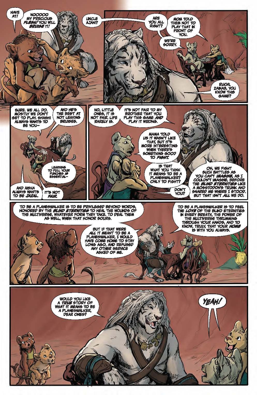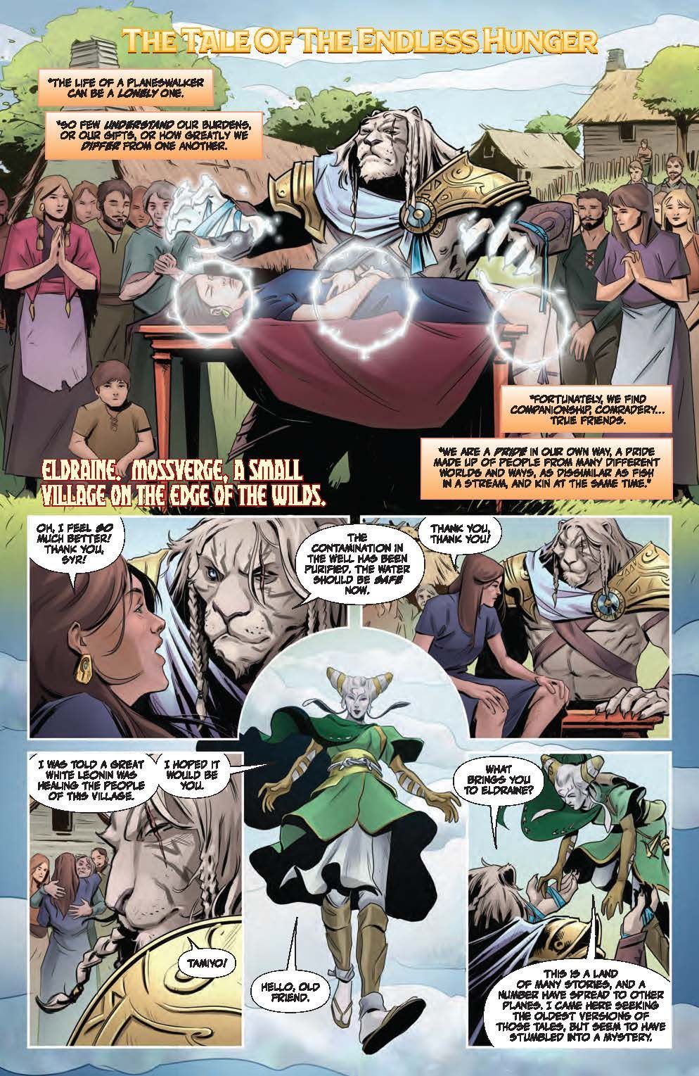 SPECIAL ISSUE. An Oversized One-Shot Adventure! This standalone tale introduces new readers to fan favorite planeswalker Ajani Goldmane, while delving into his past adventures and uncovering surprising revelations for the brave healer's current fans! But what happens when the steadfast, valiant protector faces threats beyond his capabilities?