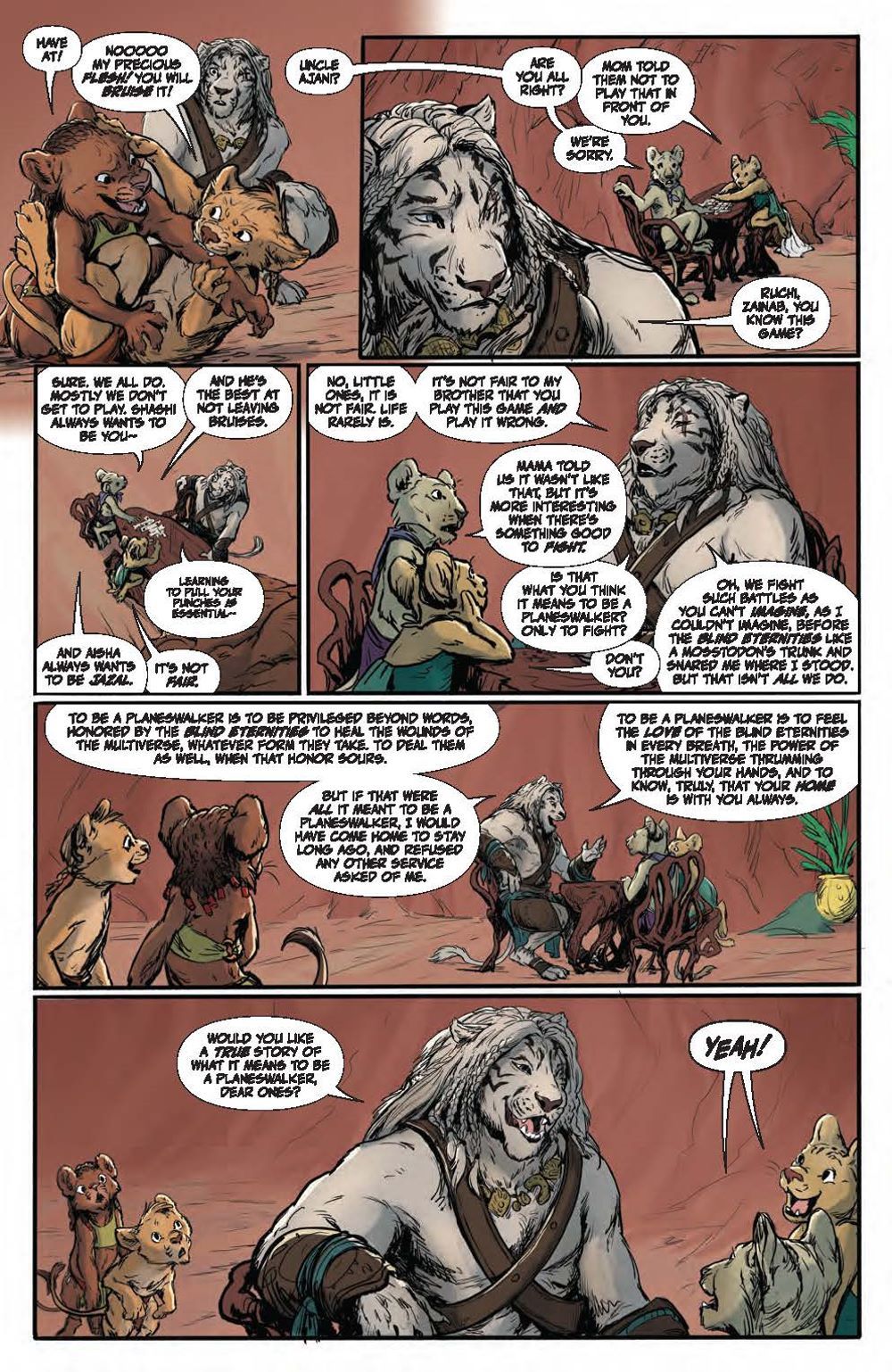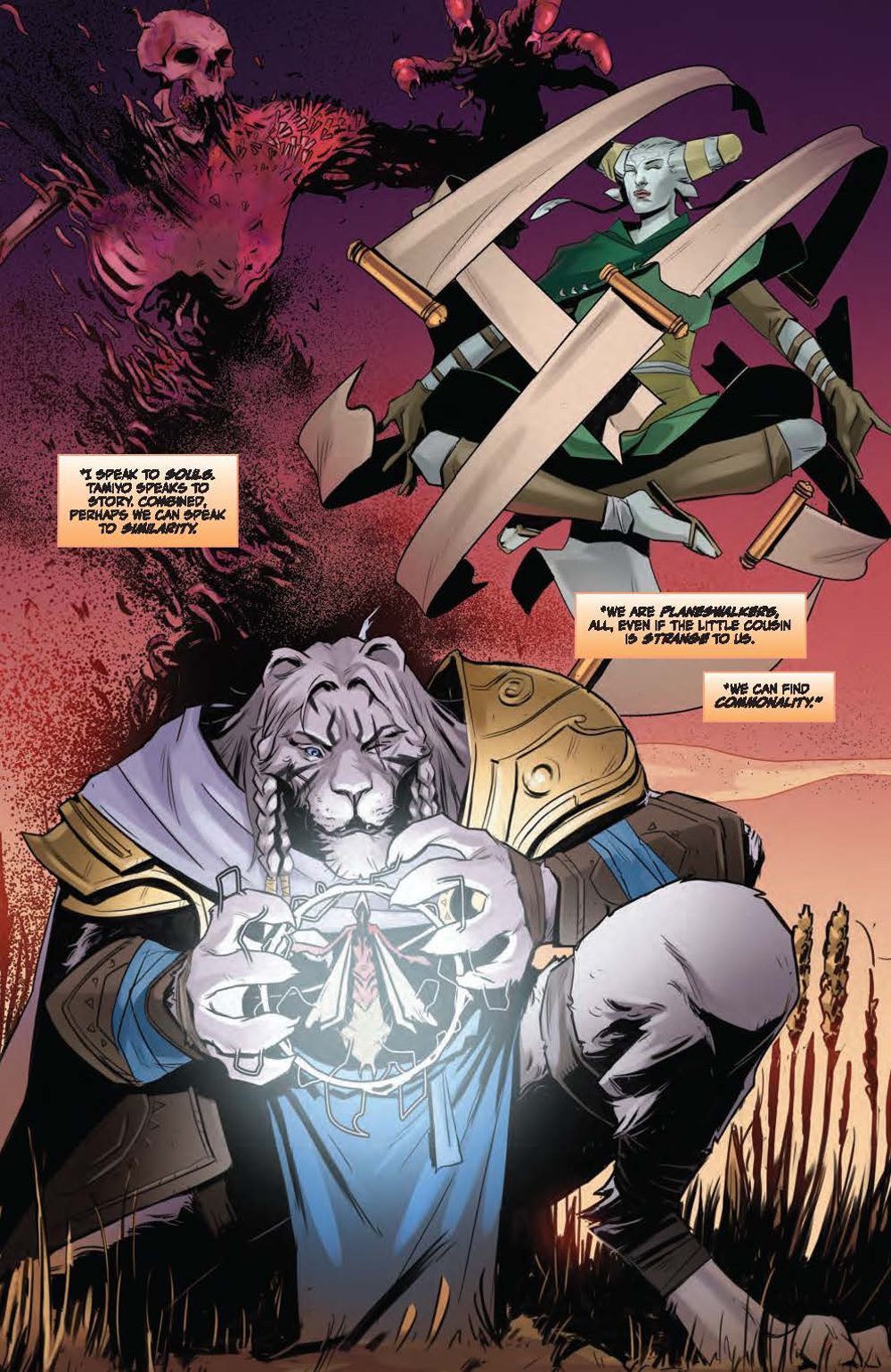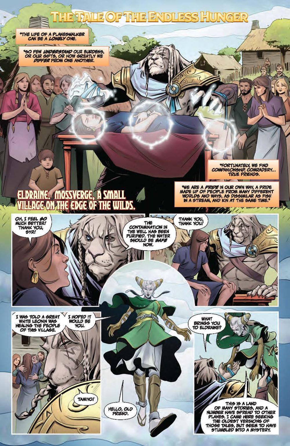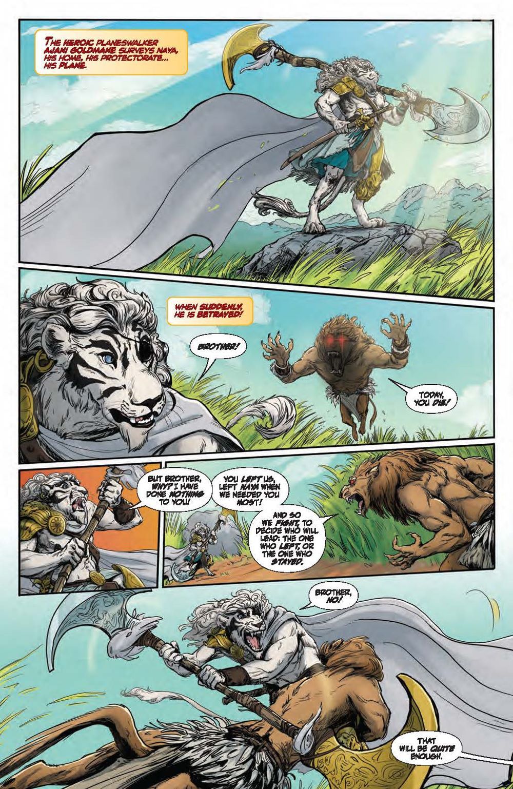In this deluxe hardcover collection, experience two standalone tales each spotlighting a beloved Magic: The Gathering character. First, delve into Ajani Goldmane's past adventures and uncover stunning surprises, including what happened when the steadfast, valiant protector faced threats beyond his capabilities! Meanwhile, Nahiri has protected her home plane of Zendikar for centuries, her ruthlessness and power kept in check by a strong sense of justice. But a new challenge awaits that may change the way the Multiverse perceives her… Nebula, Hugo, Locus, and Alex Award-winning novelist Seanan McGuire (Ghost-Spider) returns to the world of Magic: The Gathering with artists Kath Lobo (Go Go Power Rangers), Jacques Salomon (Lovecraft: Unknown Kadath), Giuseppe Cafaro (Red Sonja), Lea Caballero (Just Beyond), and Michael Shelfer (The Vampire Slayer) to bring Ajani Goldmane and Nahiri the Lithomancer to comics! Collects Magic: Ajani Goldmane #1 and Magic: Nahiri the Lithomancer #1.