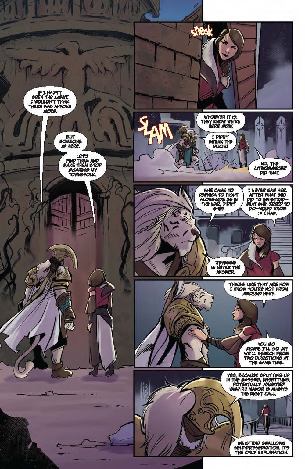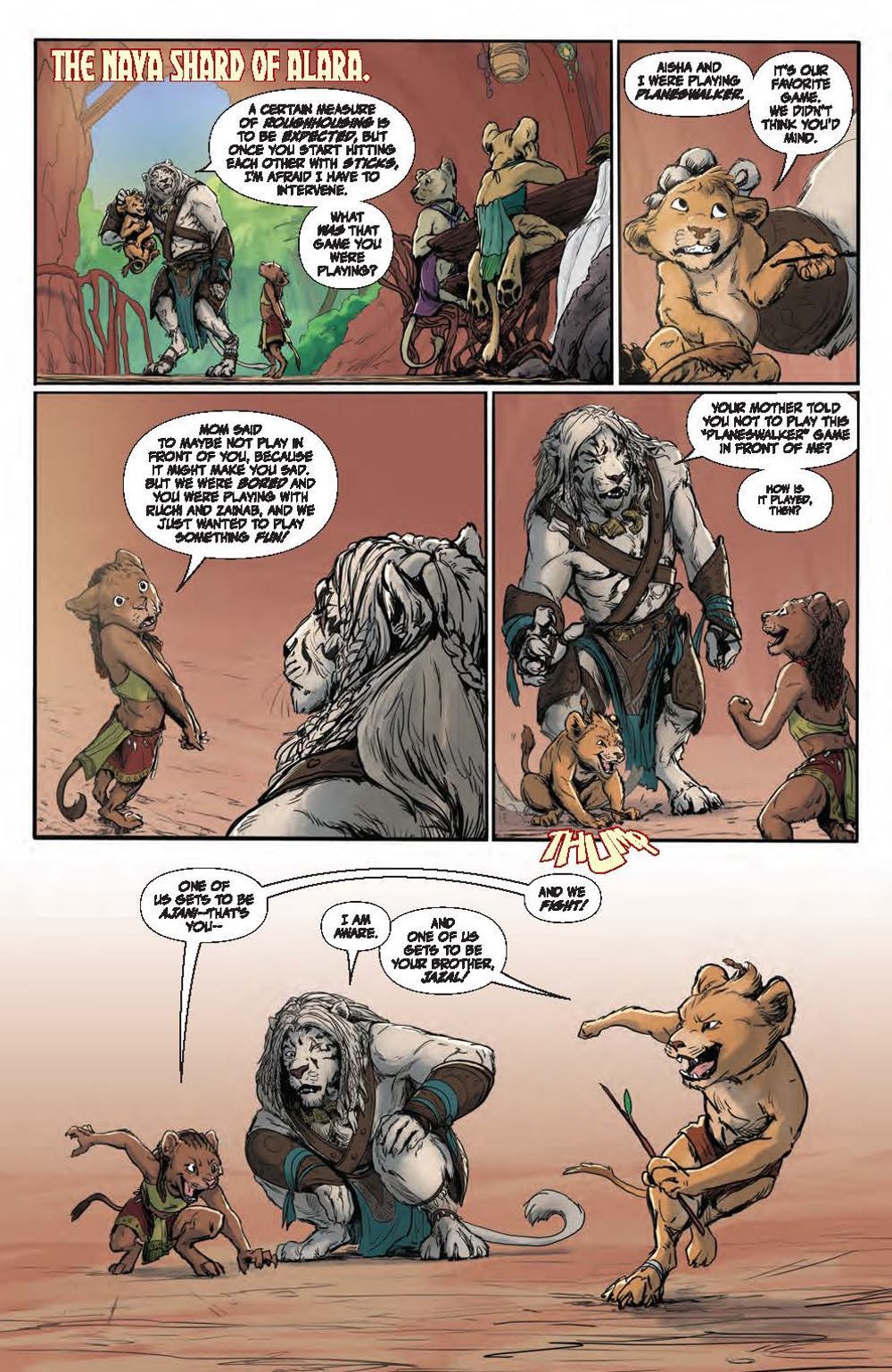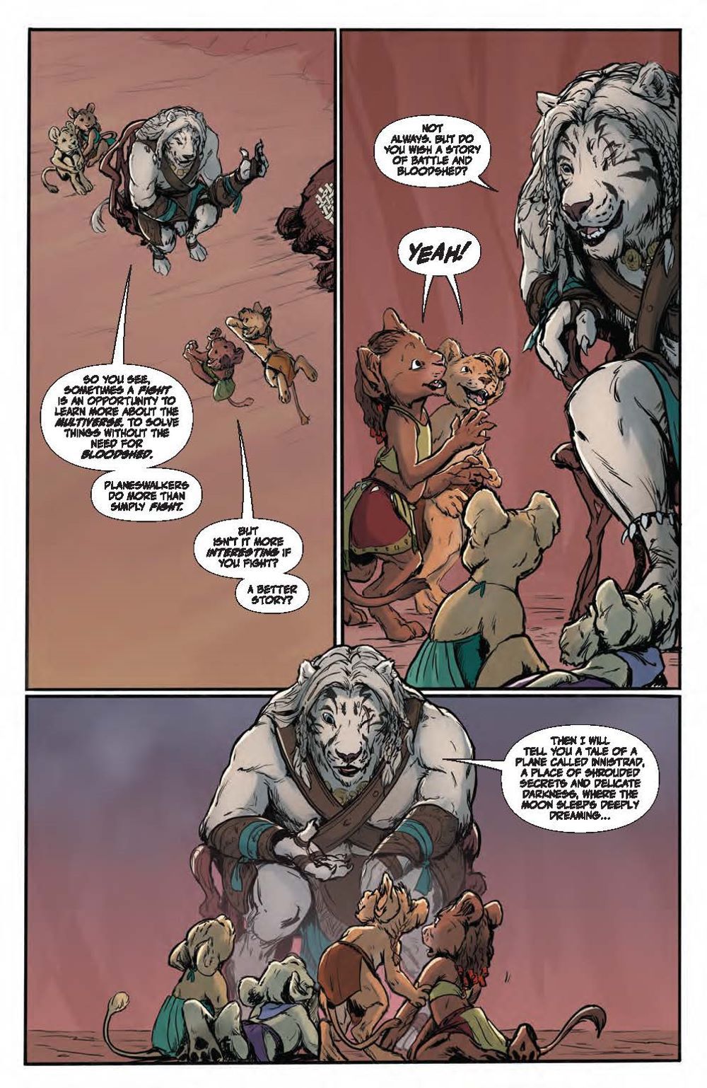 In this deluxe hardcover collection, experience two standalone tales each spotlighting a beloved Magic: The Gathering character. First, delve into Ajani Goldmane's past adventures and uncover stunning surprises, including what happened when the steadfast, valiant protector faced threats beyond his capabilities! Meanwhile, Nahiri has protected her home plane of Zendikar for centuries, her ruthlessness and power kept in check by a strong sense of justice. But a new challenge awaits that may change the way the Multiverse perceives her… Nebula, Hugo, Locus, and Alex Award-winning novelist Seanan McGuire (Ghost-Spider) returns to the world of Magic: The Gathering with artists Kath Lobo (Go Go Power Rangers), Jacques Salomon (Lovecraft: Unknown Kadath), Giuseppe Cafaro (Red Sonja), Lea Caballero (Just Beyond), and Michael Shelfer (The Vampire Slayer) to bring Ajani Goldmane and Nahiri the Lithomancer to comics! Collects Magic: Ajani Goldmane #1 and Magic: Nahiri the Lithomancer #1.