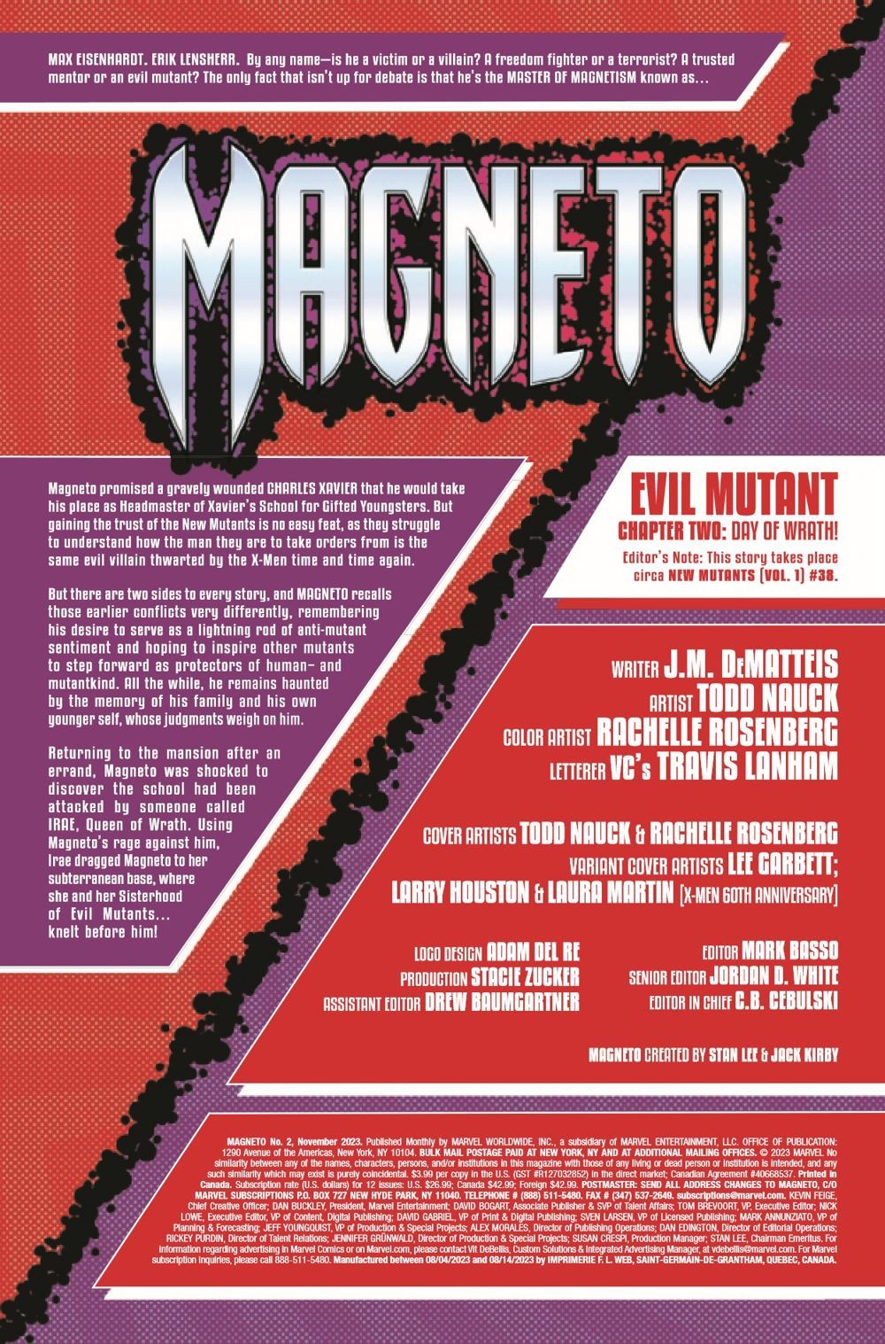 ENTER: THE QUEEN OF WRATH! Years ago, MAGNETO battled the X-MEN on the island-nation of Santo Marco. Now, as Magneto attempts to turn over a new leaf, he will feel the wrath of IRAE! But what secret does that battle hide for Irae, and what shocking revelation is in store for the Master of Magnetism? Continuing the all-new adventure set during Magneto's days as Headmaster of the NEW MUTANTS, and unearthing never-before-revealed aspects of his past and future!