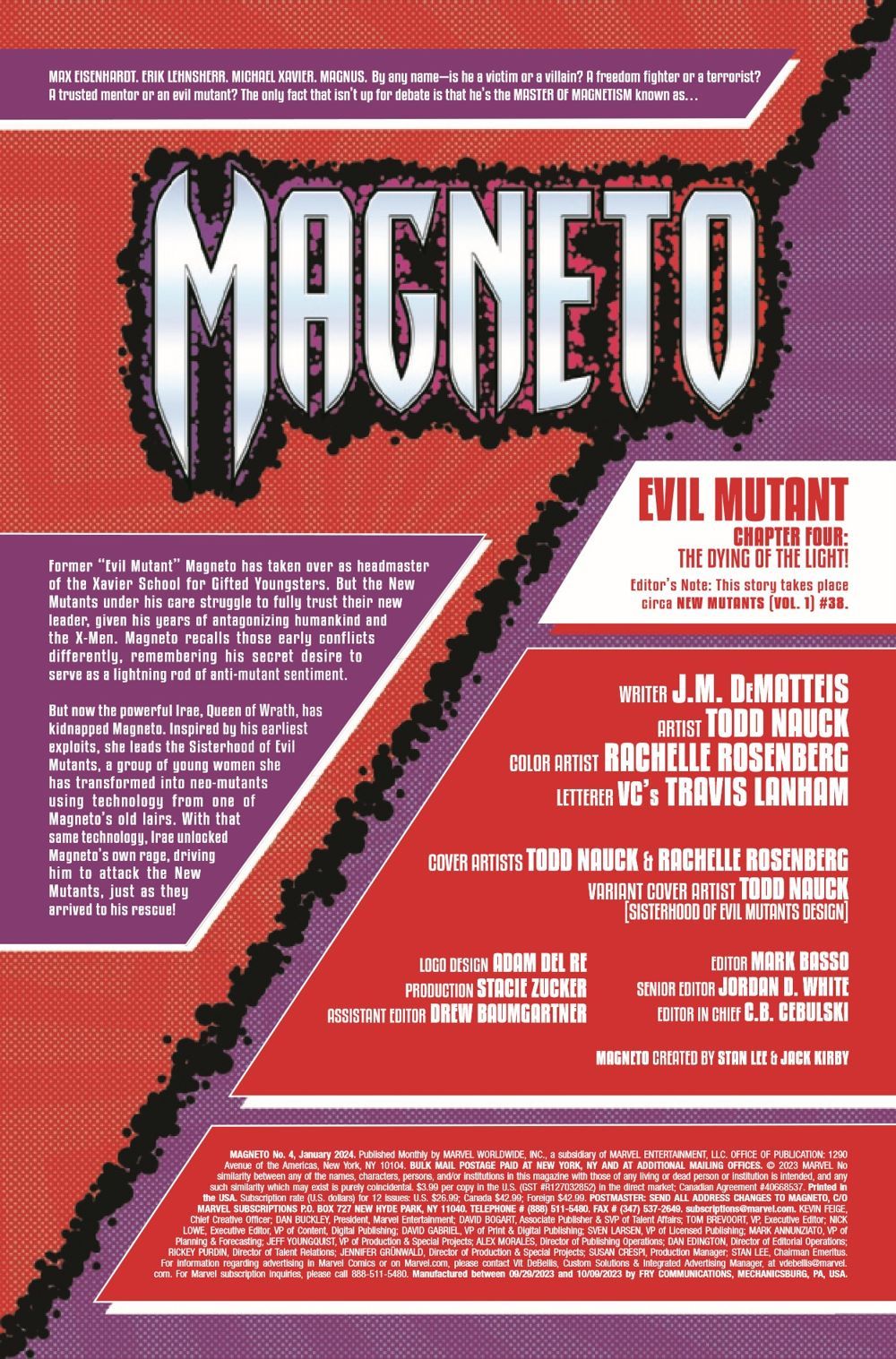 IS HE EVIL MUTANT, OR IS HE HERO...OR IS HE BOTH? MAGNETO must come to grips with his past as the Head of the Brotherhood of Evil Mutants, as well as his present as the Headmaster of the Xavier School's NEW MUTANTS! What is the TRUE destiny of Erik Lehnsherr? How can these two aspects co-exist in the same man? Don't miss the astounding final chapter of the character-defining saga by J.M. DeMatteis (SPIDER-MAN: Kraven's Last Hunt, CAPTAIN AMERICA) and Todd Nauck (X-MEN LEGENDS, AMAZING SPIDER-MAN)!