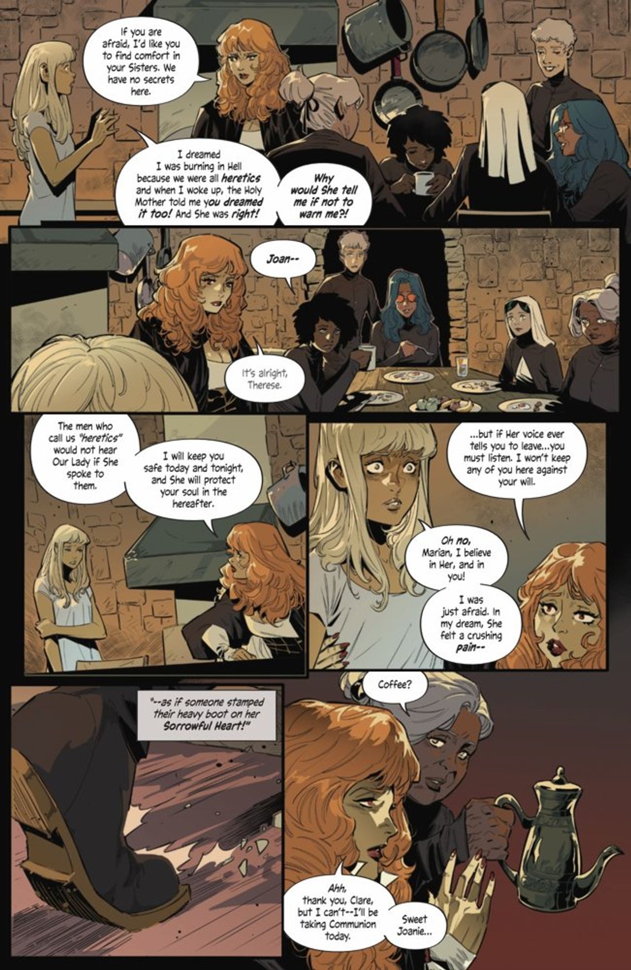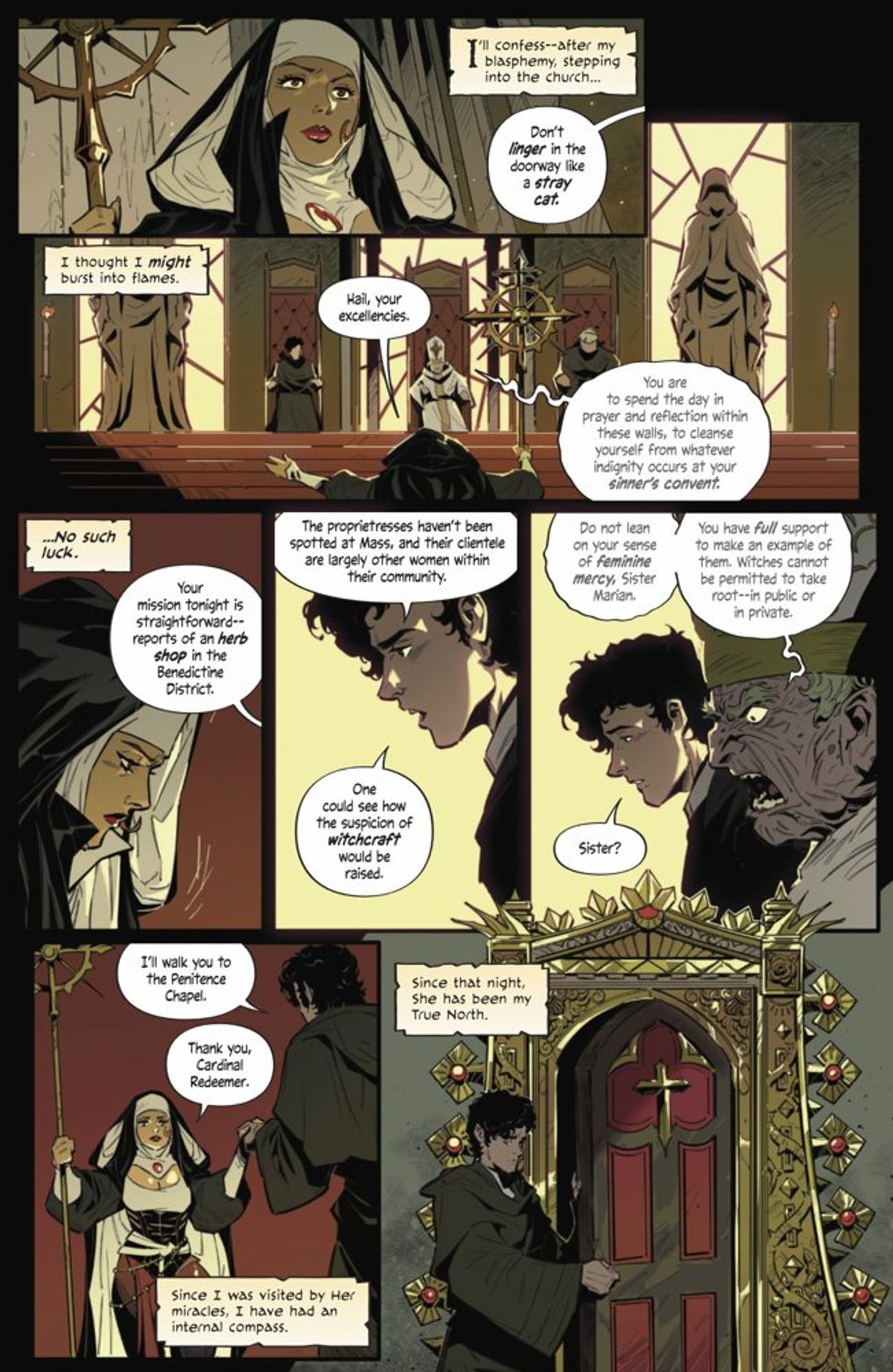 Marian's faith is tested as she navigates a dangerous crossroads. Haunted by nightmares of eternal damnation, Marian clings to her faith, but the sins she's forced to commit in service to the Cardinals weigh heavily upon her. Seeking solace beyond the Church, she turns to the witches who've offered her a place in their coven—only to be sent on a hallucinogenic journey that will force Marian to confront her soul-searching questions and fears. Can she find her way back, or will the answers she seeks lead her to darker revelations?