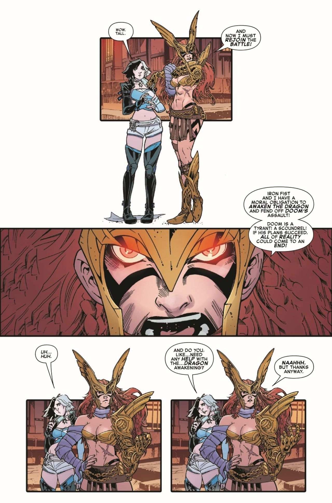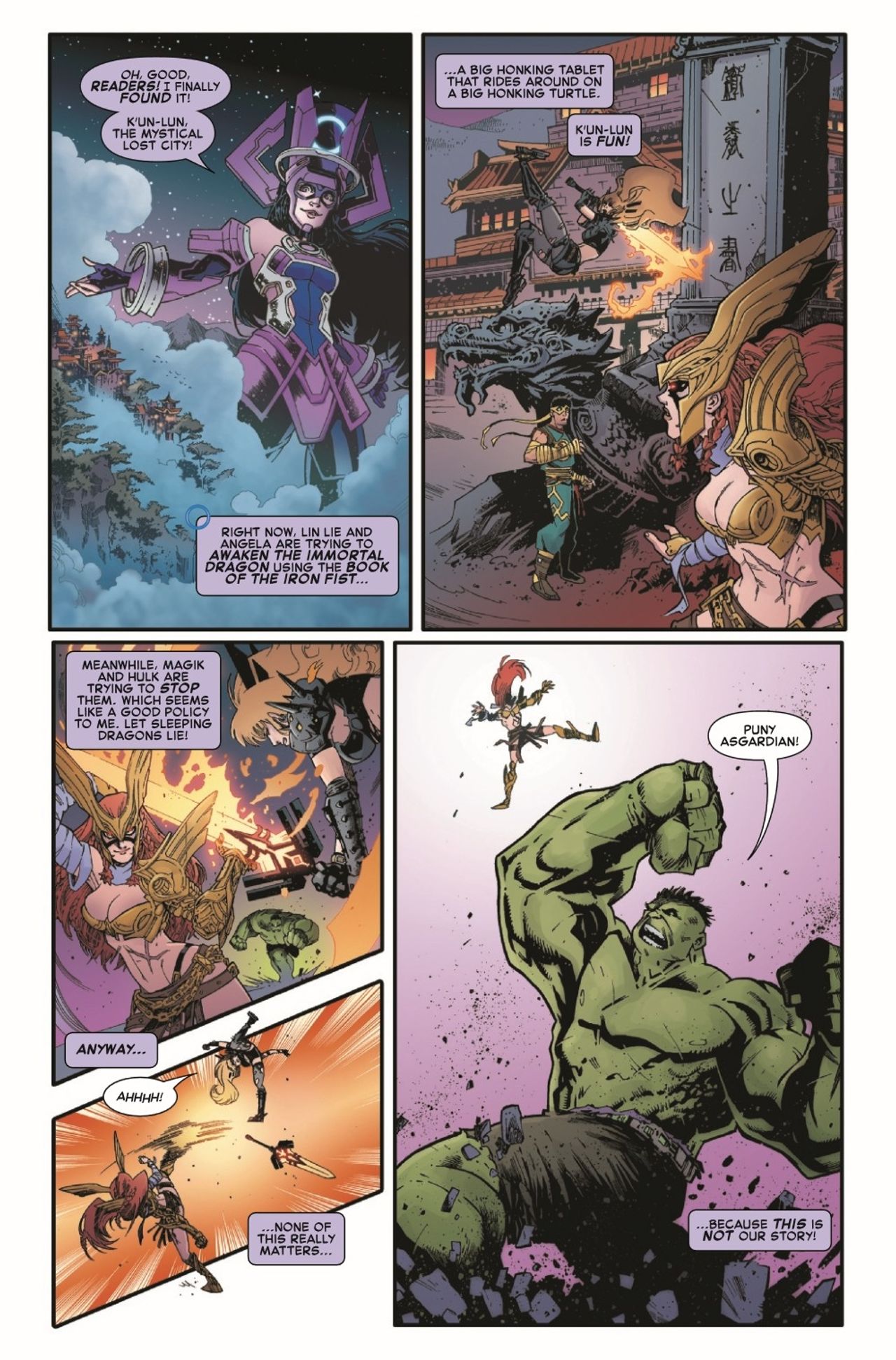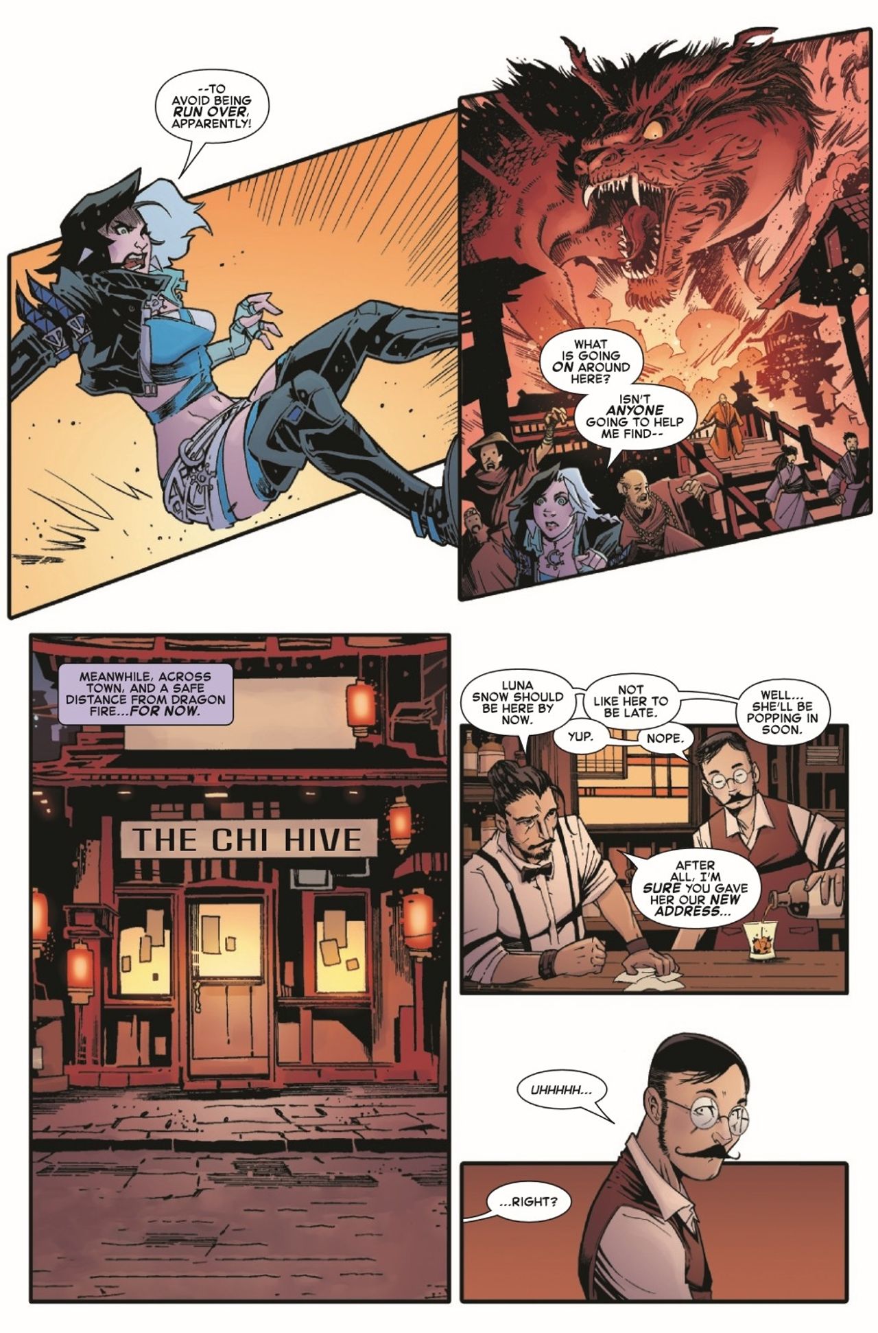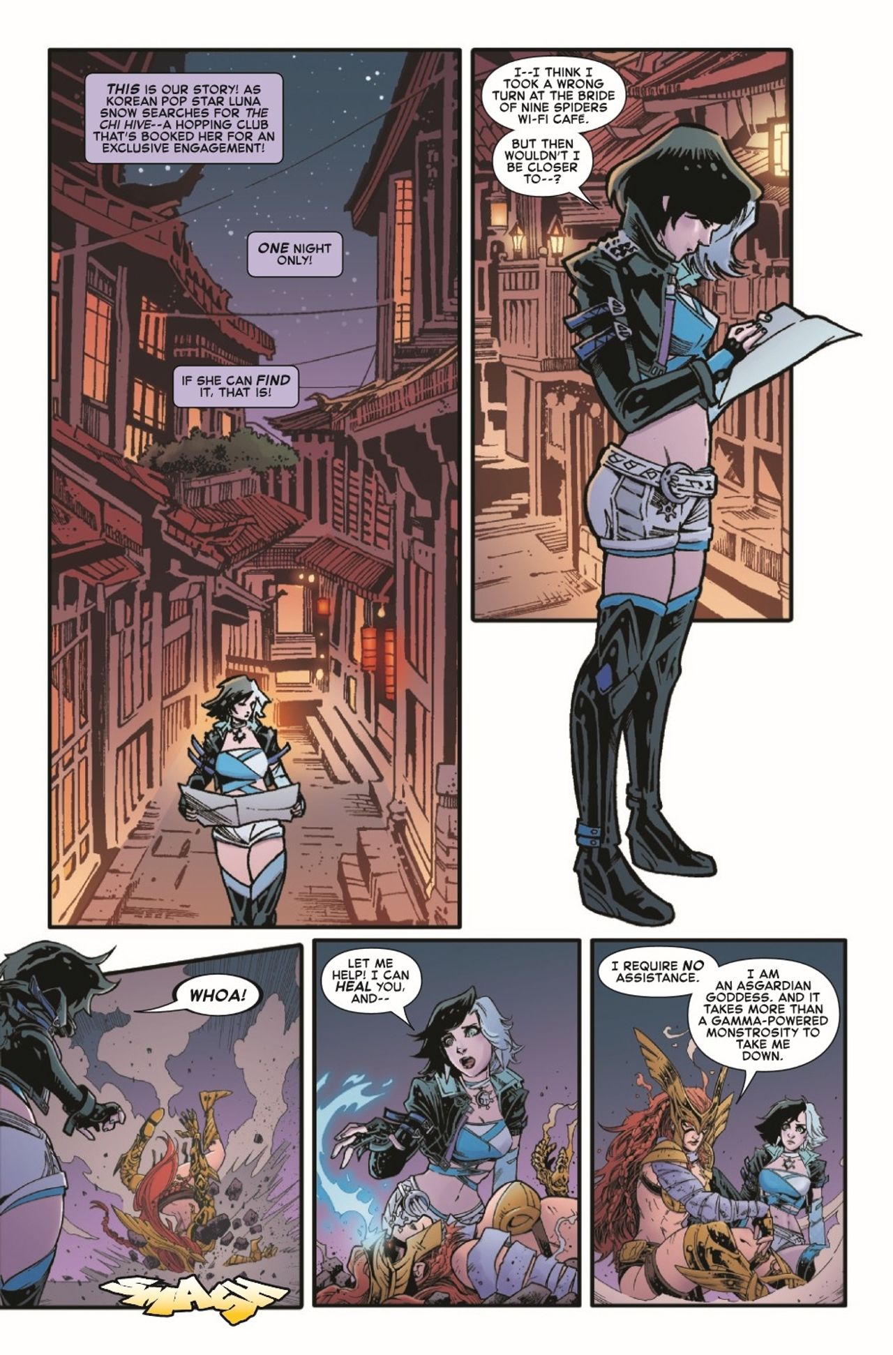 LUNA SNOW IN SEARCH OF A HEAVENLY VENUE! Drinking games, Doombots and Squids, oh my! Luna Snow's ready to bring the house down with a legendary concert at the mystical Chi Hive tavern in K'un-Lun - or at least she will be, if she ever finds it! Lost in the magical city, Luna lands smack in the middle of a battle between Lin Lie and Angela, who are trying to awaken the Immortal Dragon using the Book of the Iron Fist. Standing in their way? Magik and Hulk, who are desperate to stop them at all costs! Can Luna survive the chaos and still make it to her gig, or will the Chi Hive never hear her songs?