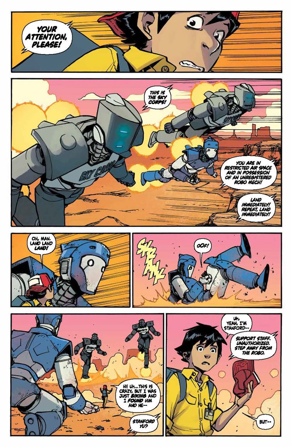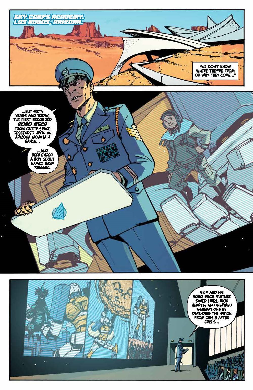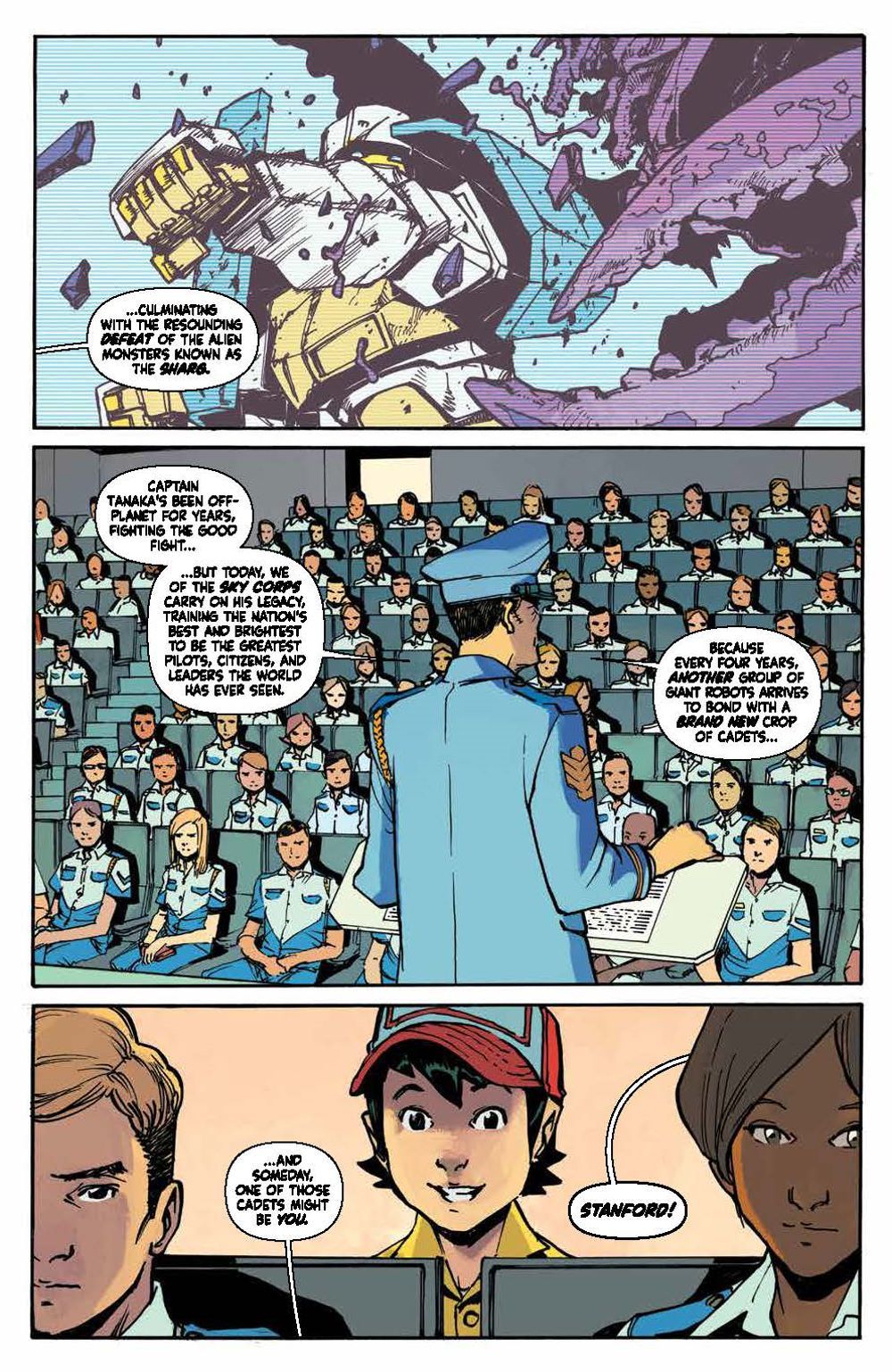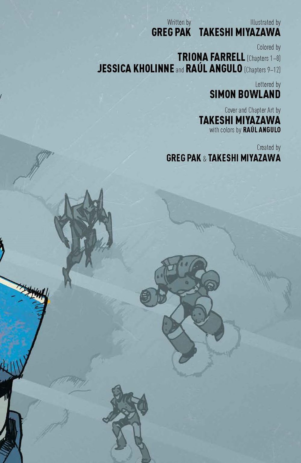 Every four years, giant sentient robots from outer space come to Earth and bond forever with a brand new crop of Sky Corps Academy cadets. But this time, instead of a cadet, one mech bonds with Stanford Yu, a young kid working with his mom as a janitor at Sky Corps. This is the opportunity of a lifetime for Stanford, but first he'll have to earn the trust of his classmates and survive an uncompromising enemy…the Sharg!. Bestselling author Greg Pak (Ronin Island, Planet Hulk) and fan-favorite artist Takeshi Miyazawa (Runaways, Ms. Marvel) bring to life this underdog story as Stanford and the newest team of Cadets and Robos face relentless training, an alien invasion, and the threat of losing themselves and human existence. They'll realize the true sacrifice that comes with duty and service and what makes a hero in this full collection of Mech Cadets perfect as a jumping on point ahead of the animated series on Netflix! Collects Mech Cadet Yu #1–12.