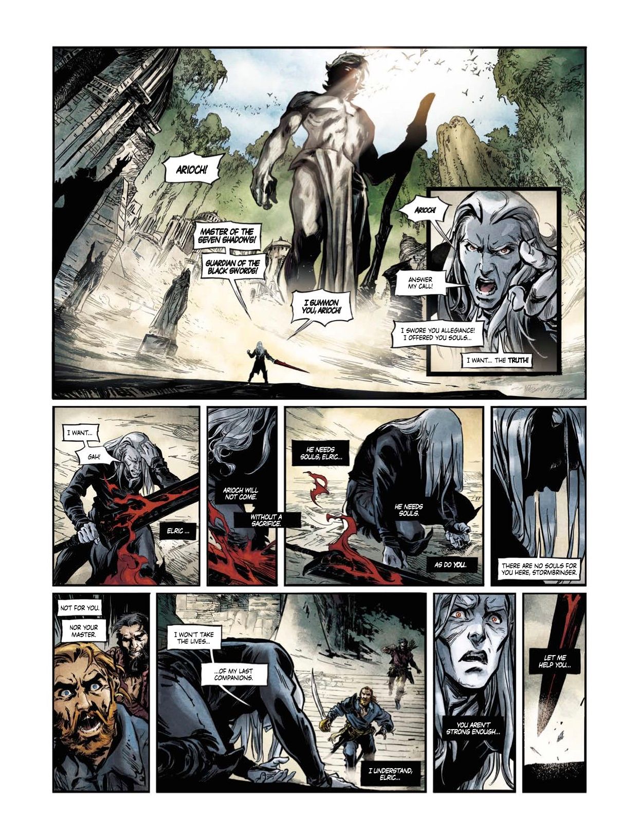 A stunning comic adaptation of the classic Elric of Melniboné novels by Michael Moorcock! The albino emperor, Elric of Melniboné, is exiled from his home and cursed to walk the land under the influence of the god of chaos, Arioch. With his sword Stormbringer, Elric must find his way through the unknown, unaware he is being sought by his long-lost love. But is she looking to re-kindle their love, or something far more sinister?
