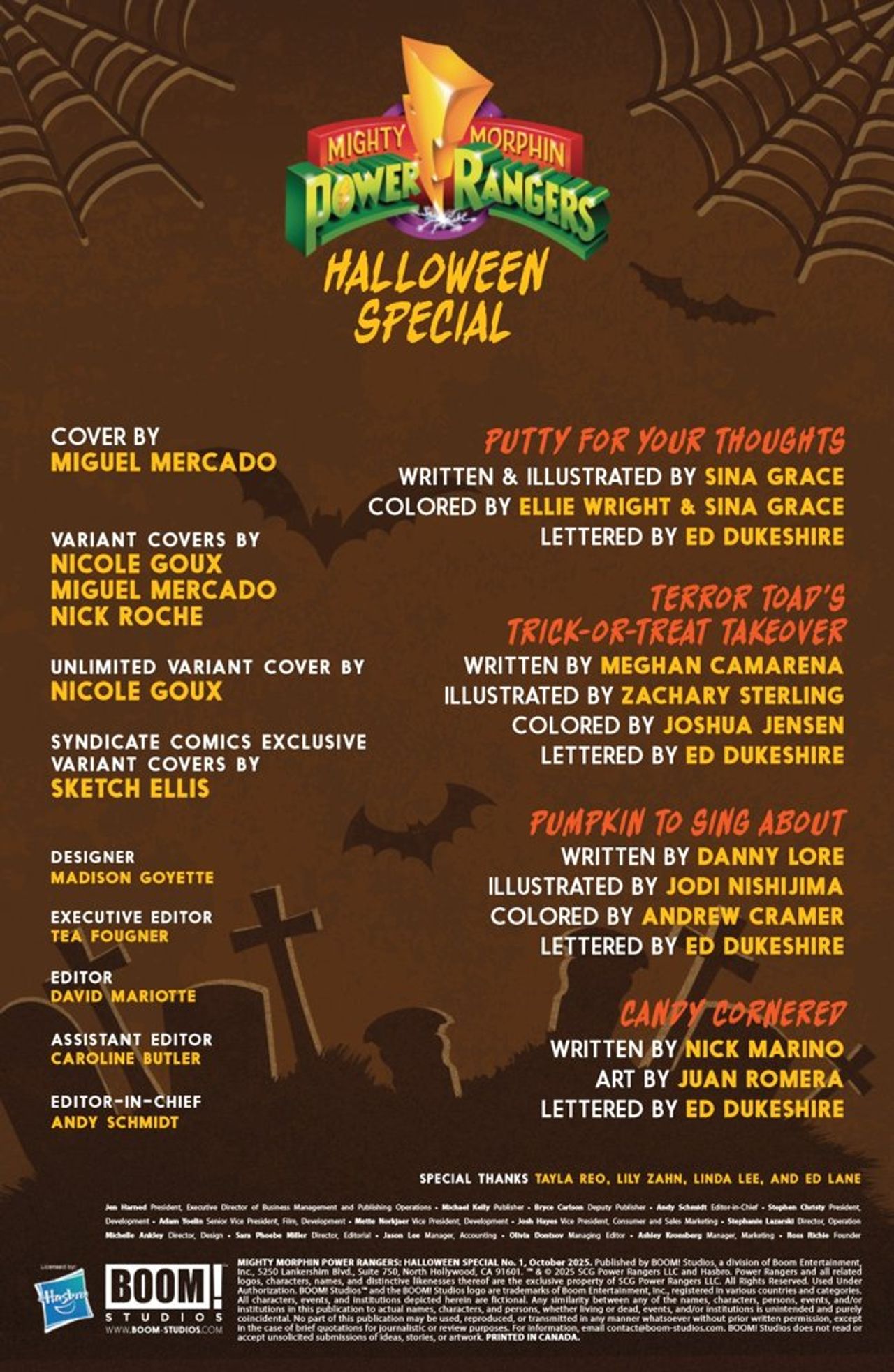 The spookiest showdown in Angel Grove history is here! For the first time ever, it's a Power Rangers Halloween one-shot—featuring the return of the Pumpkin Rapper and the debut of the sugary Colonel Maize! When the villains capture a bus full of kids and a few of their fellow teammates, the Rangers must swap scary stories from their most harrowing missions in order to keep hope alive.Featuring a dynamic line-up of creators for this seasonal anthology, including Hyperforce star Meghan Camarena (Radiant Pink, Radiant Black) and Mighty Morphin Power Rangers alum Sina Grace (Ghosted in L.A.)!