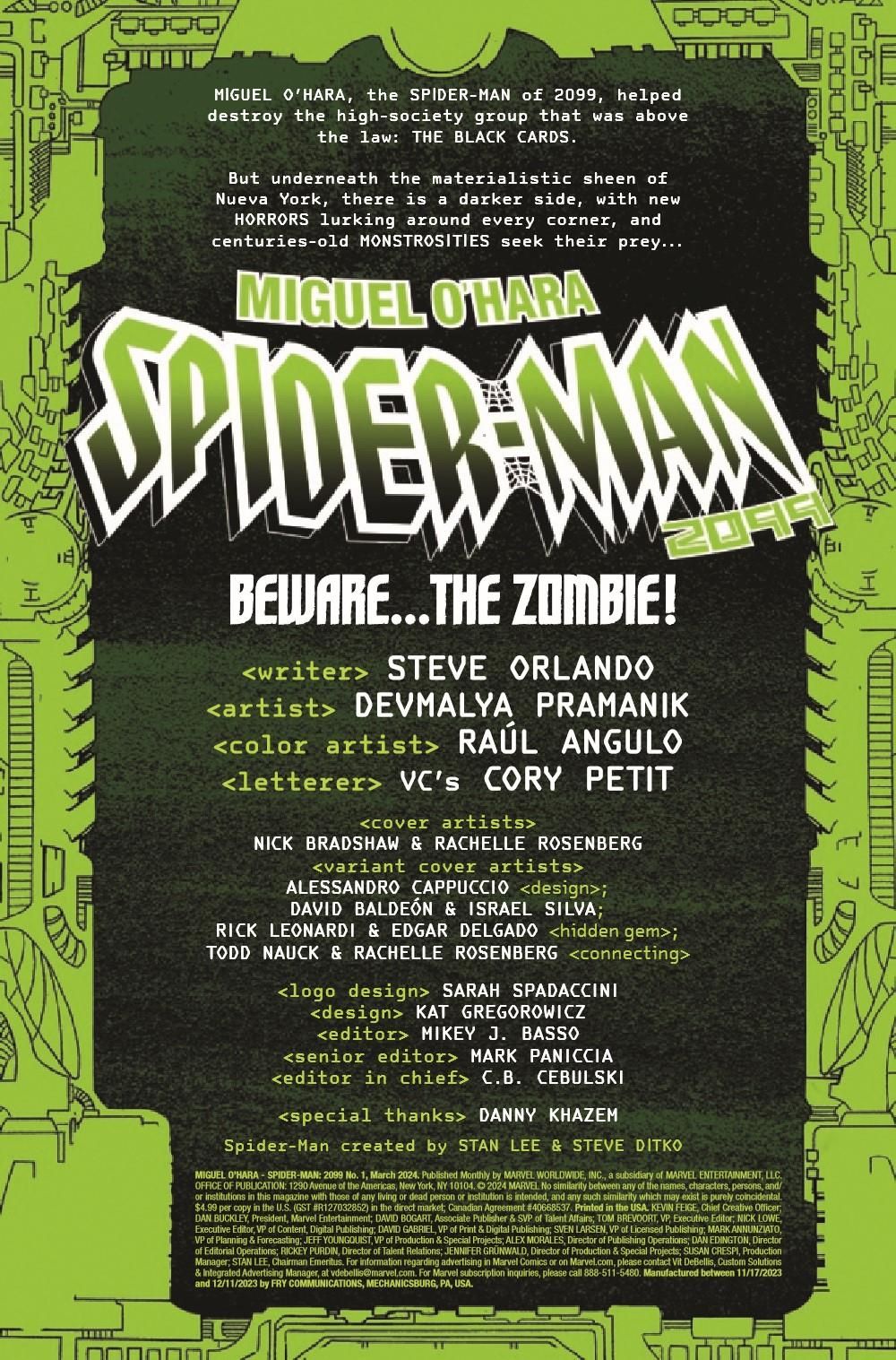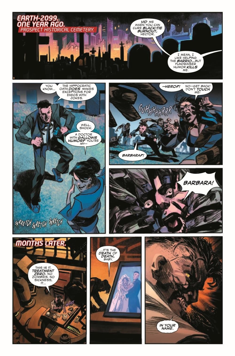 BEWARE - MARVEL ZOMBIE: 2099! MIGUEL O'HARA teams up with BLADE 2099 to take on a new horrific threat to NUEVA YORK! Introducing the MARVEL ZOMBIE of 2099! He lives! He strikes! And no spider can hold him! Will SPIDER-MAN be able to stop the ever-evolving zombie infection before it takes hold of his mother and the citizens of the Barrio?