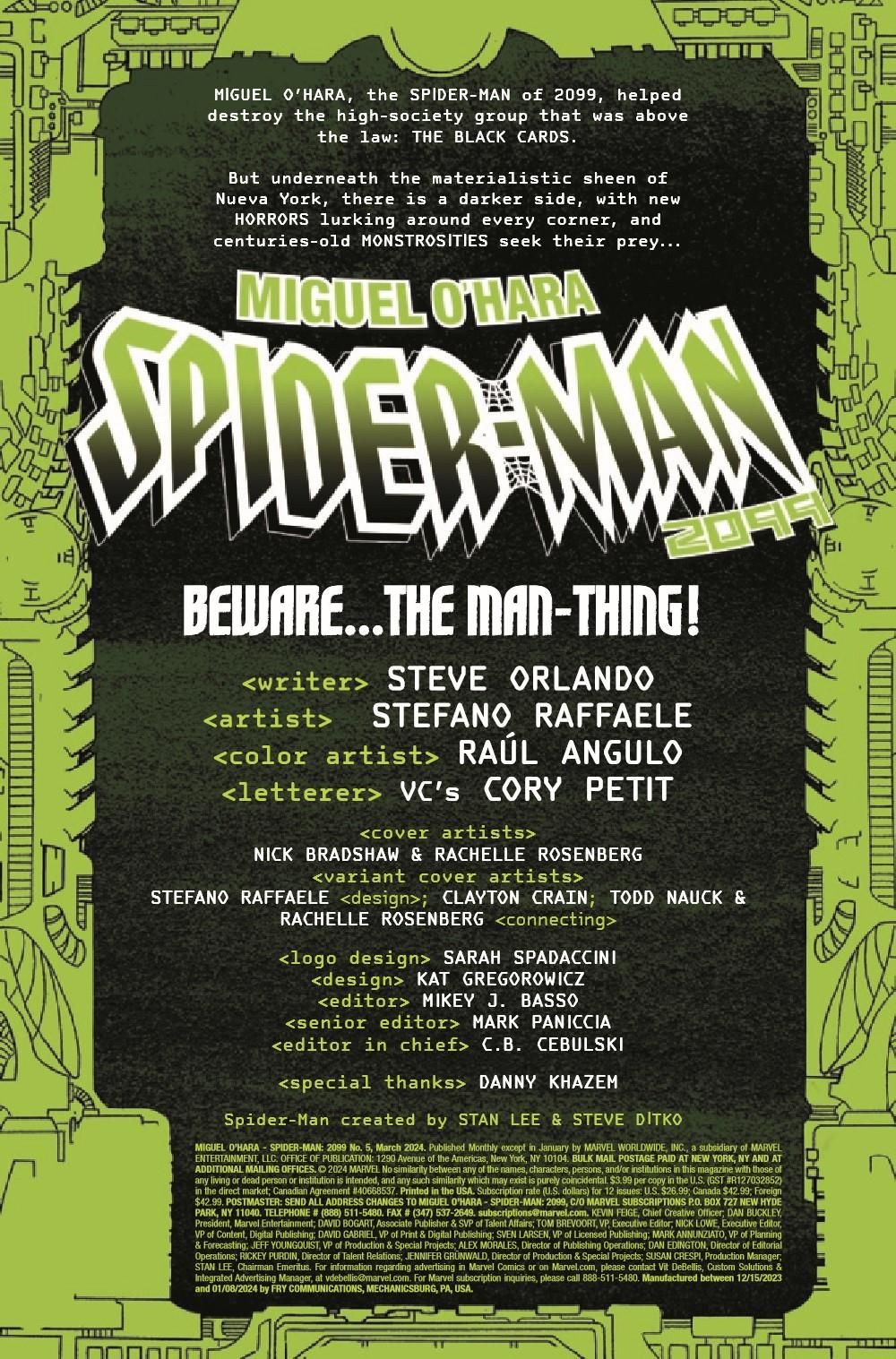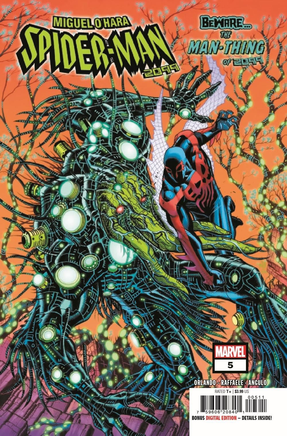 BEWARE - REBIRTH OF THE MAN-THING! SPIDER-MAN must find a way to save the lives (and data) of the people of NUEVA YORK from the touch of MAN-THING 2099! What does this new shambling monstrosity mean for the future of Nueva York? Also featuring the return of THE SPECIALIST!