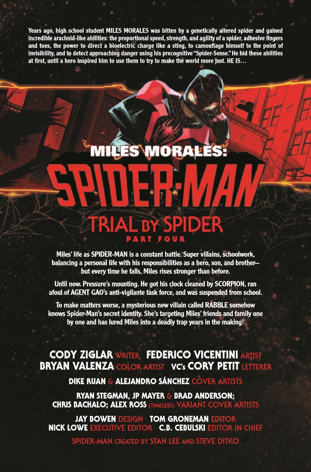 "TRIAL BY SPIDER" CONTINUES! Can MILES MORALES save everyone when he can't even save himself?! RABBLE's all-out assault has left SPIDER-MAN reeling, and he's about to spin his last web. Miles can't take much more…but Rabble's just getting started.