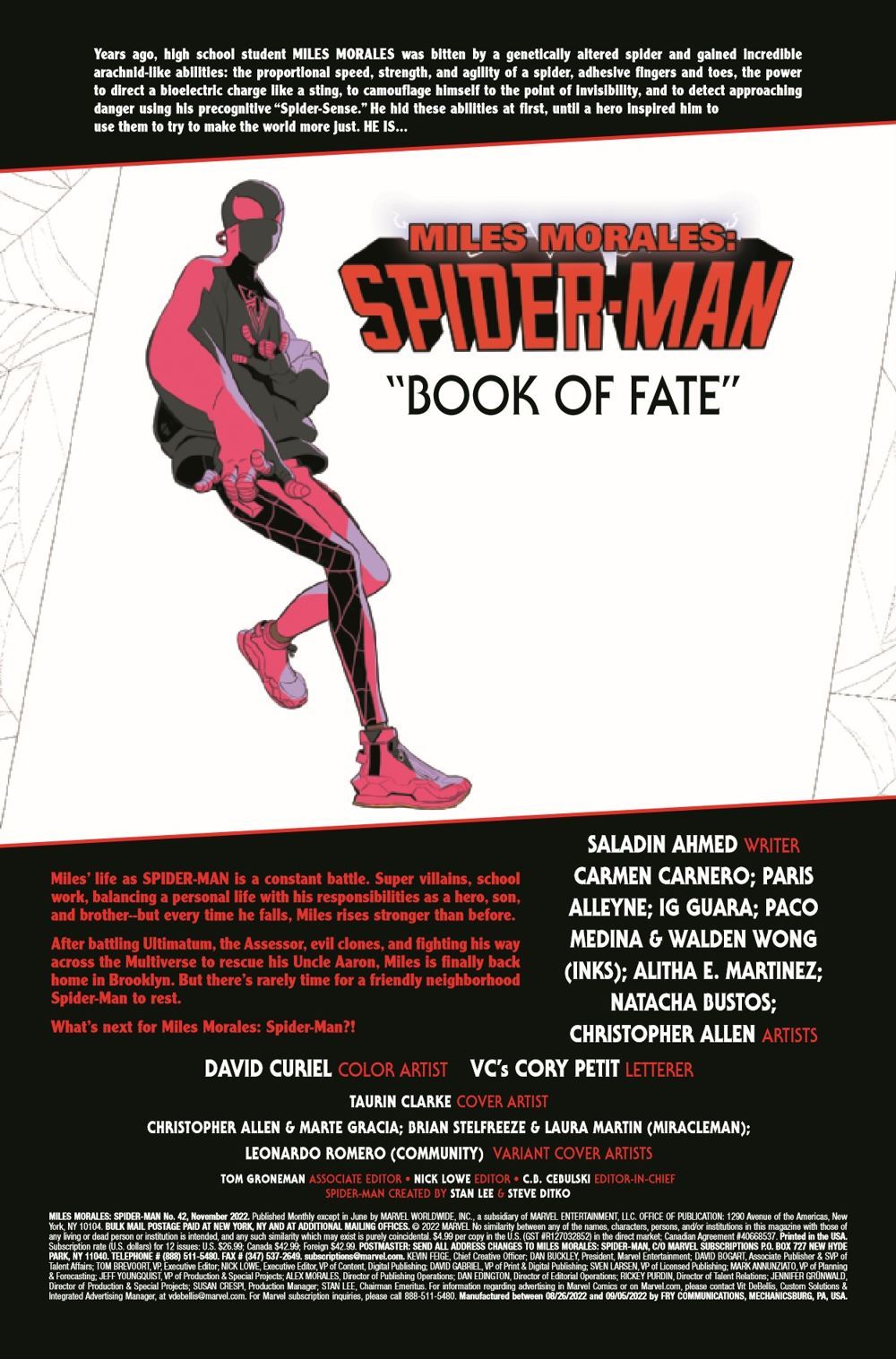 MILES MORALES' ICONIC 42ND ISSUE! As the number of the spider that bit him and the winning lottery number for Brooklyn Visions Academy, the number 42 means a lot in Miles Morales' world, and SALADIN AHMED celebrates this landmark issue with an oversized spectacular alongside amazing MILES MORALES: SPIDER-MAN artists! MILES MORALES has been through it lately - time for a little R&R now, right? Not when there's good that needs doing, and when something dark and insidious rears its ugly head on the streets of NYC, SPIDER-MAN is the only hope to end it. But Miles will need help, from his friends, his family and the most unexpected allies, if he dares to even stand a chance this time!