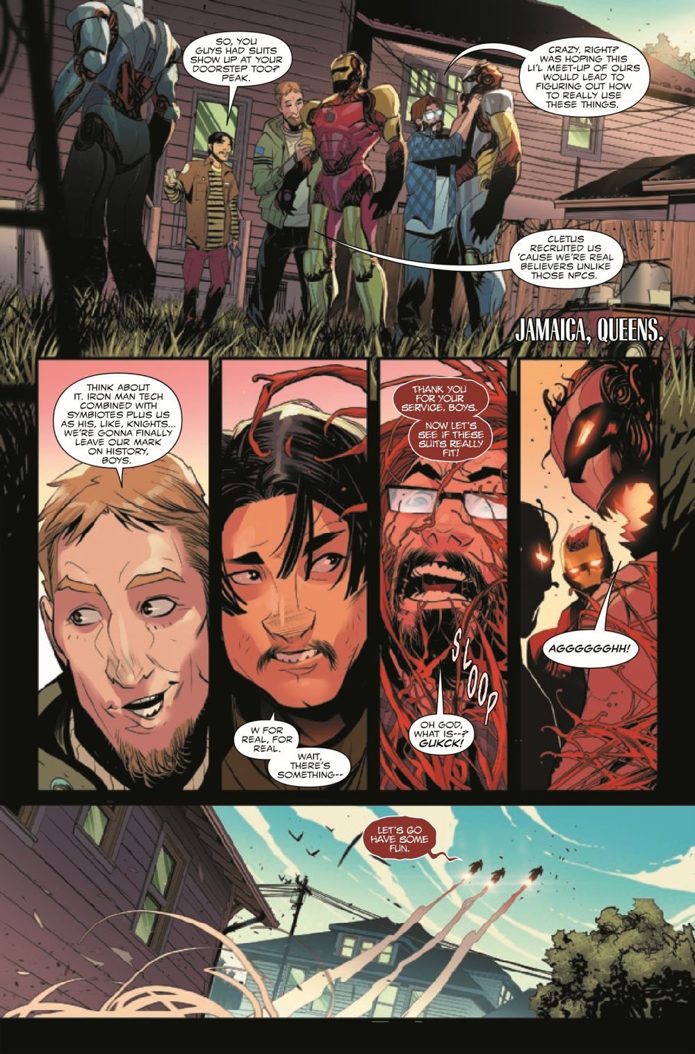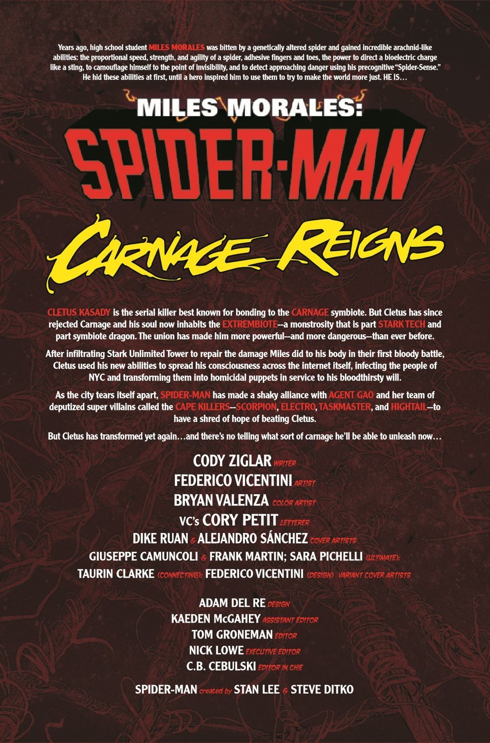 "CARNAGE REIGNS" - Part SIX! CLETUS KASADY's unleashed maximum carnage upon NYC with the awesome power of his new Extrembiote, and the only one left to stand in his way is MILES MORALES, who may have stumbled upon Cletus' one weakness - which means Cletus will stop at nothing to put Miles down for good. To have a chance at stopping him, Miles will need help from the most unexpected allies…Cletus got an upgrade - why can't Miles?!