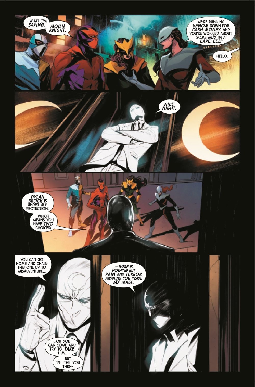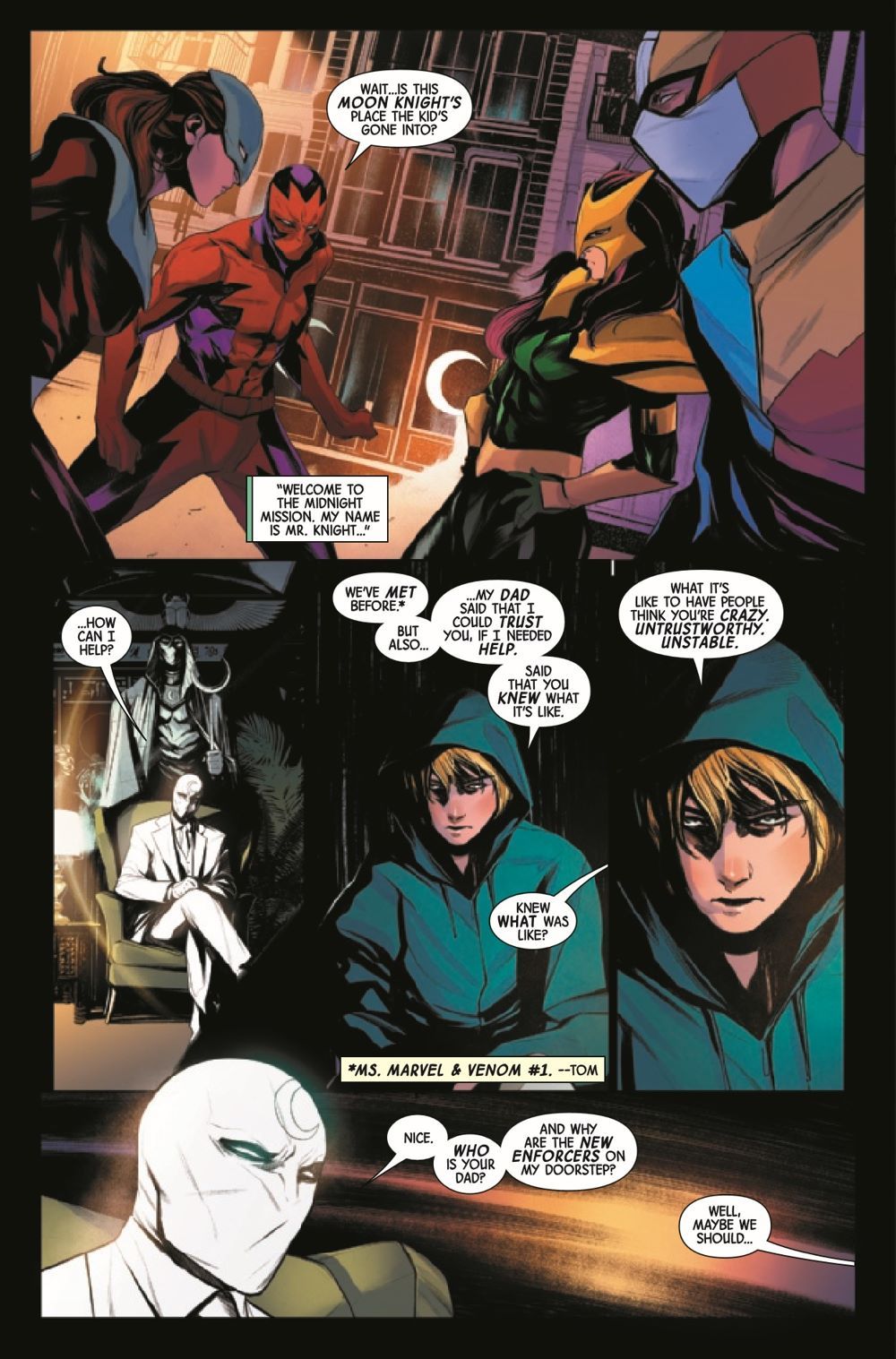 MOON KNIGHT & VENOM FIGHTING SIDE BY SIDE! The Midnight Mission is open to all travelers by night who need aid...even if they're host to the super-symbiote VENOM! When Dylan Brock asks Moon Knight for help, the two must stalk the nighttime streets together in search of justice!