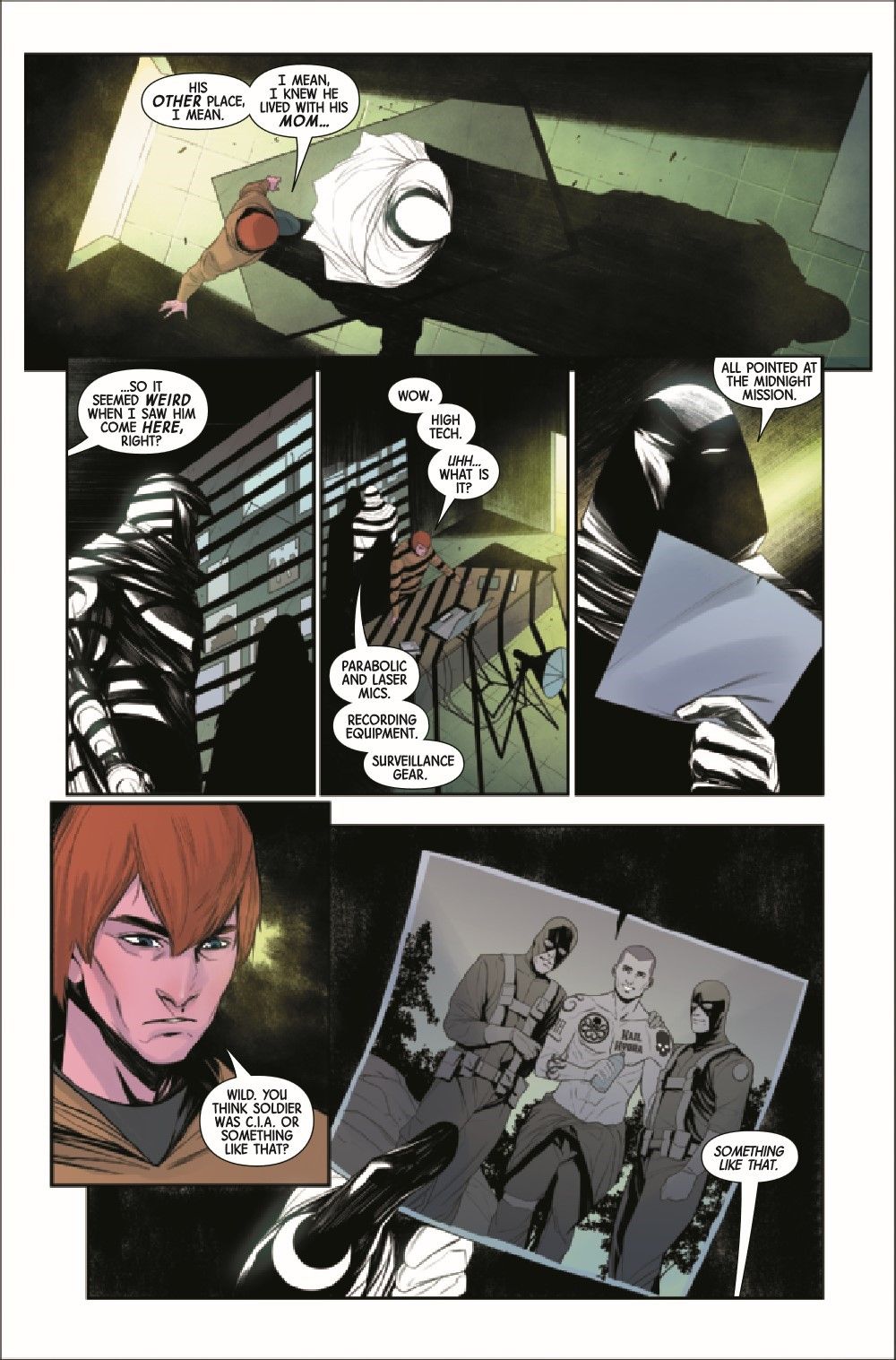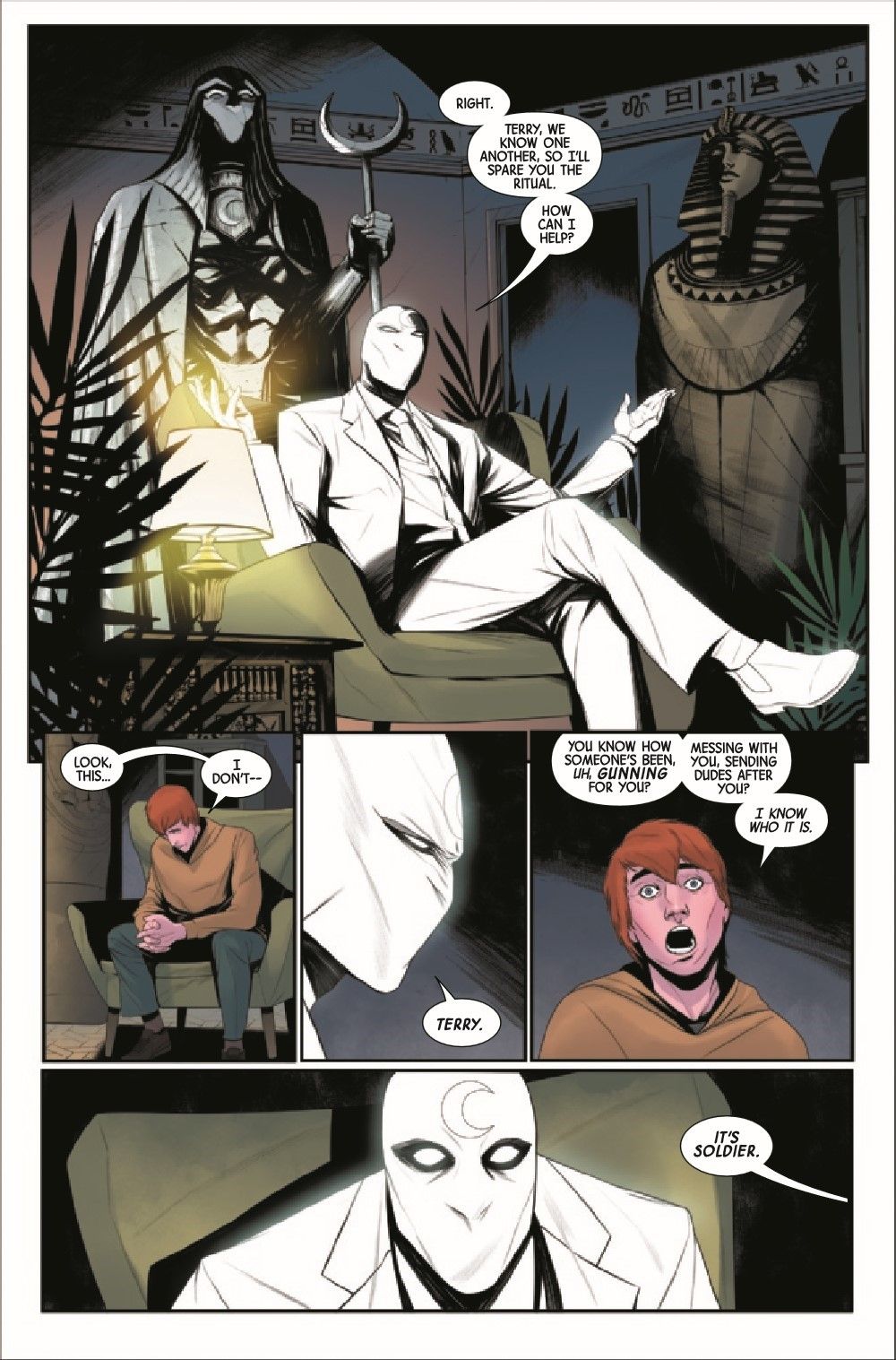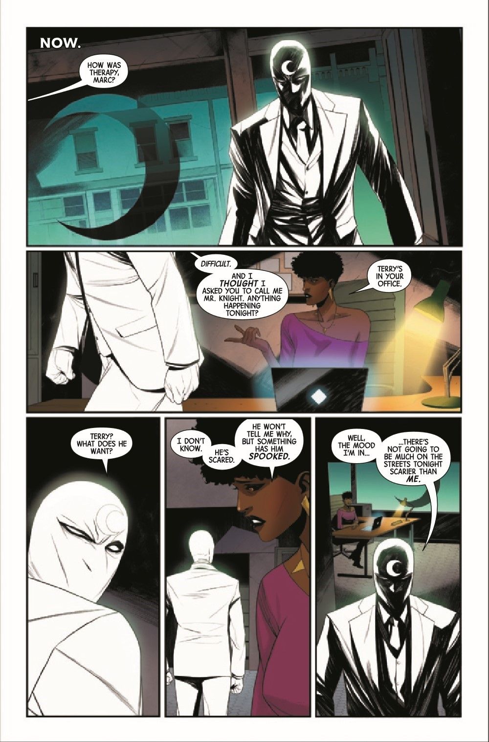 Moon Knight's hidden enemy is revealed — but revealed is not the same as caught, and he soon finds masks beneath masks as he hunts his way after his new nemesis. At the same time, Dr. Andrea Sterman pierces Moon Knight's own mask and, for the first time, gets some honest answers.
