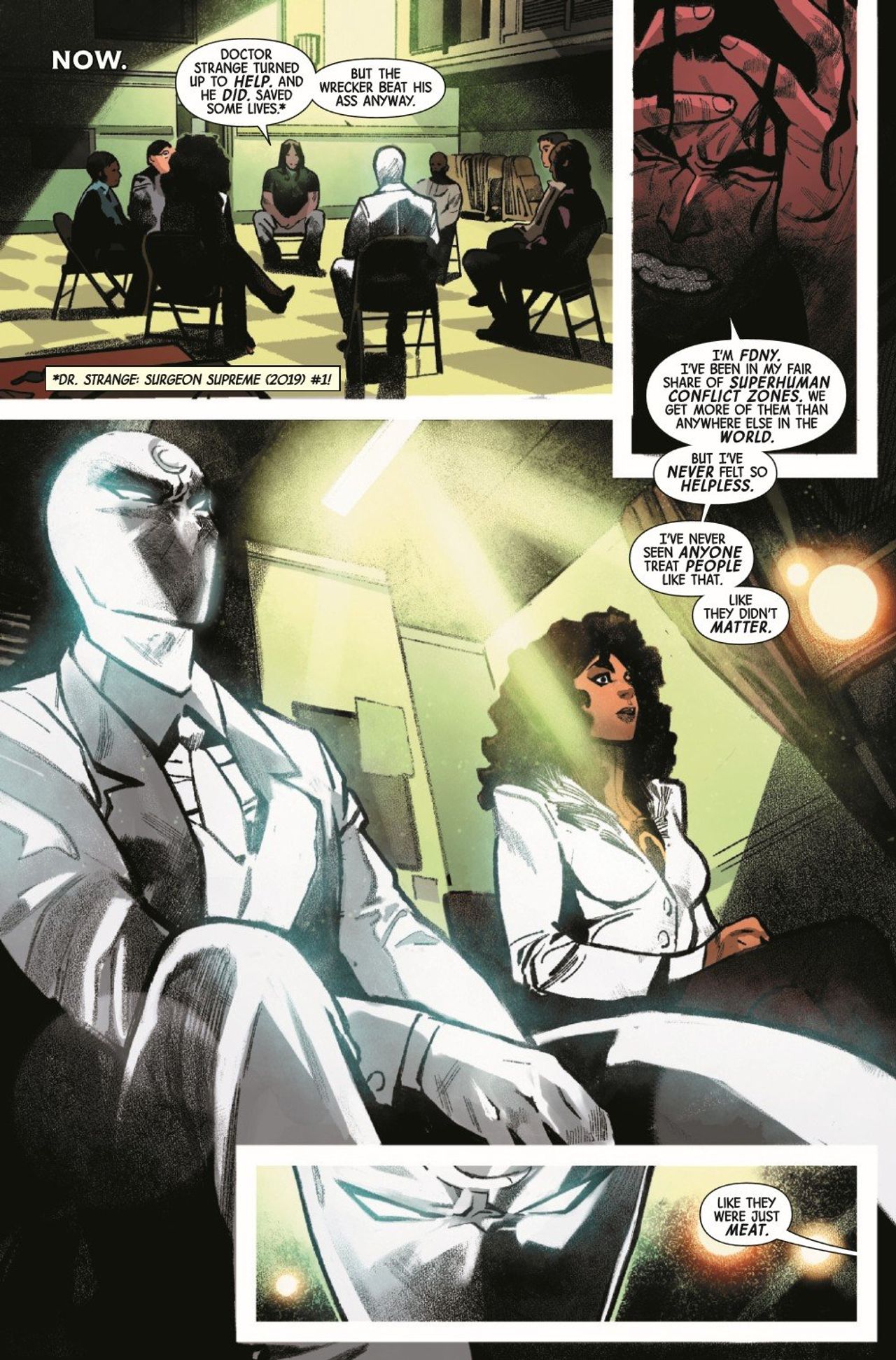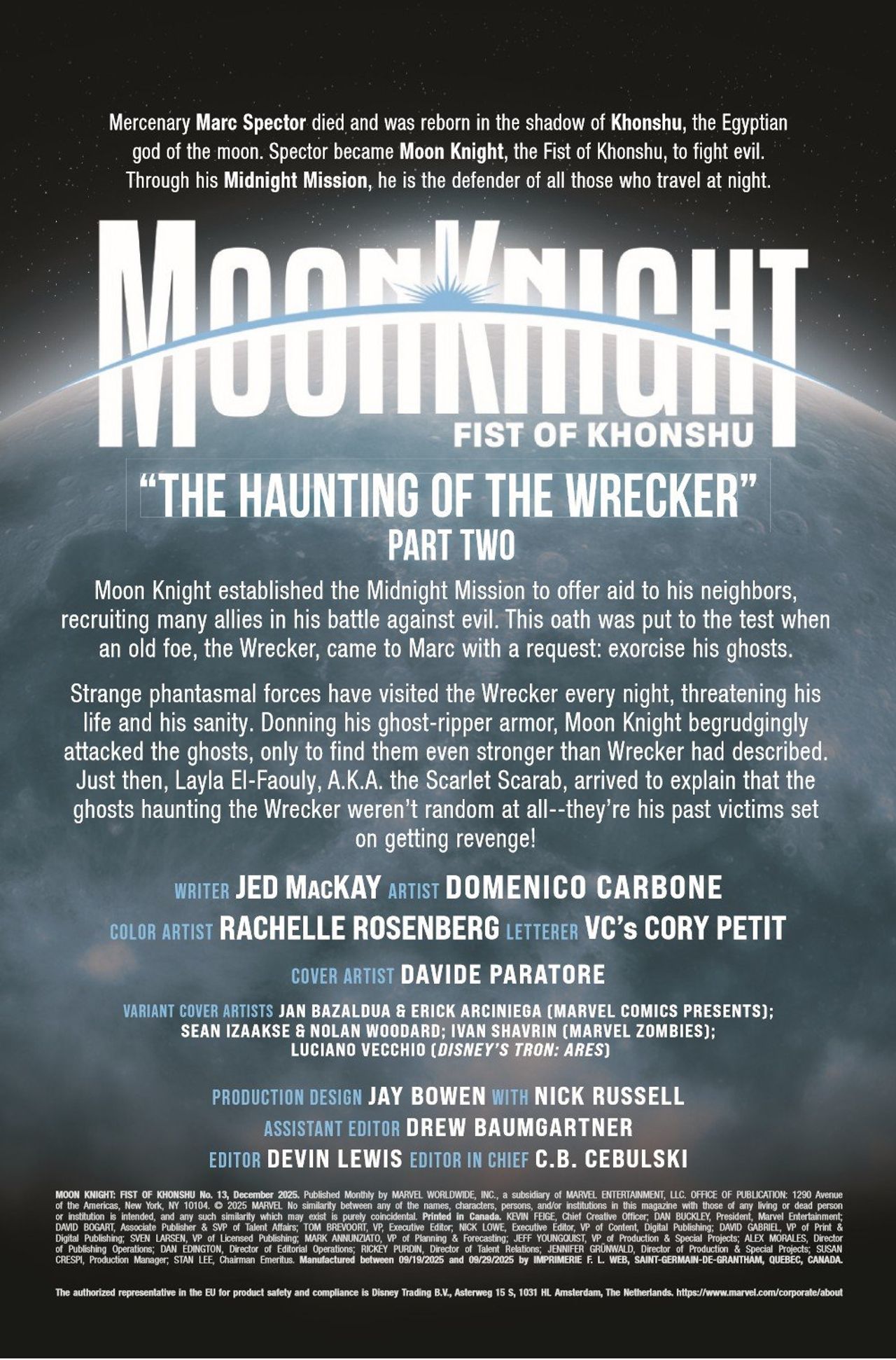 WATCHING OVER THE WRECKER! After years as a supercriminal with an Asgardian-amplified crowbar, Wrecker's past has come back to haunt him… literally as the victims of his more violent undertakings make themselves manifest as ghosts haunting his every step! Will the MOON KNIGHT, THE FIST OF KHONSHU, let the ectoplasmic entities ensnare Wrecker for good?!