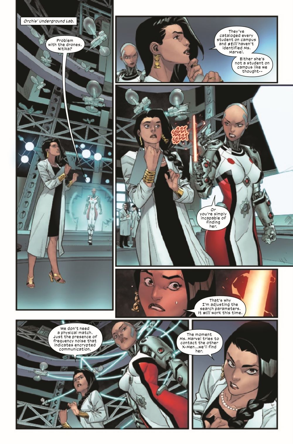 Ms. Marvel's mission makes her a target for Orchis, but they have no idea they're looking for a completely normal teenage girl in their summer science program. Thankfully, Iron Man and Emma Frost are able to stop by and show Kamala how to fly under the radar!