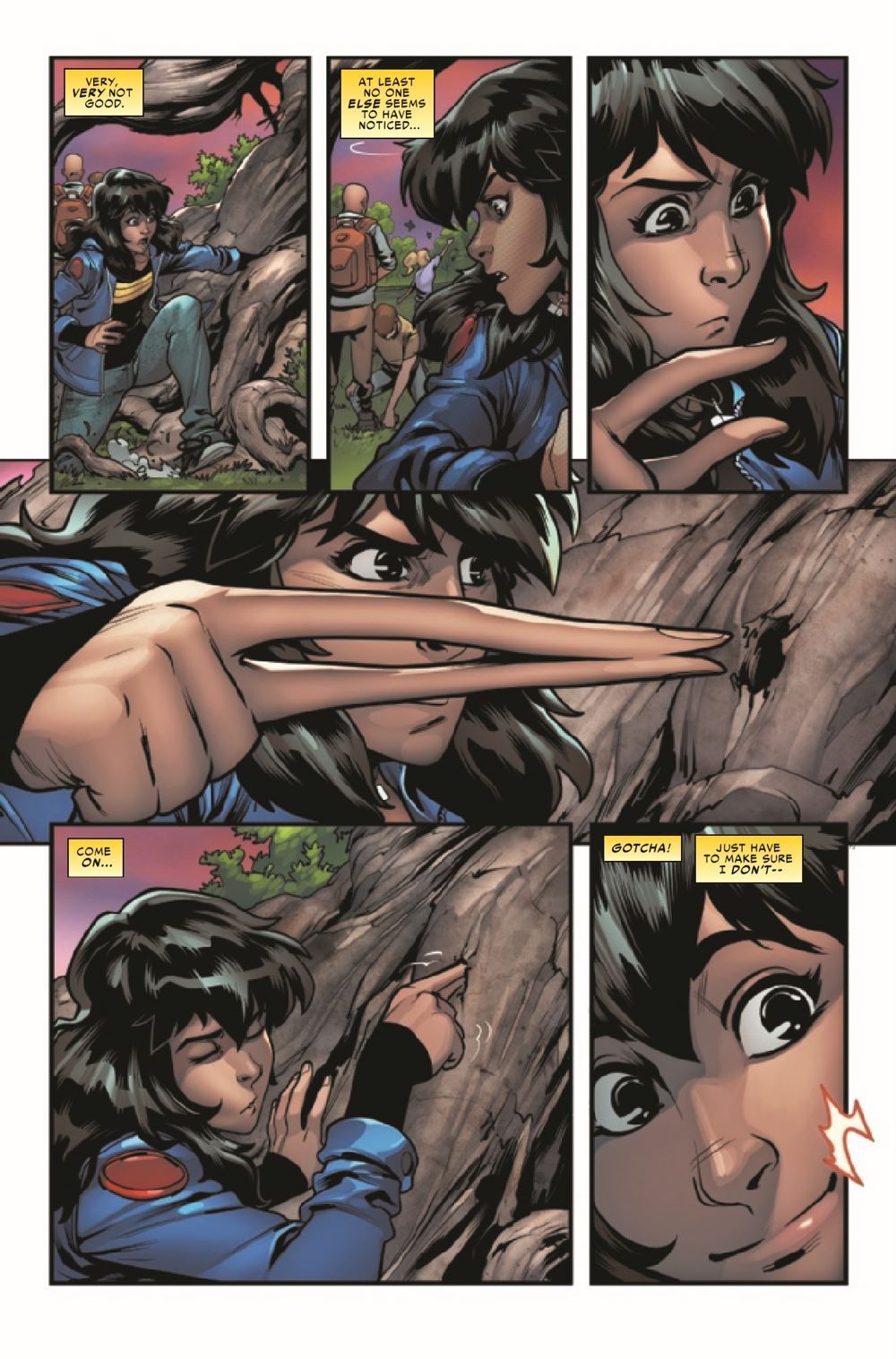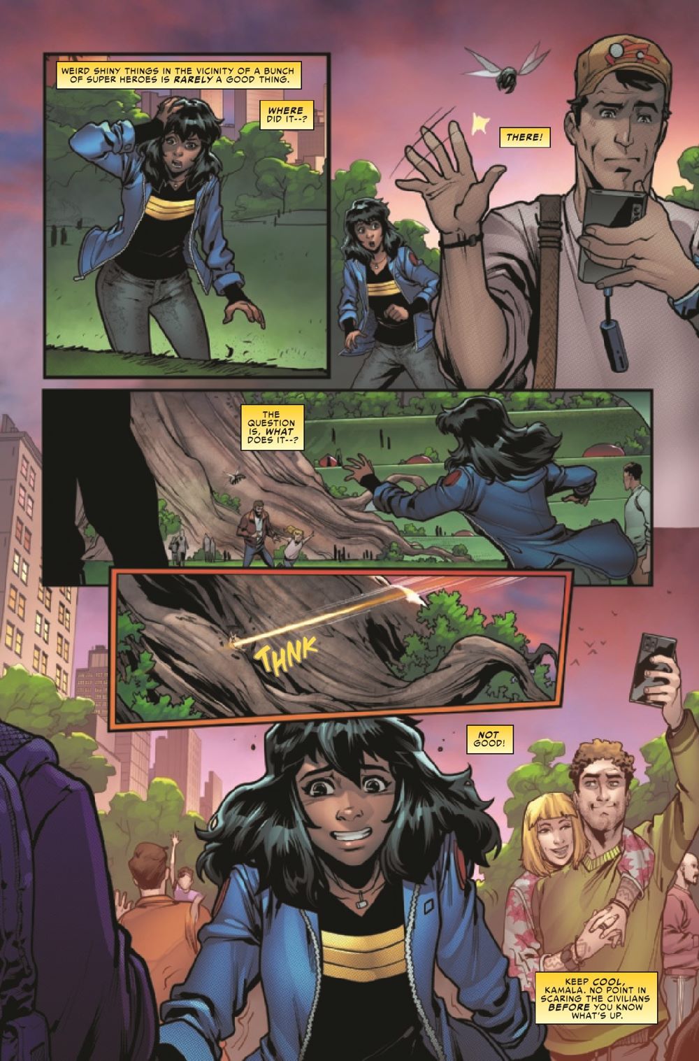 A DIRE THREAT. A DANGEROUS MYSTERY. AND ONLY THE TOUGHEST HEROES OF THE MARVEL UNIVERSE CAN SAVE THE DAY! When a mysterious threat lands in New York City, MS. MARVEL takes matters into her own embiggened hands! But with Krakoan security/tech compromised, you can bet WOLVERINE and the X-MEN won't be far behind! The best there is at what he does teams up with one of the Marvel Universe's most lauded heroes in an oversized action-packed adventure for the ages! Be here for the start of the saga, and follow through August and September as MOON KNIGHT and VENOM join Kamala Khan for the super hero spectacle of the summer!