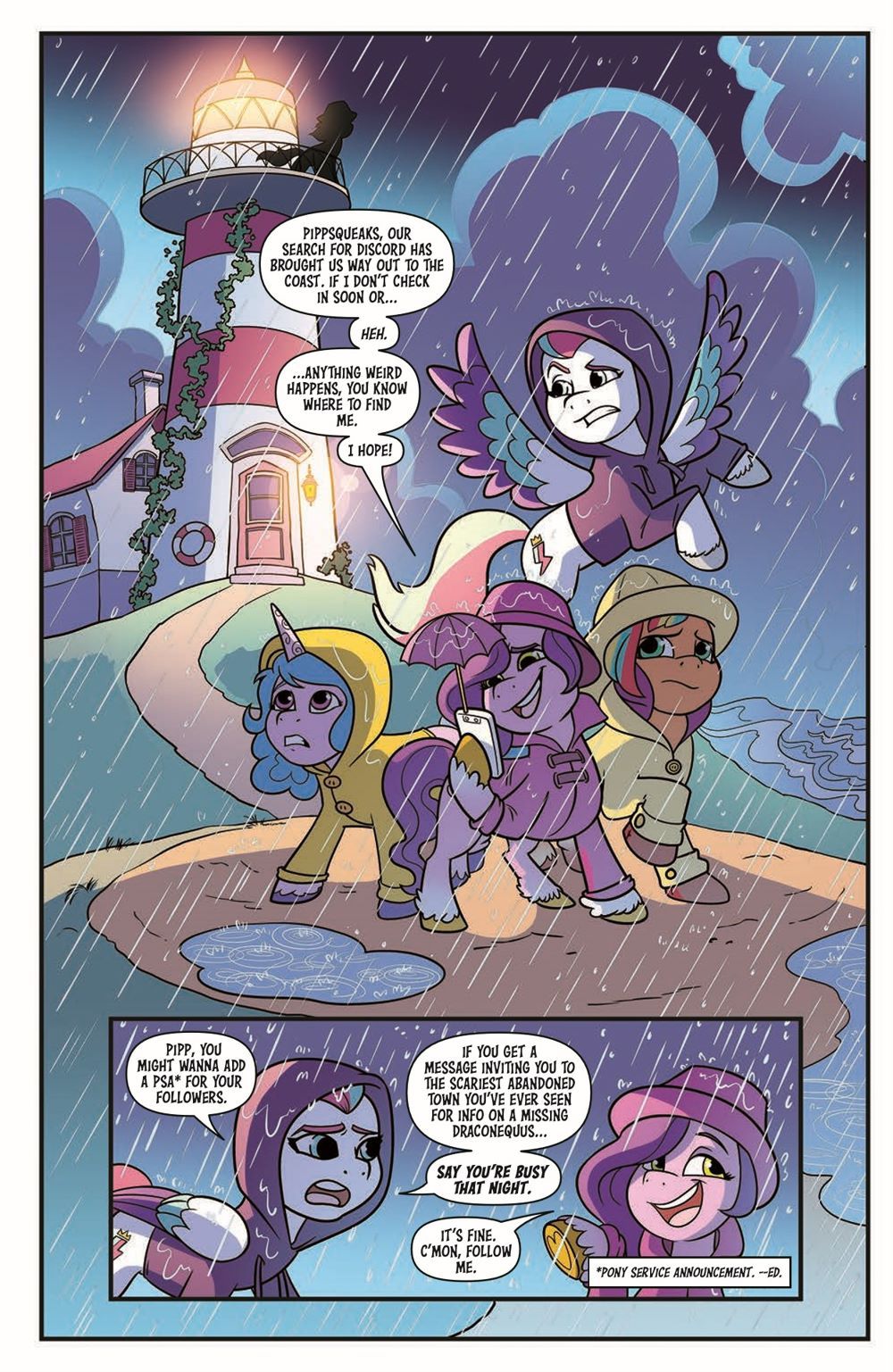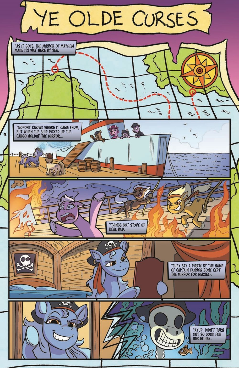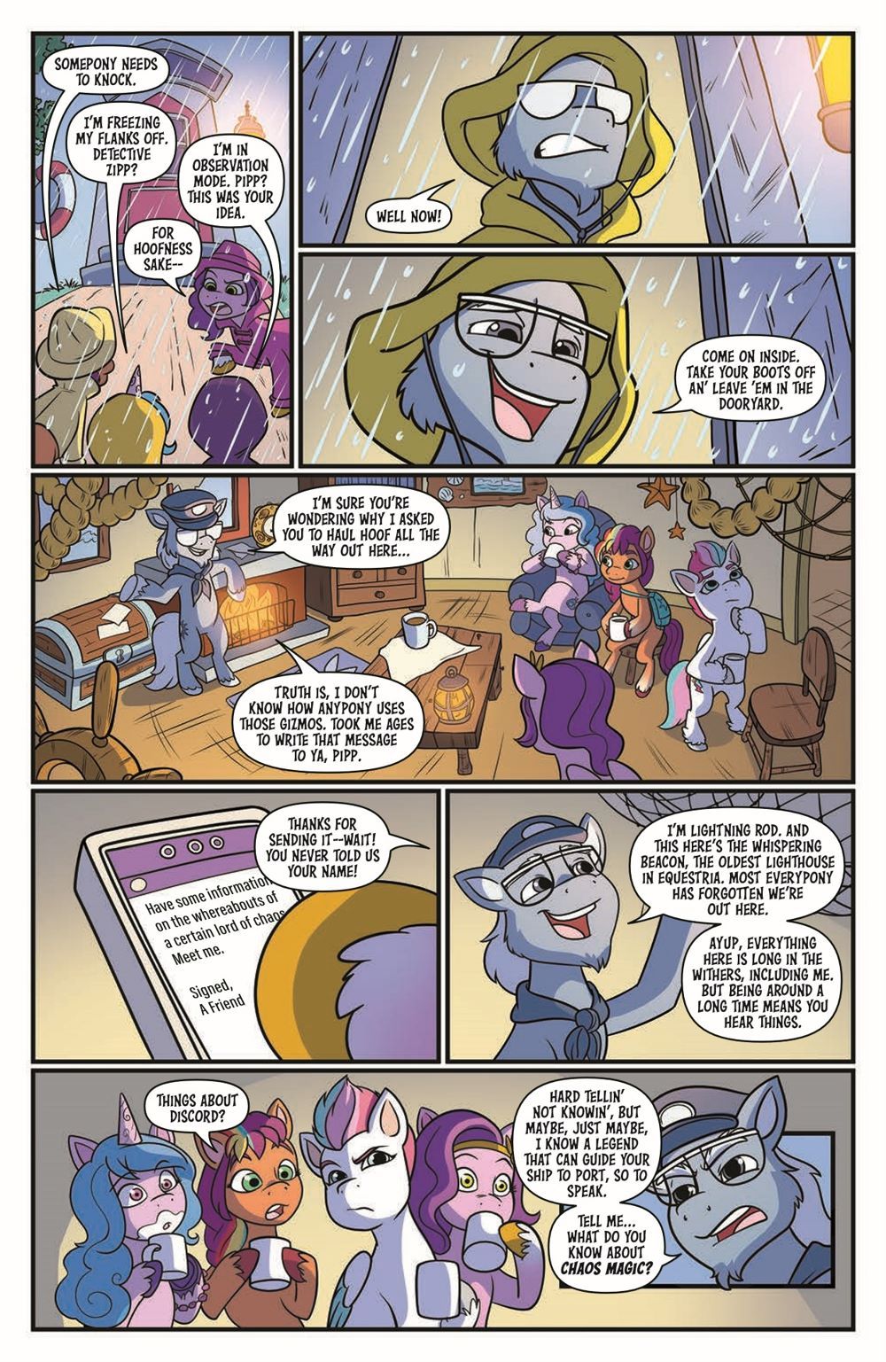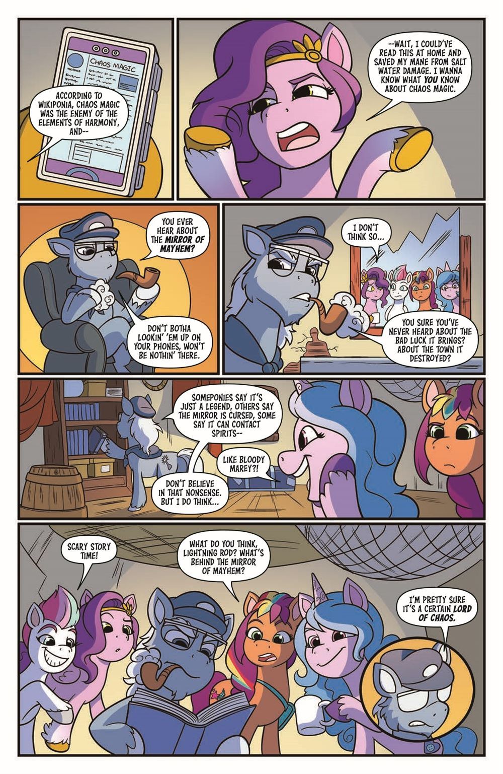 The ponies are regaled by an eccentric storyteller who gathers them around the campfire to tell tall tales of chaos magic, secret rituals, and an abandoned shop haunted by what sounds an awful lot like...Discord! Could this be the unlikely clue they've been looking for to track him down?