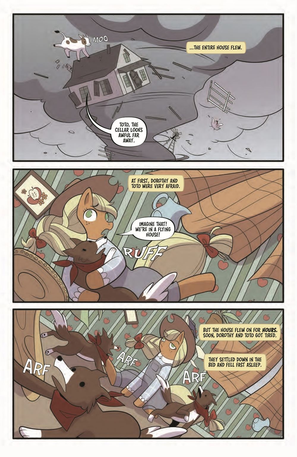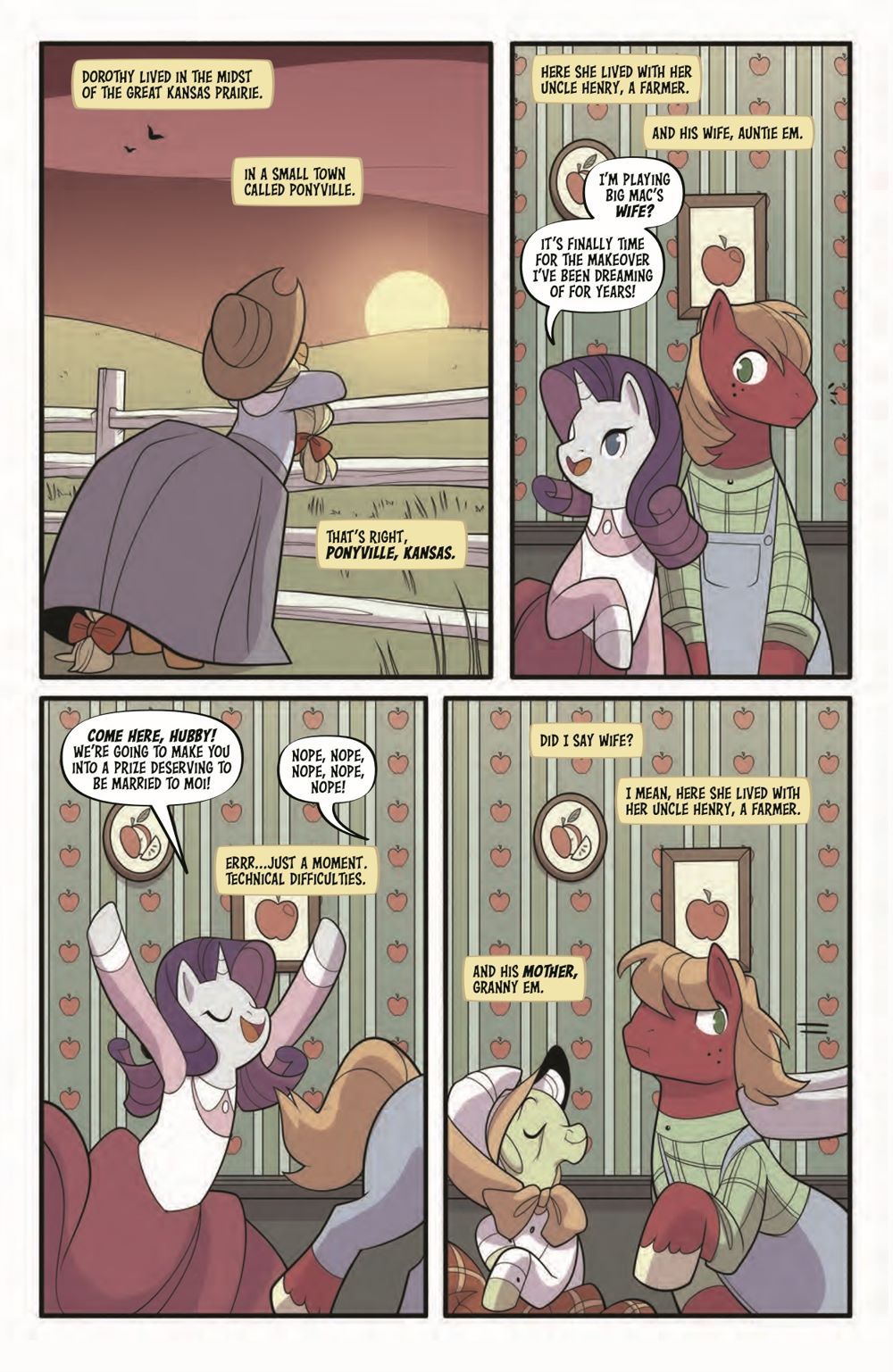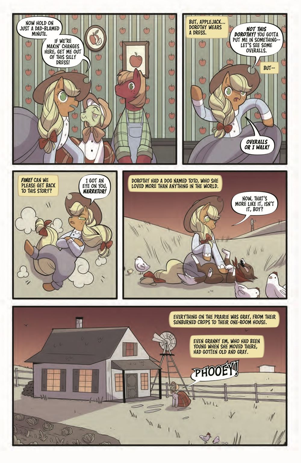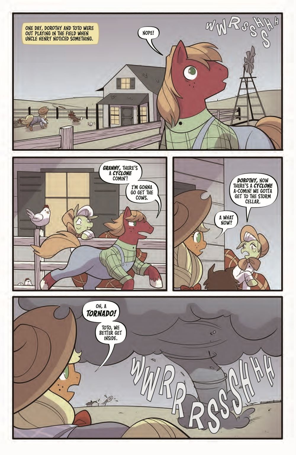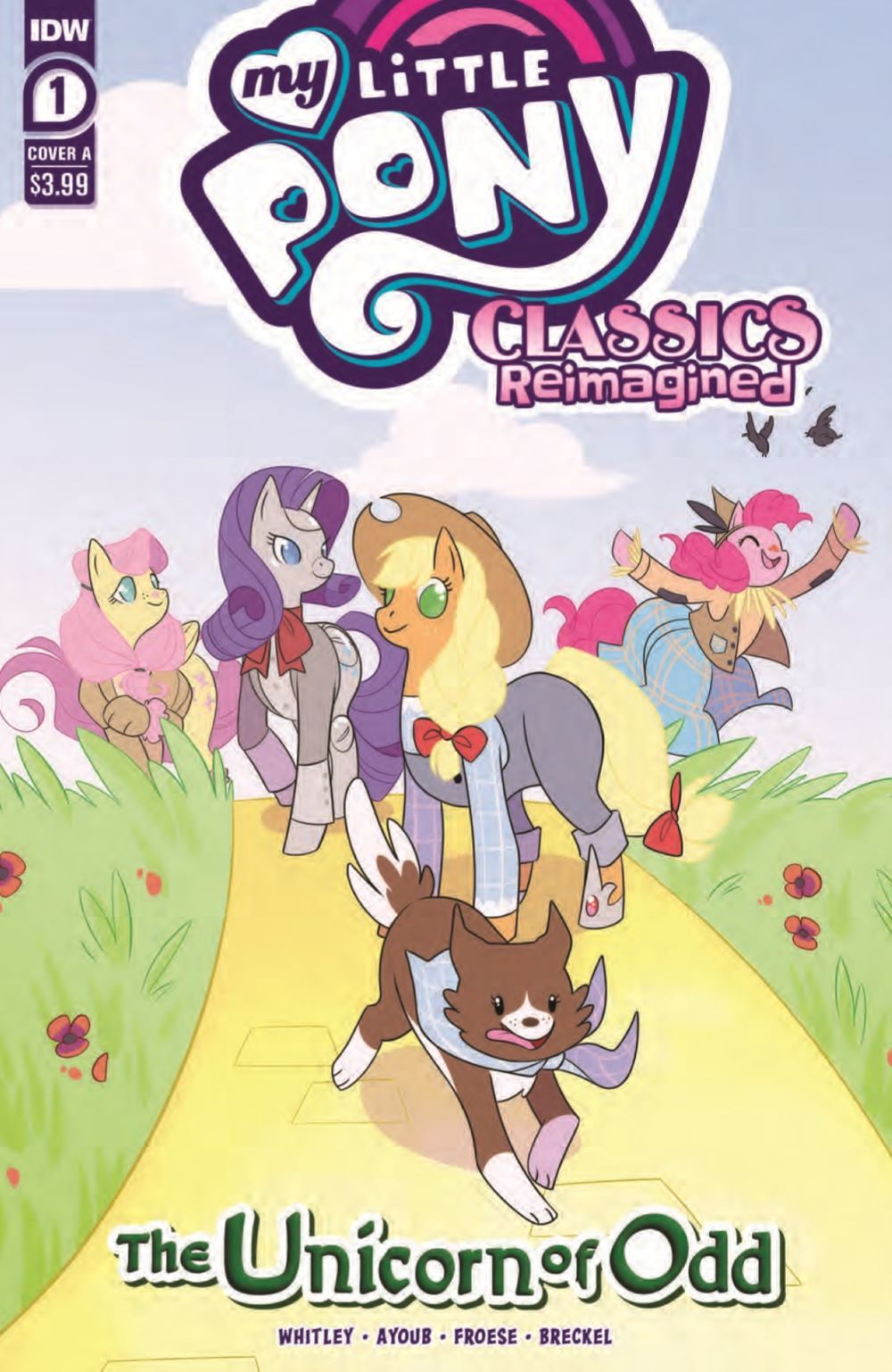 In the second installation of IDW's My Little Pony: Classics Reimagined line, L. Frank Baum's The Wonderful Wizard of Oz gets pony-fied! Travel through all of Odd with Applejack as Dorothy, Pinkie Pie as Scarecrow, Rarity as Tin Woodsmare, and Fluttershy as Cowardly Lion. In issue #1, Dorothy lives an ordinary life at her farm in Ponyville, Kansas, with her Uncle Henrie and Granny Em. But a tornado whisks her away to a magical land of Breezies, silver horseshoes, and good and evil princesses. It almost makes her want to sing... (But she won't. Those songs aren't in the public do-mane.)