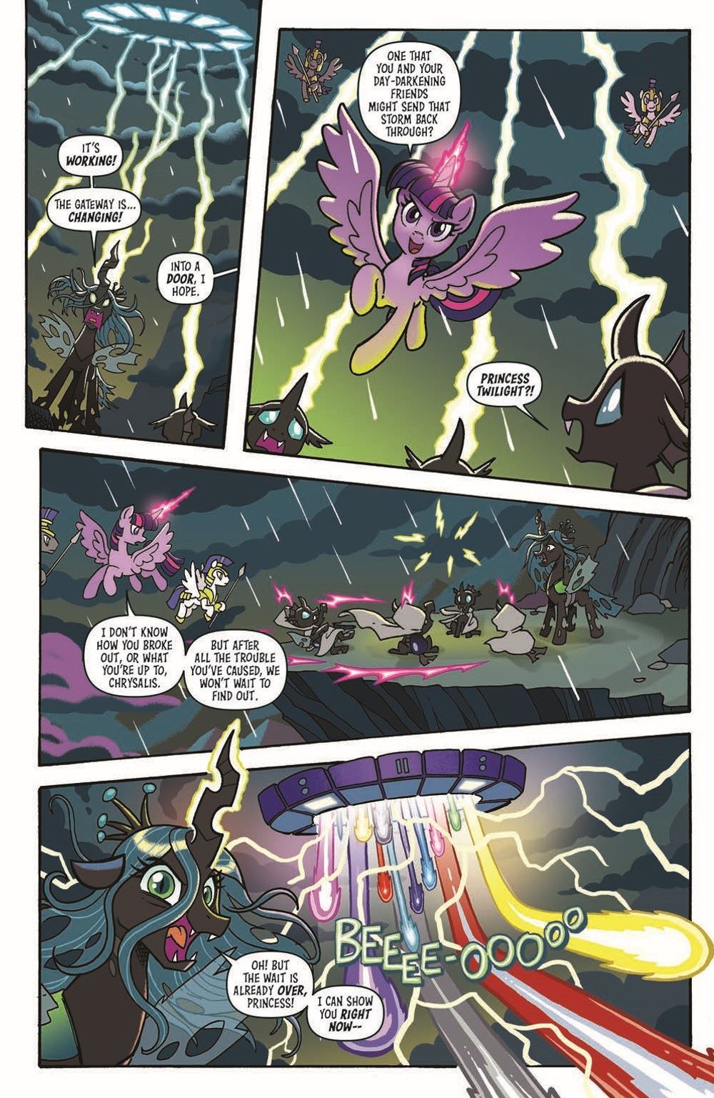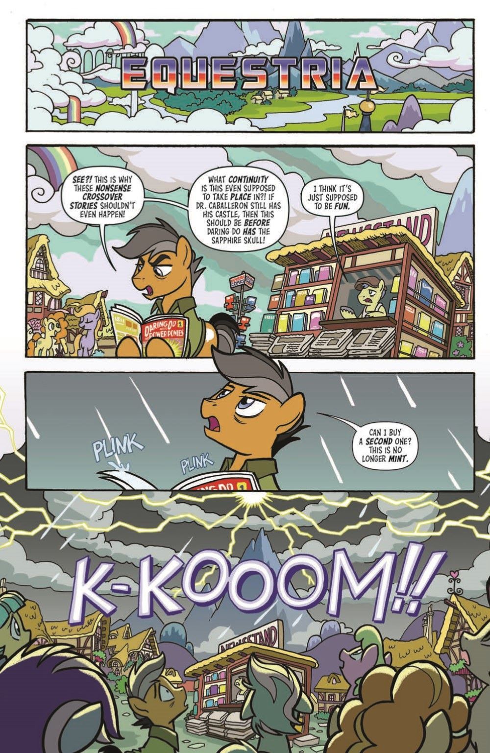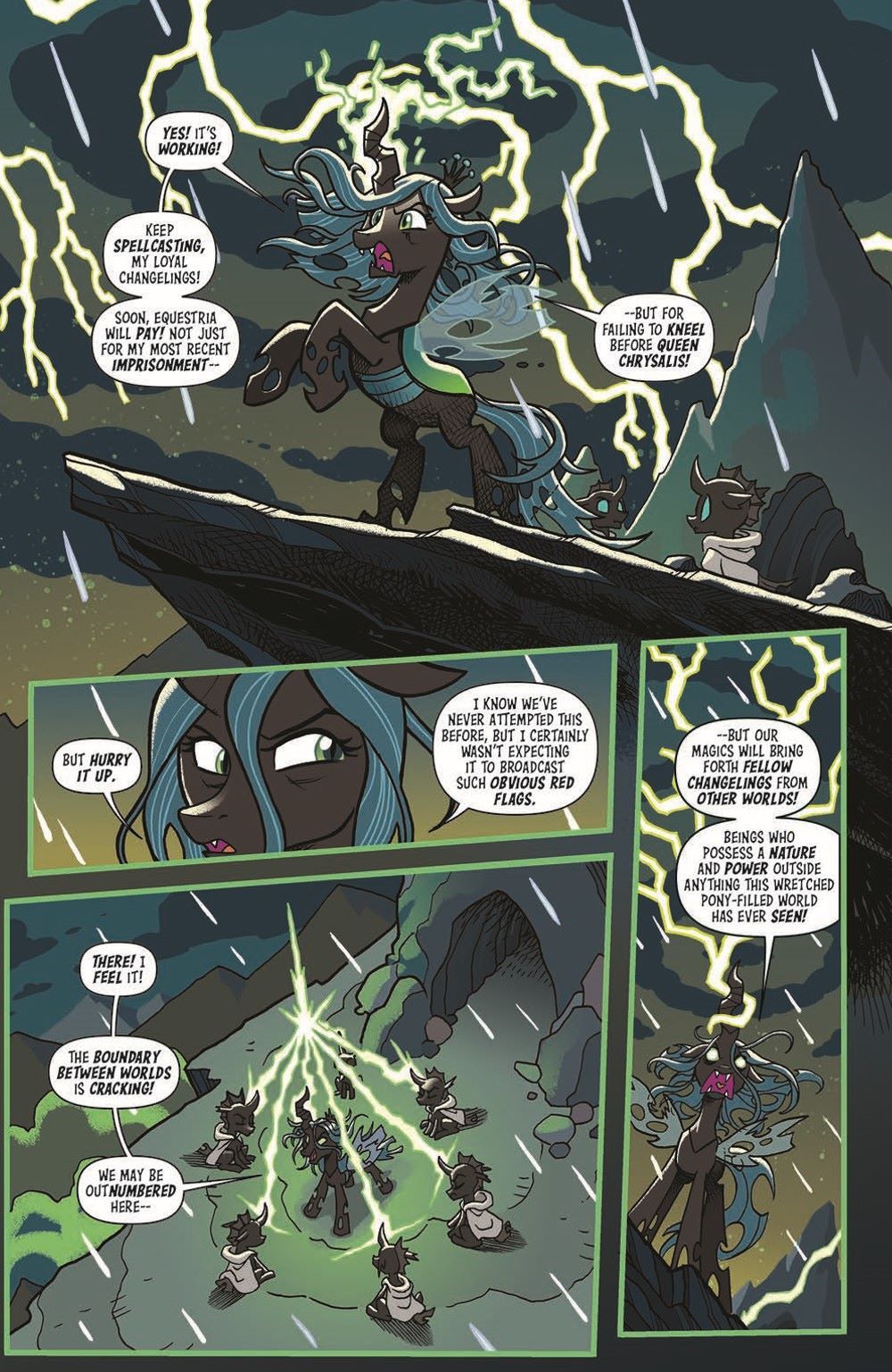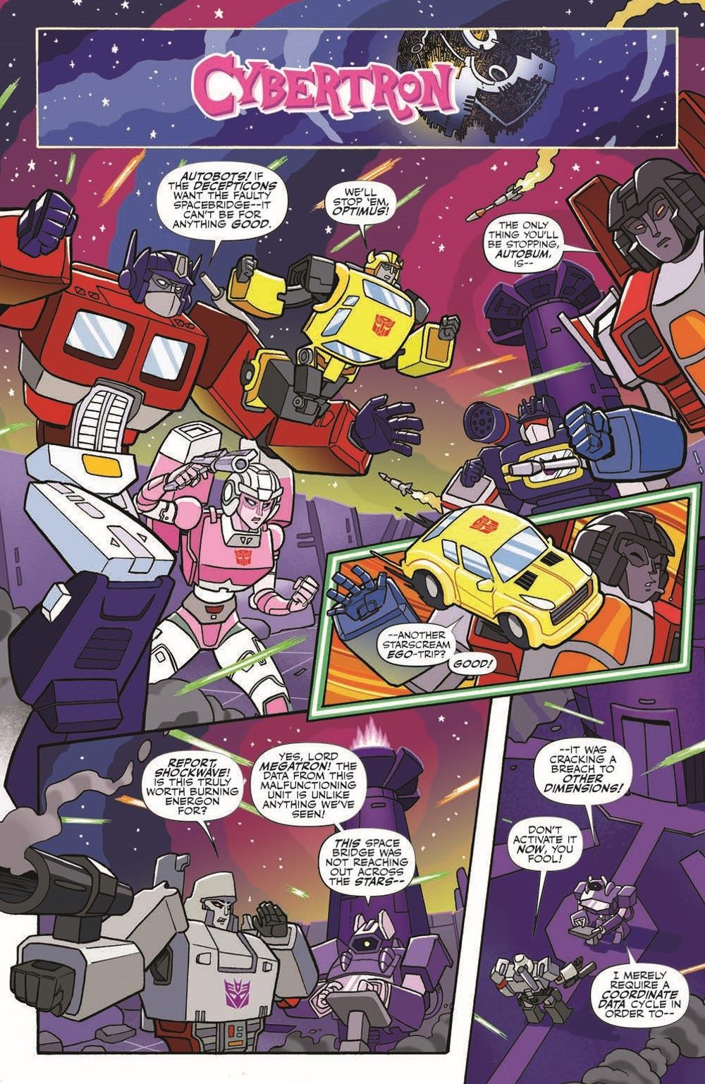 When Queen Chrysalis casts a spell looking for more changelings, she accidentally interferes with a malfunctioning Spacebridge! What's this mean for our favorite fillies? There are suddenly a bunch of Autobots and Decepticons in Equestria! And as the dust settles, Rarity and Arcee find themselves teaming up against a hostile Decepticon force. Plus Spike and Grimlock; Pinkie Pie, Gauge, and Shockwave; Fluttershy, Discord, and Soundwave; Rainbow Dash and Windblade; and Optimus Prime and Twilight Sparkle all team up for more adventures because, in the end, Ponies and Autobots are both fighting for friendship.