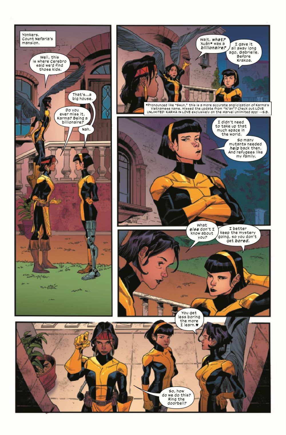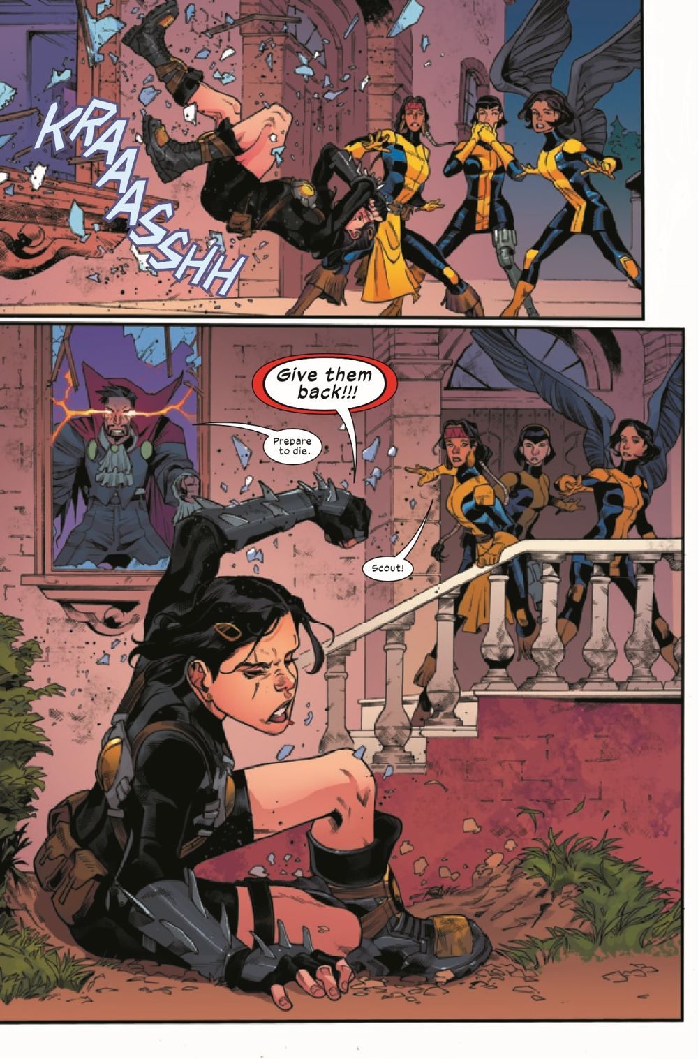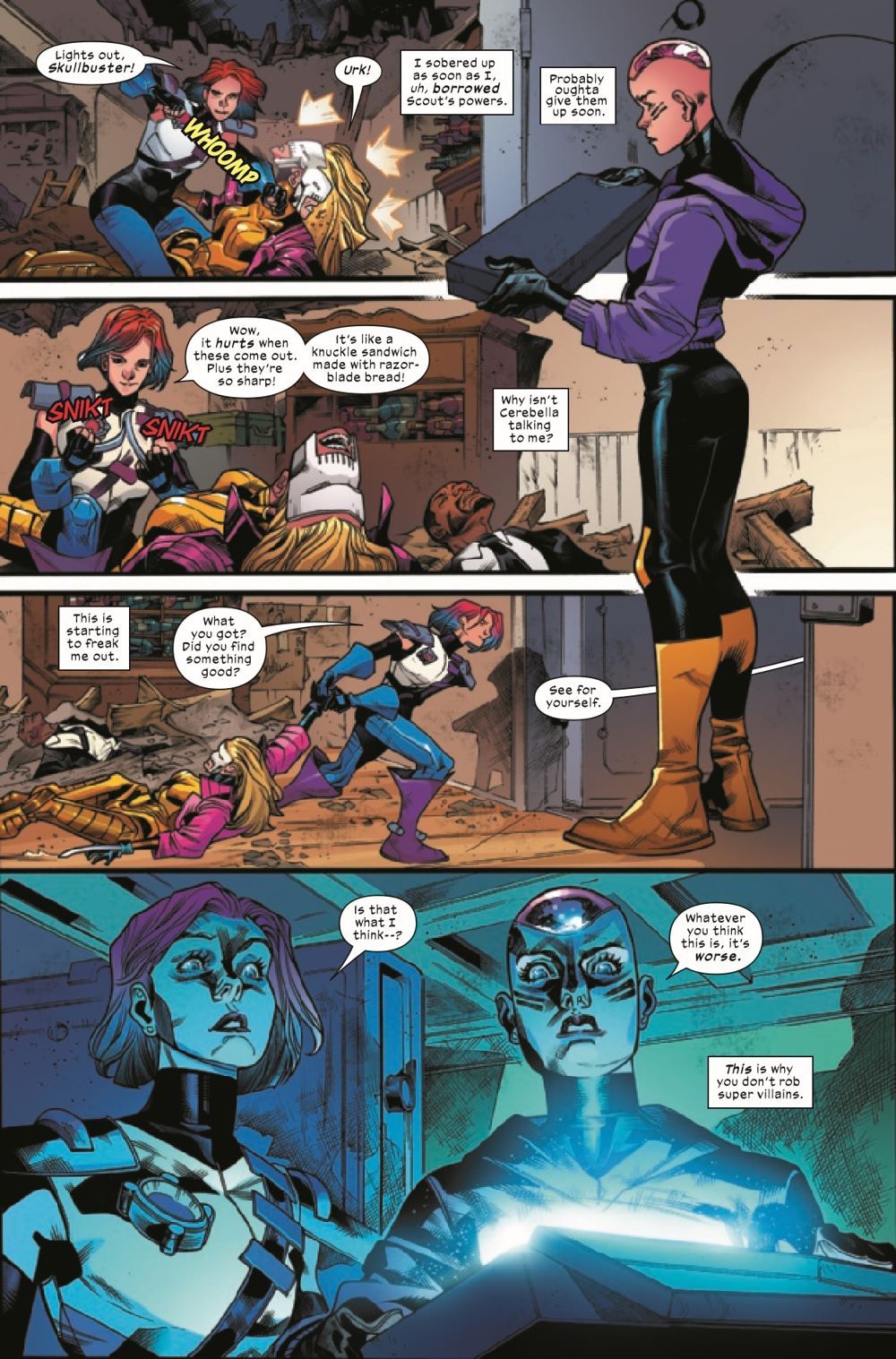 LIFE, DEATH AND CLOWNING AROUND? Dani Moonstar, Karma and Galura end up tracking the young New Mutants down at Count Nefaria's mansion, just to enter a scene of pure mayhem. A throwdown between a depowered Gabby and a murderous Count Nefaria, Cerebella trapped inside the Count's secret vault of treasures and horrors and a drunk Escapade (she'll never touch grappa again!) going blow for blow against Skullbuster - looks like the supposed "covert" heist has turned into a circus. Meanwhile, Wolfsbane and Morgan's beastly encounter turns into a moment of discovery.