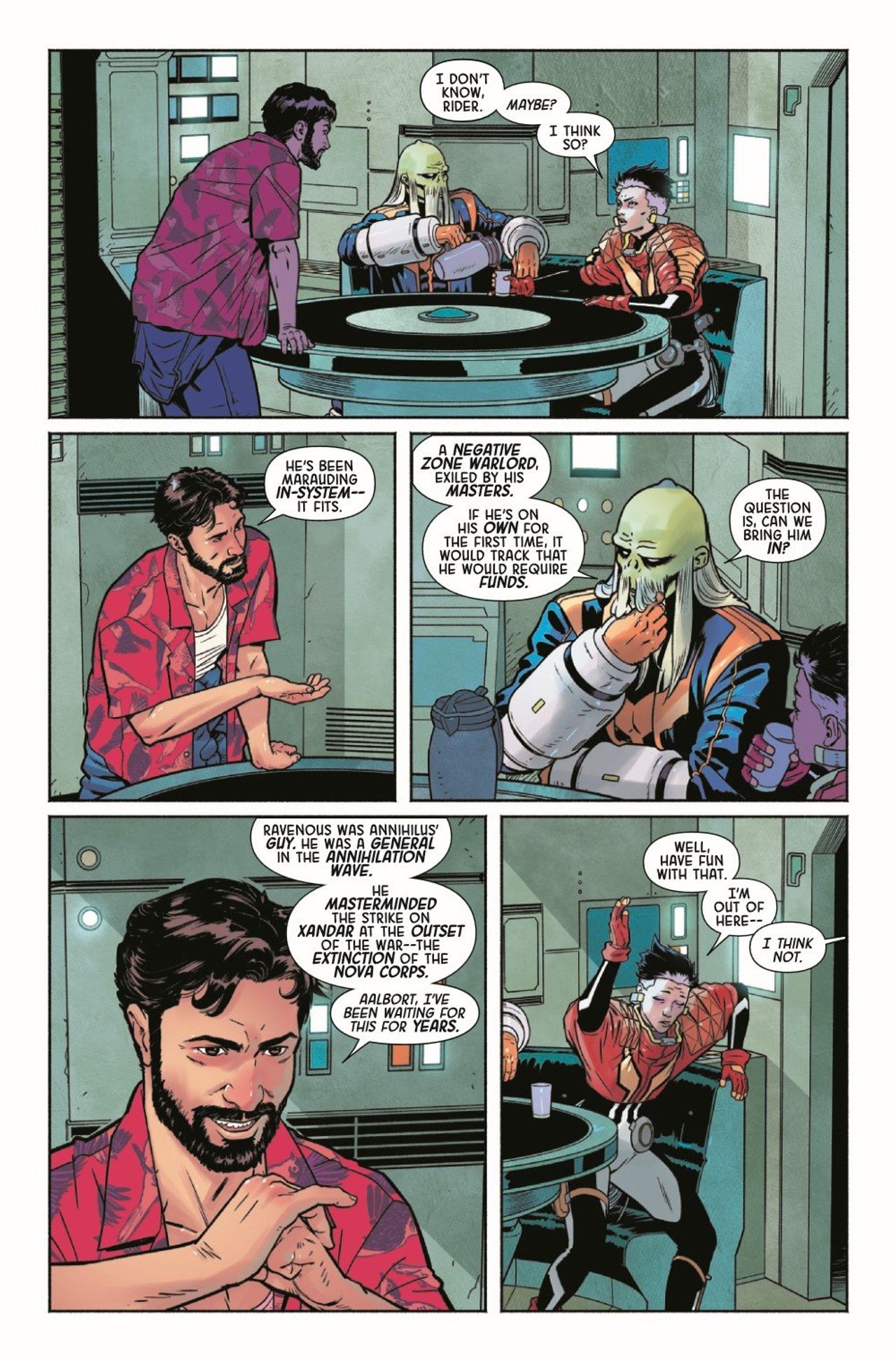 RAVENOUS! Taking a job for the gangsters of the Kree/Skrull War, Nova hunts a mysterium thief. But business becomes personal when the trail leads to an old nemesis, and the opportunity to settle old scores going back to the Annihilation War becomes worth more than any reward. Enter the murderer of untold Nova Corpsmen: Ravenous!