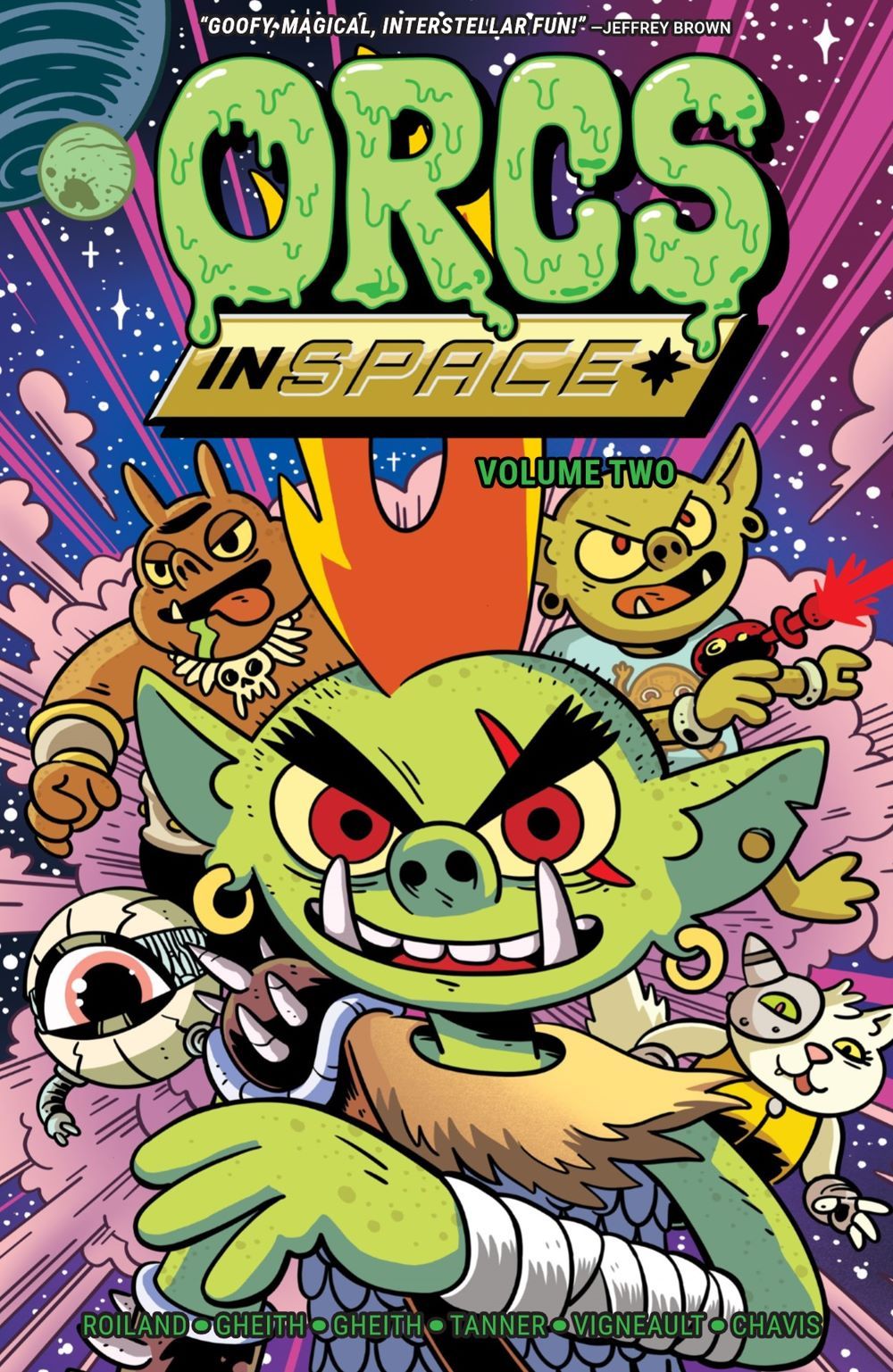 Mayhem ensues! Volume 2 of Justin Roiland's hilarious series Orcs in Space finds Gor, Kravis, and Mongtar making new allies and enemies across the greater Galactigon. With the help of an increasingly sapient D.O.N.A., the orcs face off with an eccentric cyber-scrapper, join forces with a cantankerous cat mechanic, and incur the wrath of a biker gang called the Fuzzballs to discover the truth about D.O.N.A.'s mysterious creator. Will they survive the standoff with evil scientist Dr. Smedley before Starbleep, the Space Rats, and the rest of the orc-hating universe hunt them down?