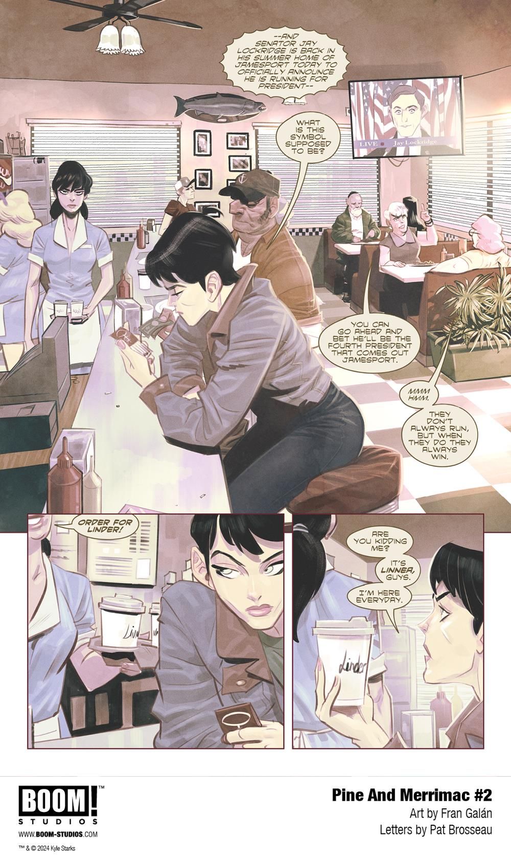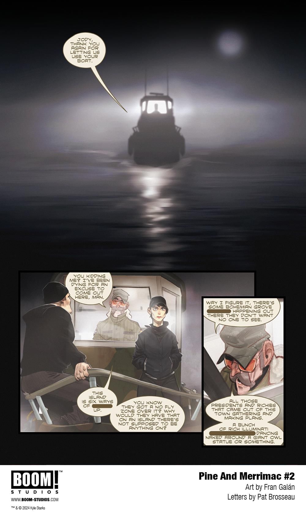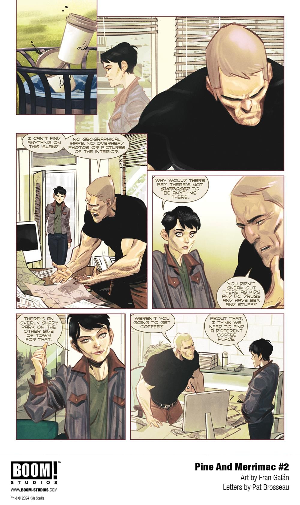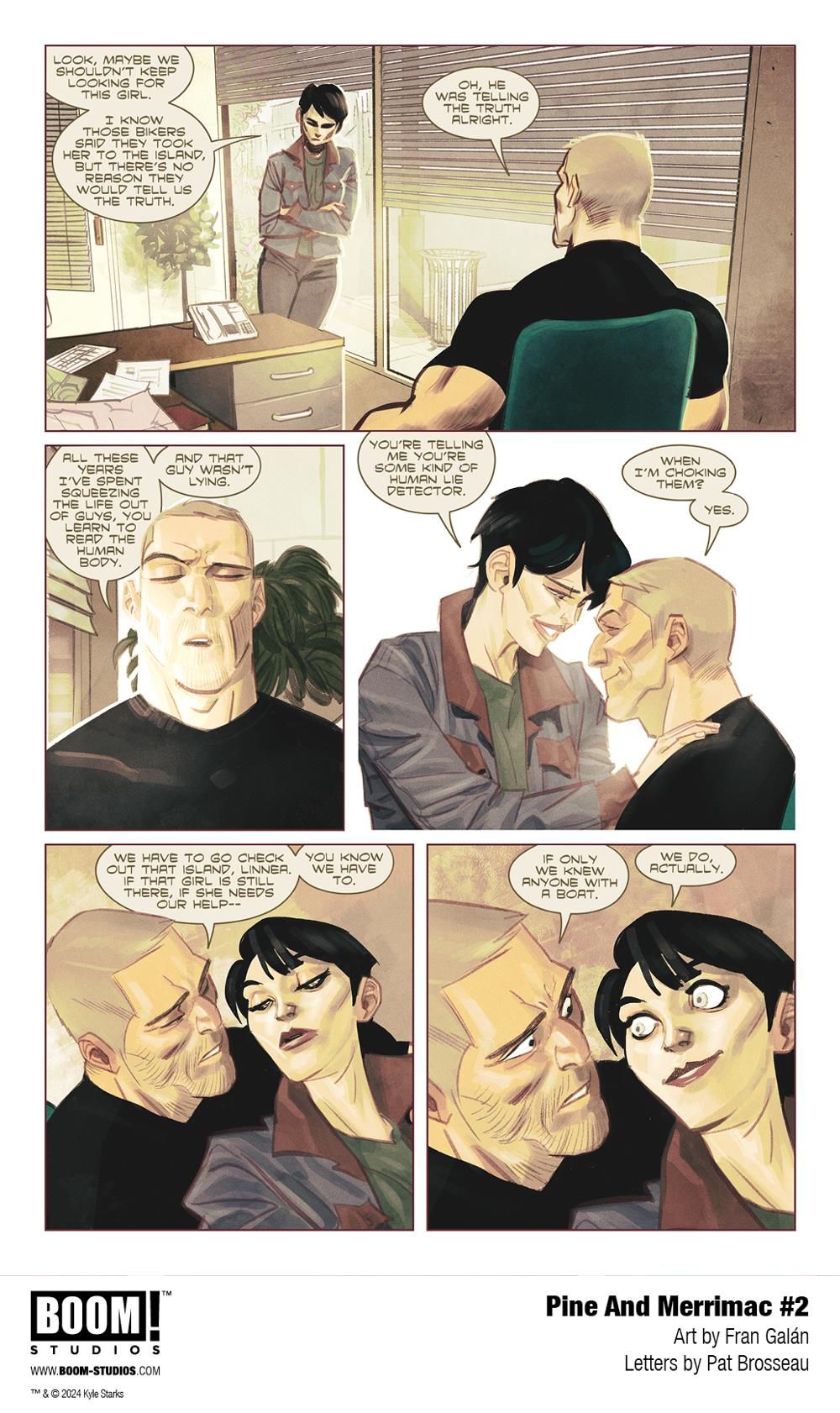 Linnea and Parker are settling into their new lives as small town detectives, but dark omens are forming on the horizon of this sleepy nook of the world. Their most promising lead unexpectedly evaporates, forcing the duo to embark on an ill-advised, undercover trip to Senator Island, where they discover a new clue to a mystery that's bigger than anything they could have imagined. Just what have they gotten themselves into? Eisner-nominated scribe Kyle Starks (I Hate This Place, Creepshow) and Dragon Award-winning artist Fran Galán (The Amazing Spider-Man, Dune: House Harkonnen) dive deeper into the enigma that lies at the center of Pine and Merrimac…